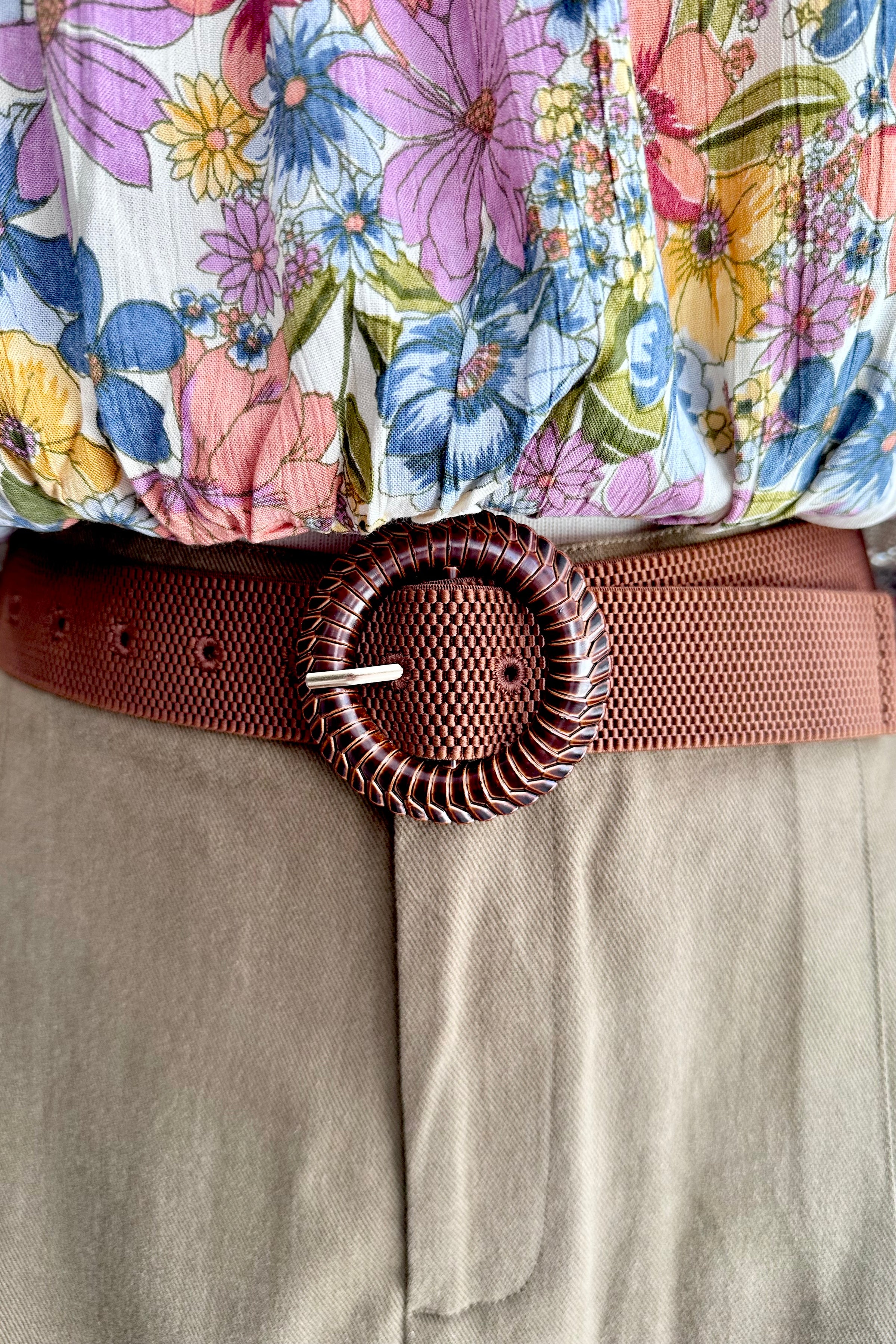 Stretch belt in brown. The center has a round brown buckle. Adjustable.