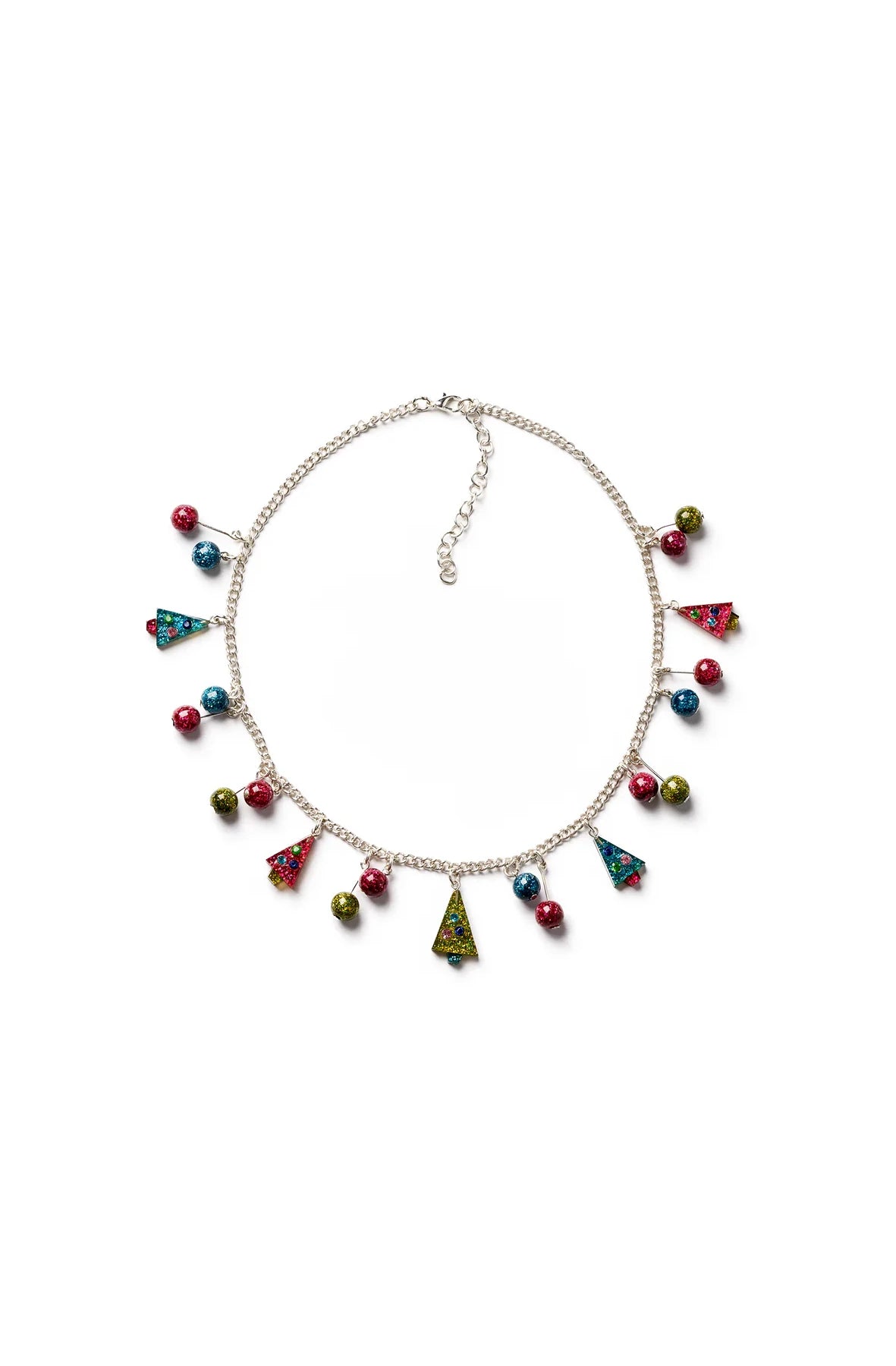 Decorate your neckline with the Decked Out Necklace — a festive favourite with glittery trees in teal, pink and lime, all dangling from a sheeny chain of colourful beads.