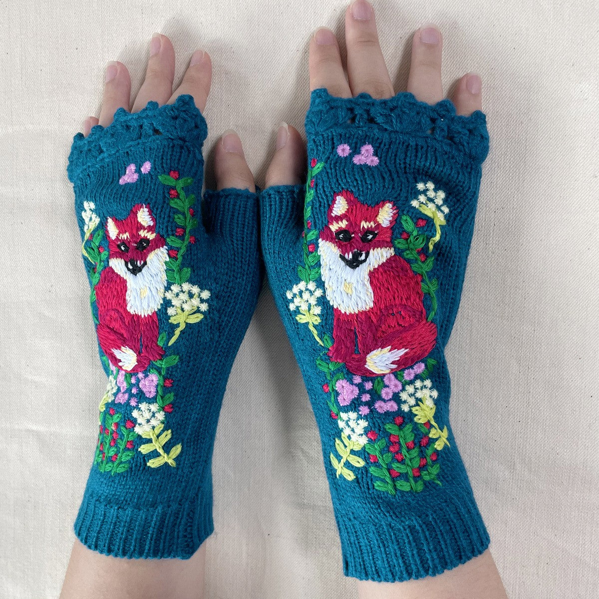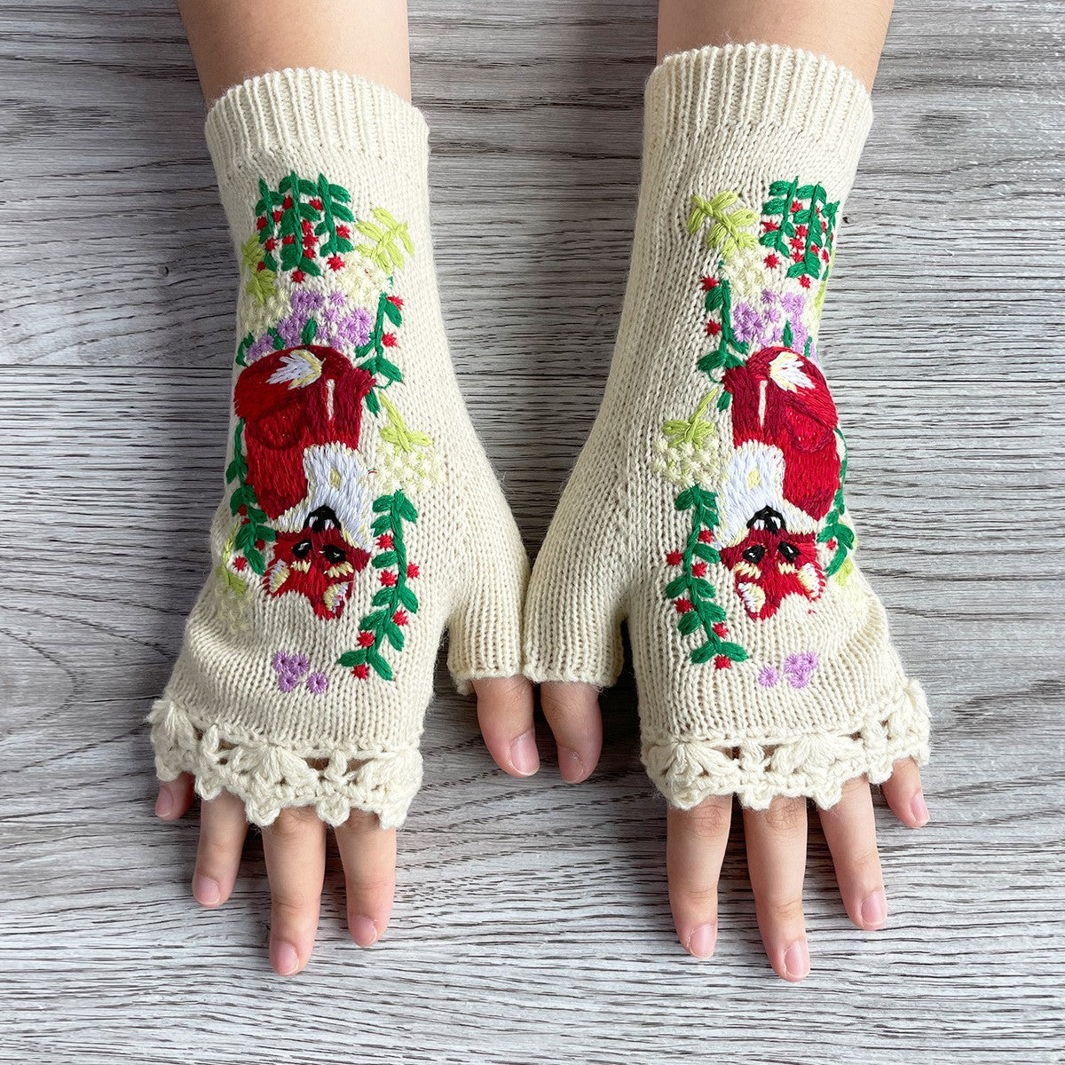 Adorable fingerless gloves with an embroidered fox and flowers on the front.