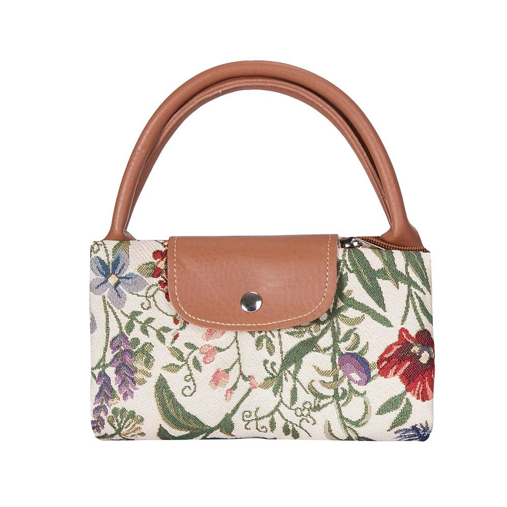 Ivory tapestry bag with a floral pattern.