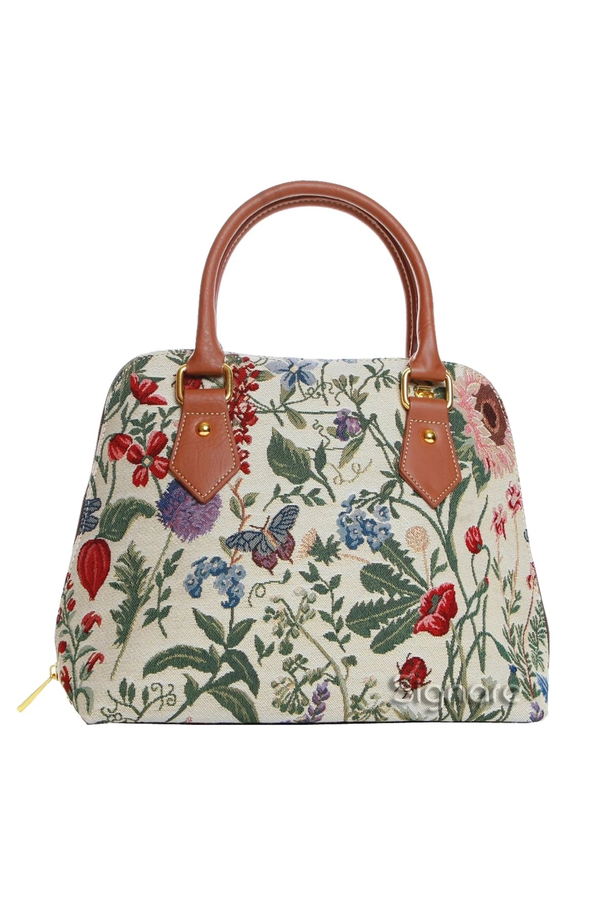 Tapestry bag in ivory with a floral garden and butterfly print.