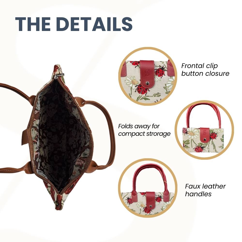 Compact and eco-friendly, portable shopping bag. This tapestry collapsible grocery bag piece opens up to provide ample space for your shopping trips and folds away for easy storage in your handbag