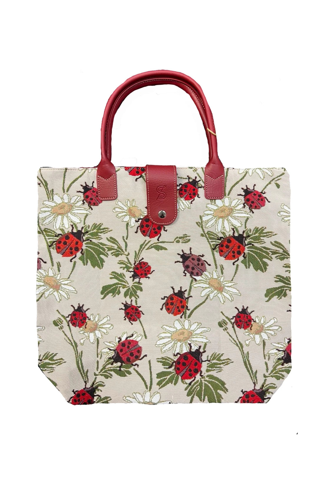 Ivory tapestry bag with a lady bug and daisy pattern.