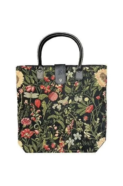 Black tapestry tote with a print of flowers.