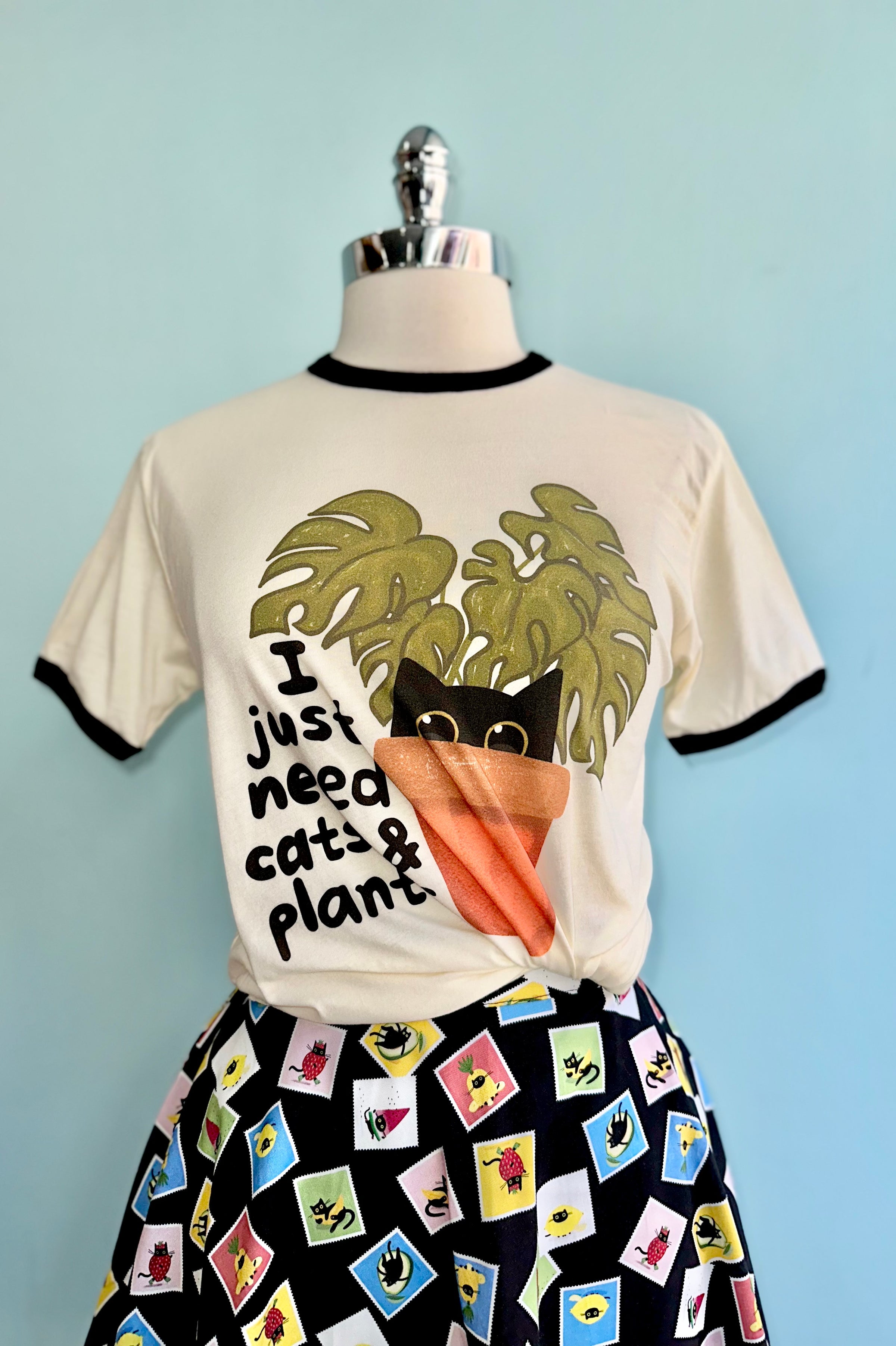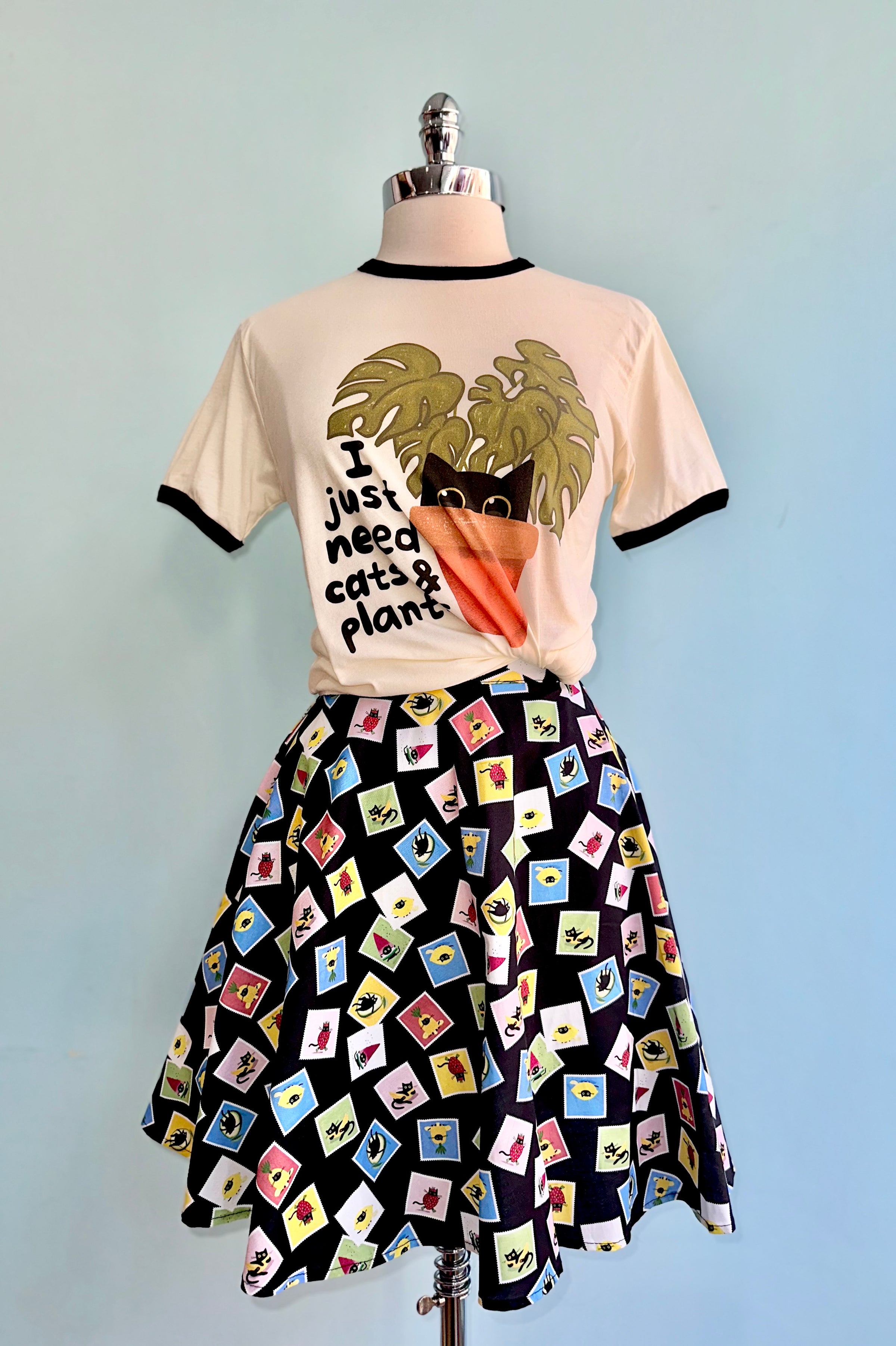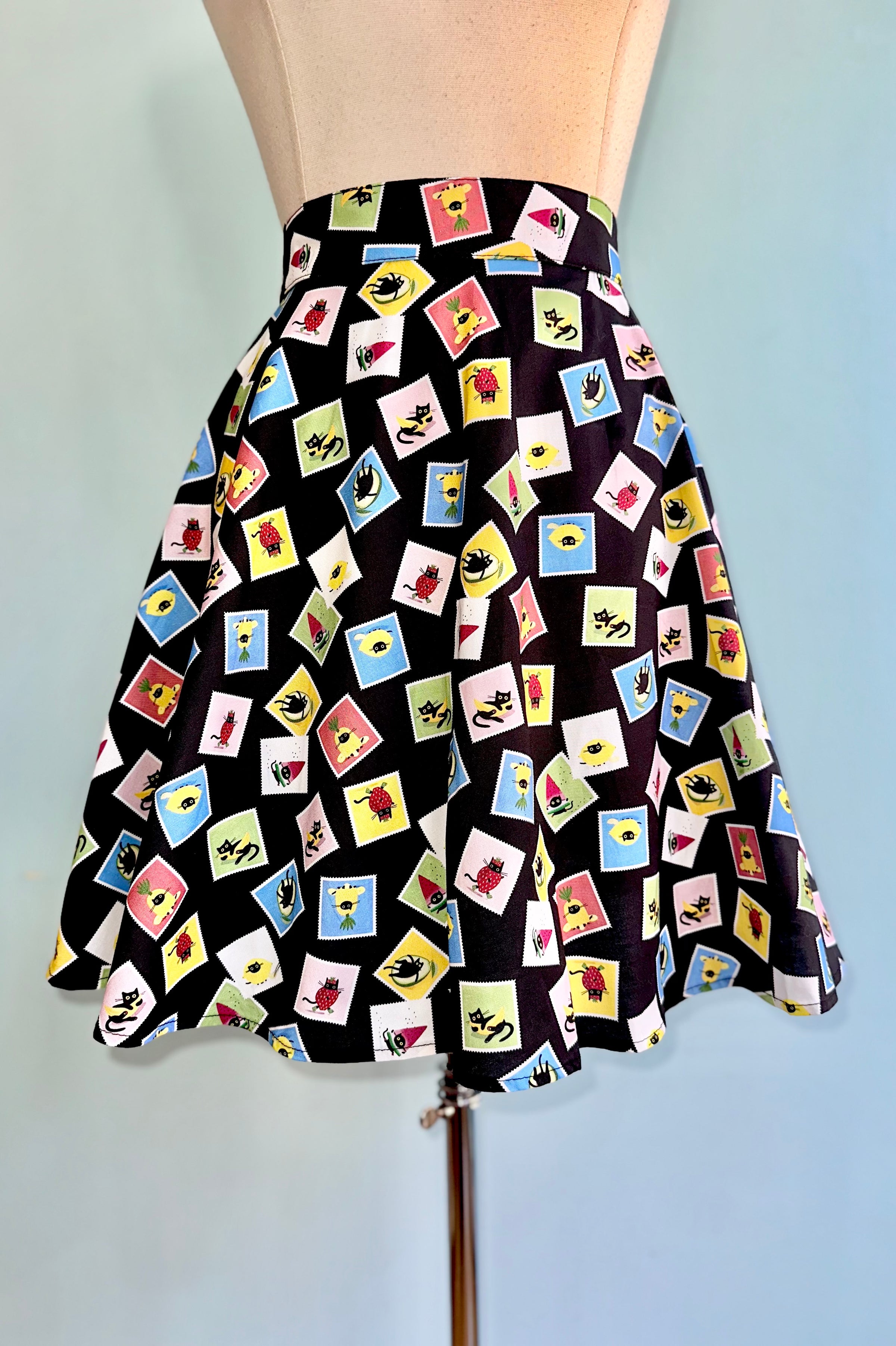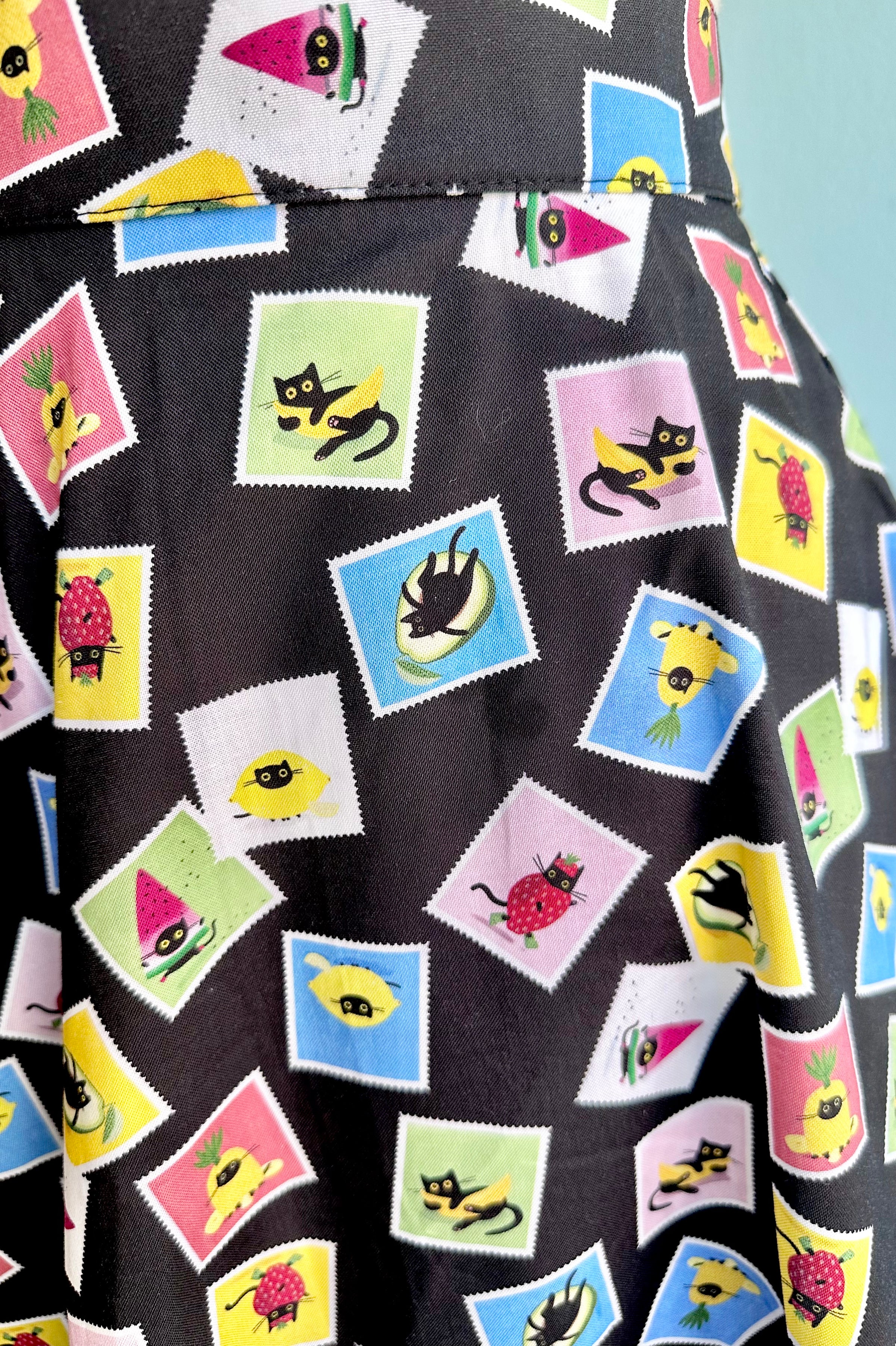 Skater skirt in black with a print of stamps featuring silly black kitties in fruit. This skirt features an elasticized back waist for ease of wear and a back zippered closure.
