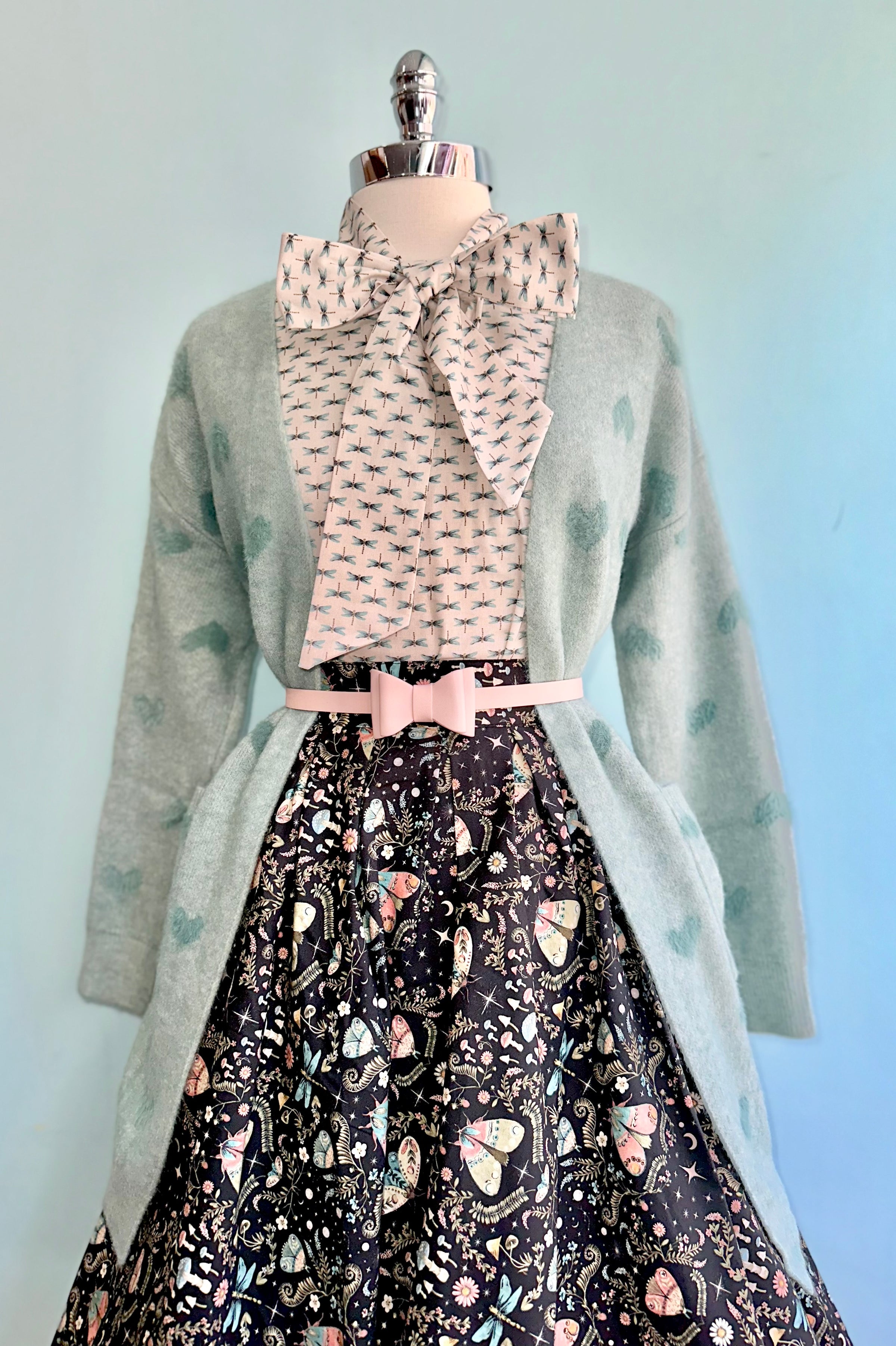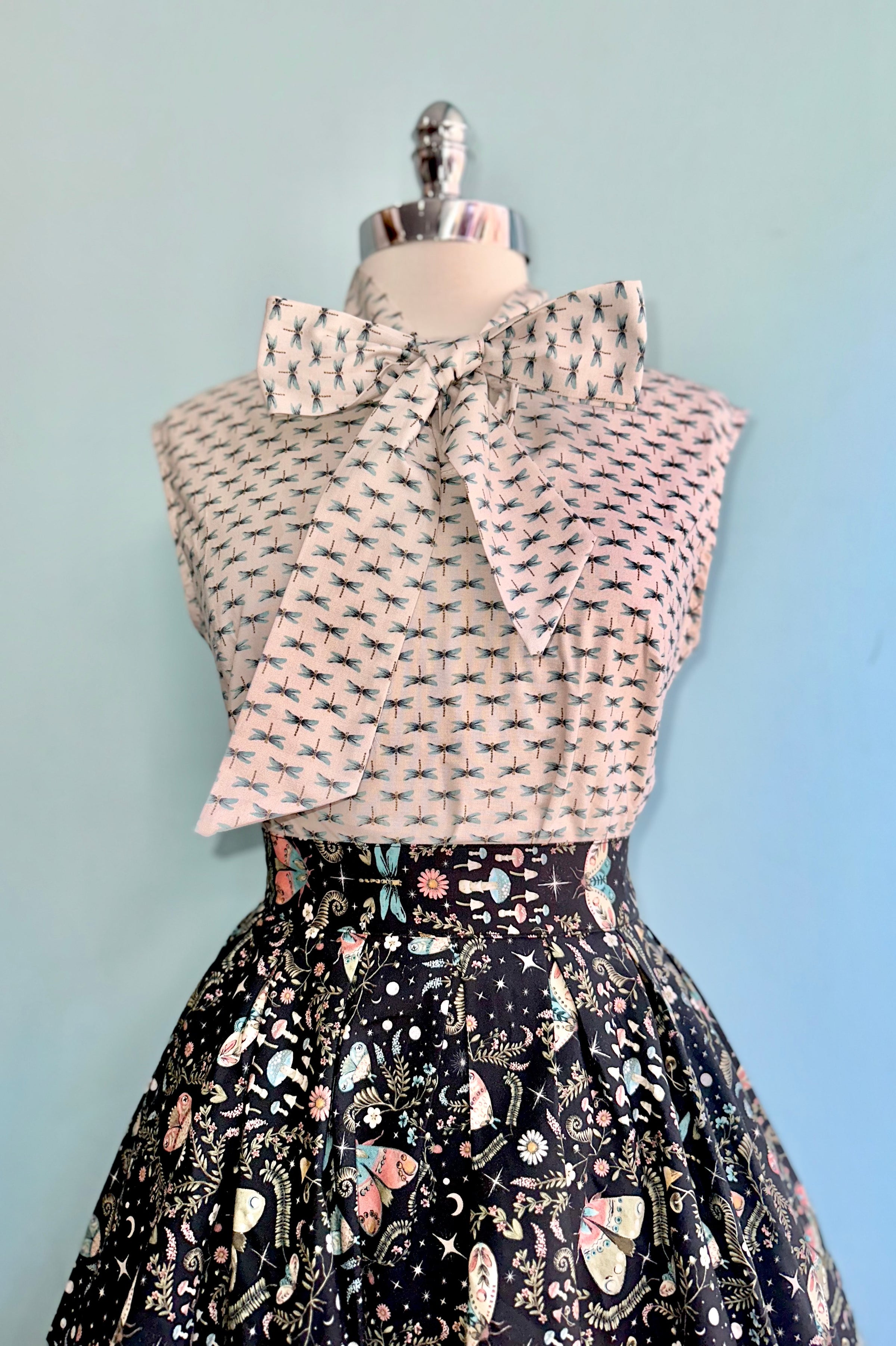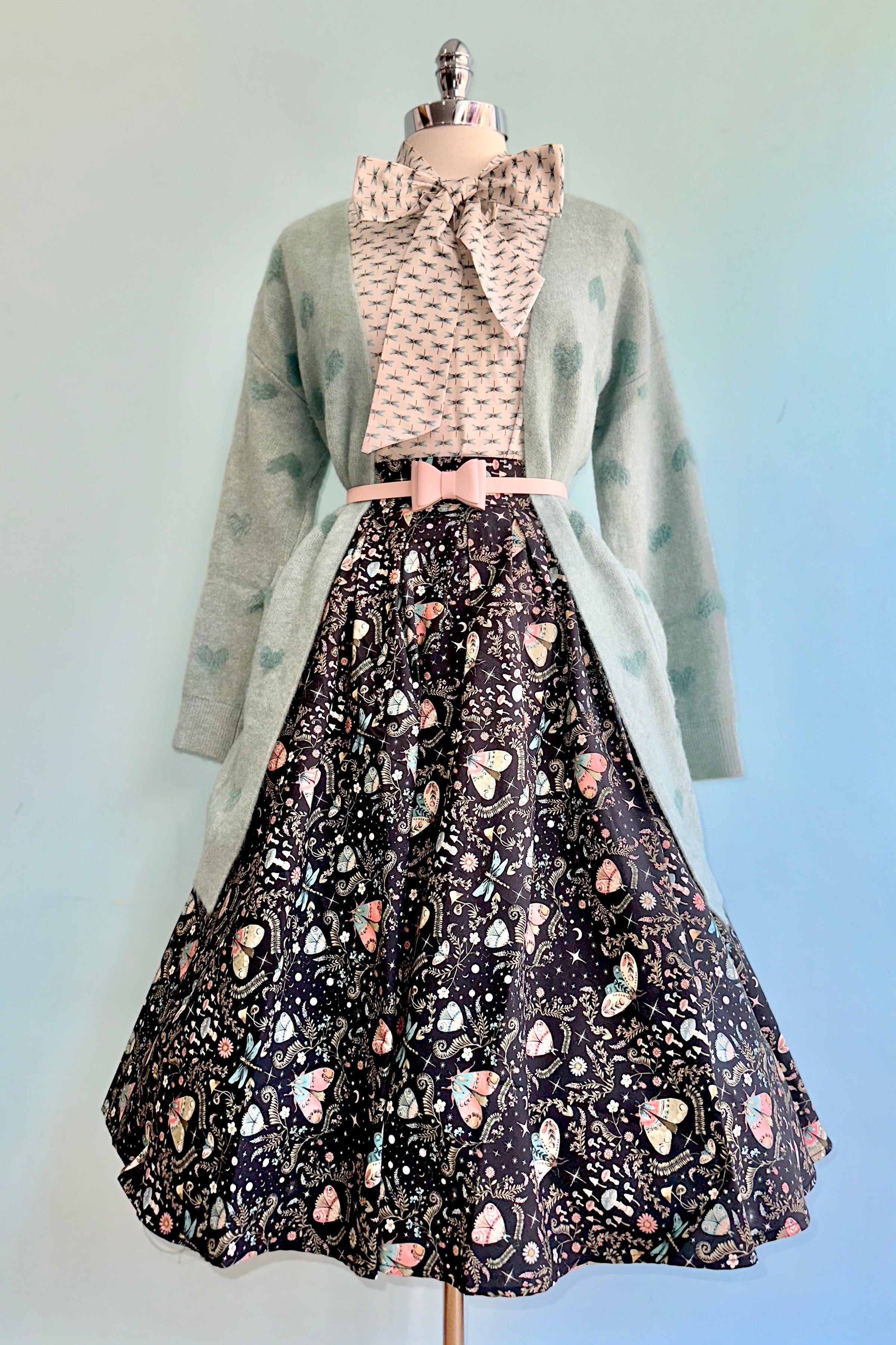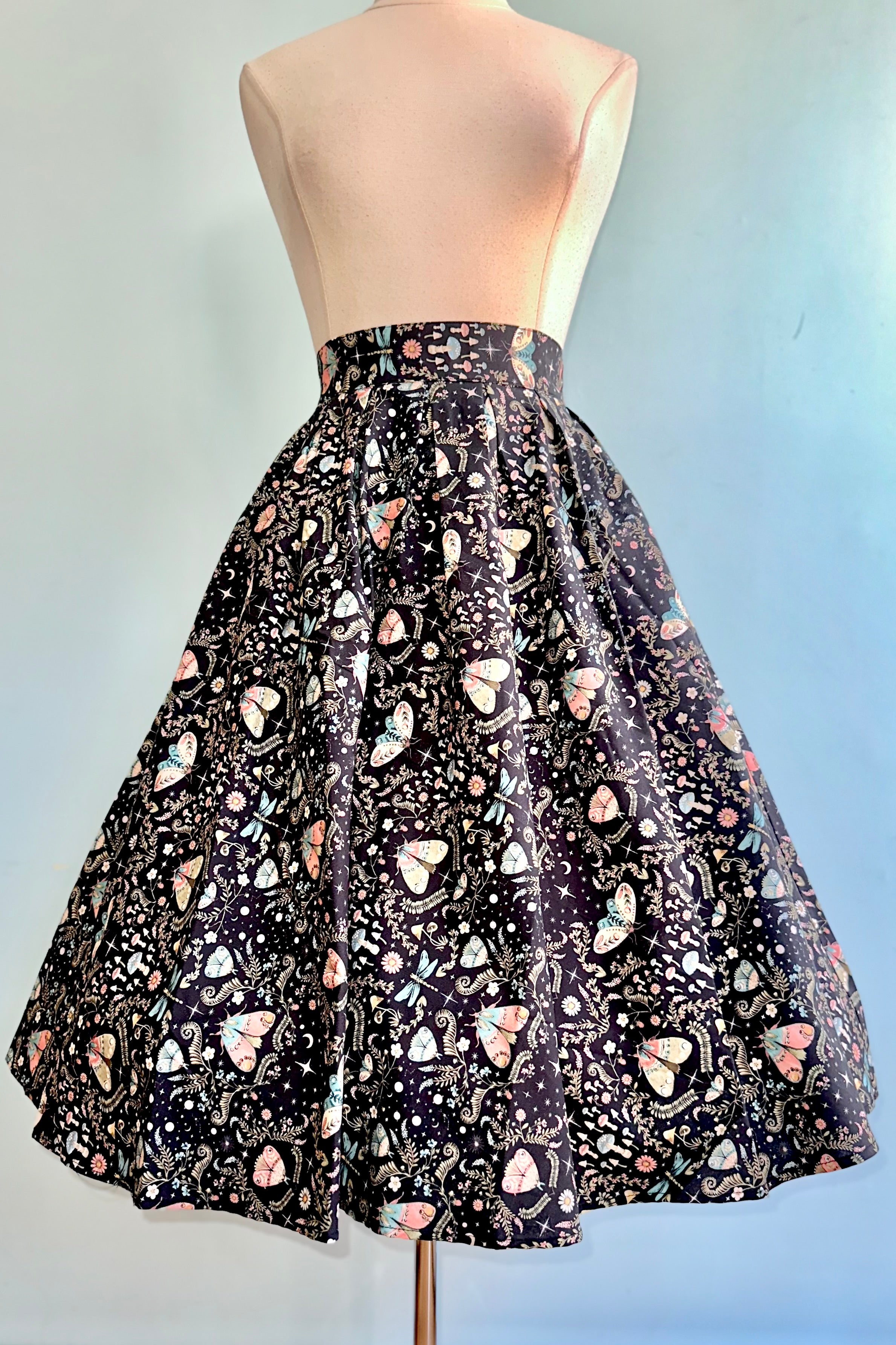 Black skirt with a print of moths and mushrooms in sage, turquoise and pink. This skirt is 100% cotton and has an elasticized back waistband for ease of wear! Doris has a full pleated skirt with hidden side pockets, and a back zippered closure. Doris is made in a longer length so she can accentuate all your vintage-inspired outfits!