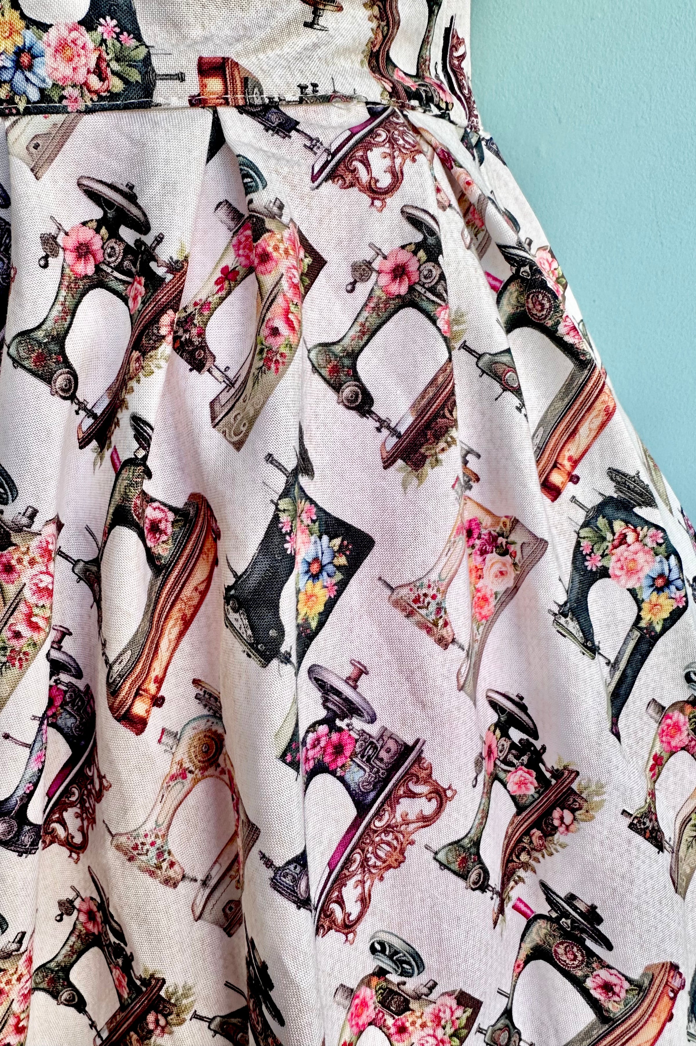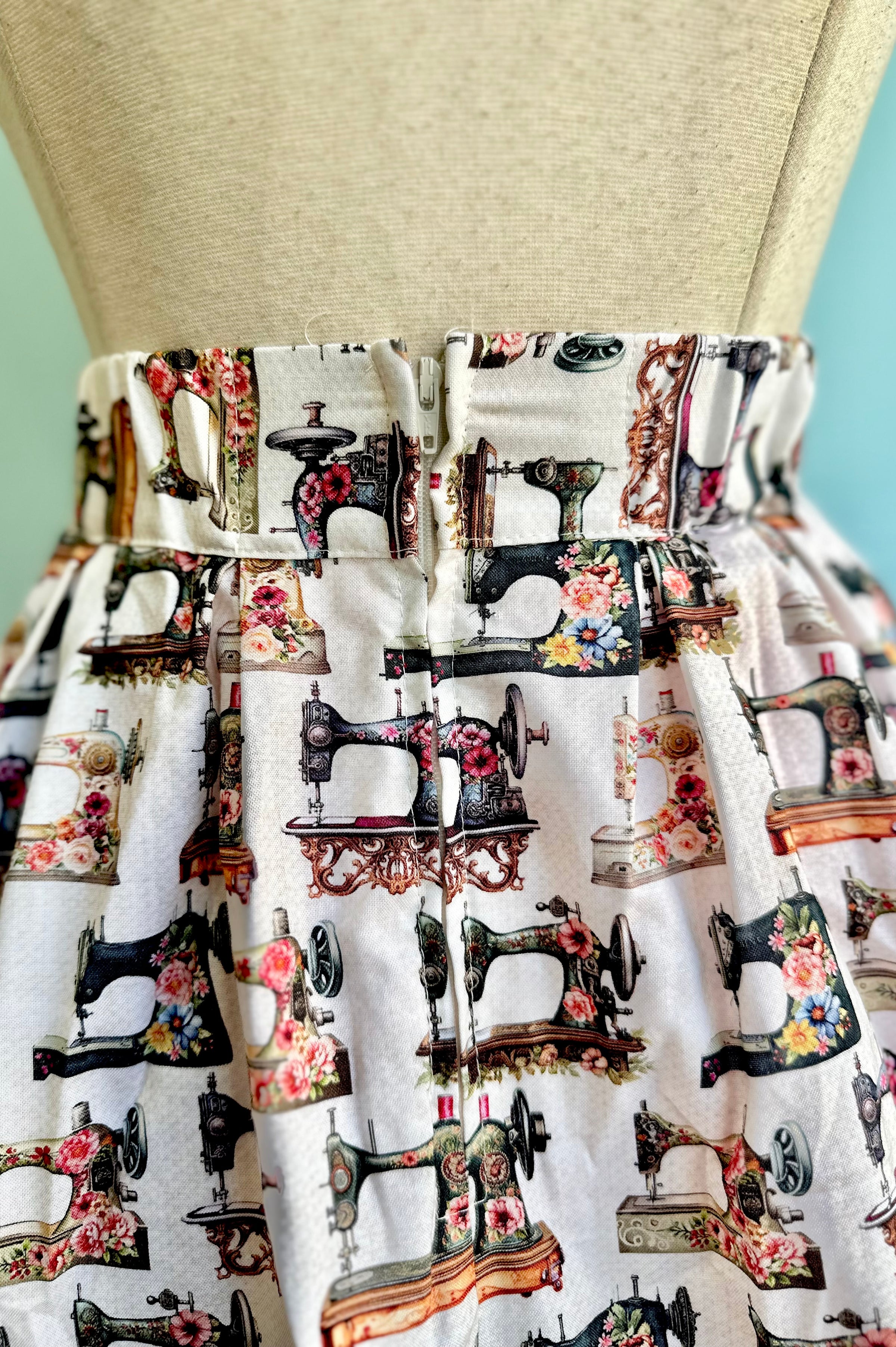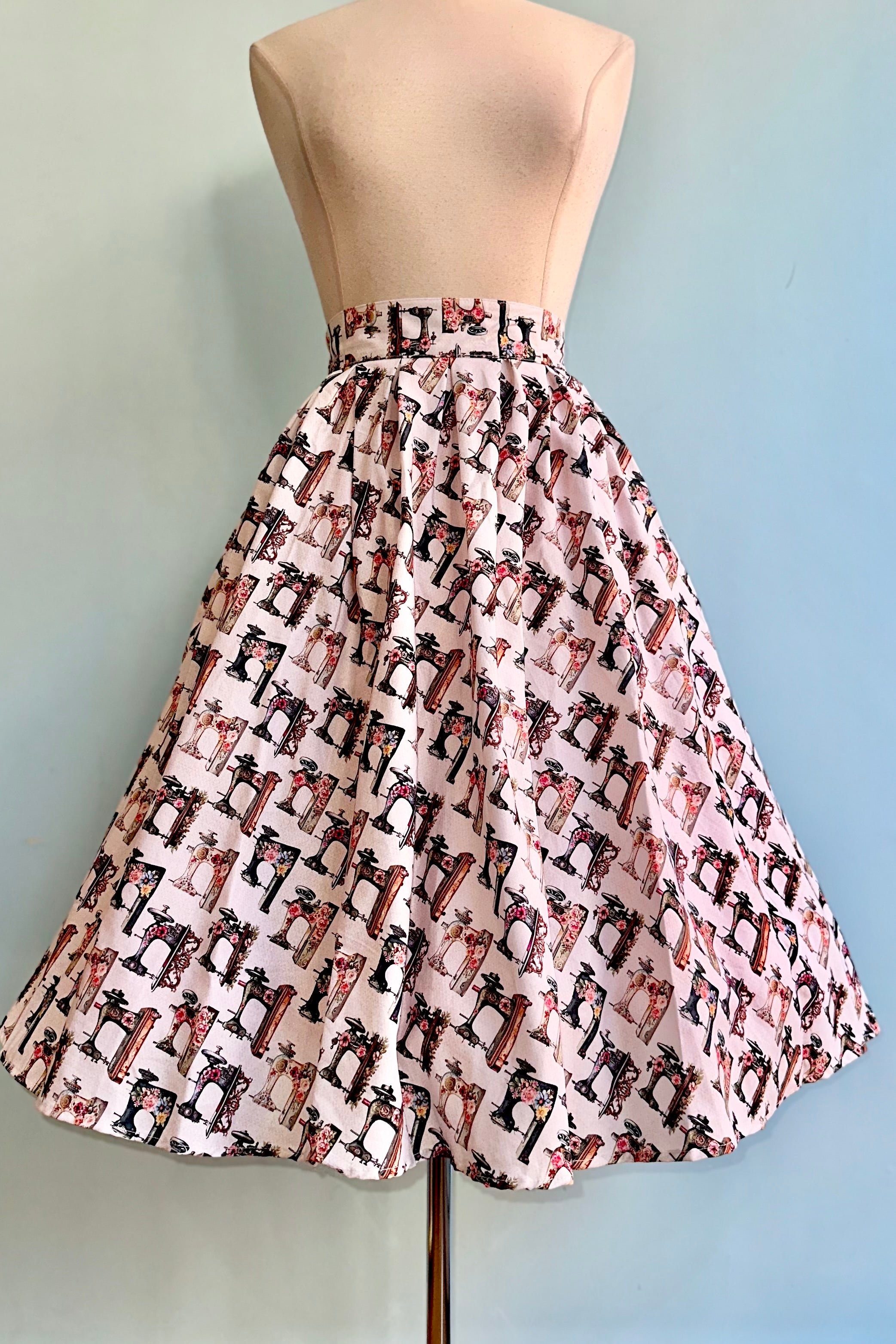 Full skirt in off white and tan with a print of floral vintage sewing machines. This skirt is 100% cotton and has an elasticized back waistband for ease of wear! Doris has a full pleated skirt with hidden side pockets, and a back zippered closure. Doris is made in a longer length so she can accentuate all your vintage-inspired outfits!