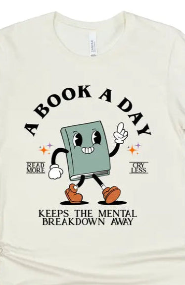 An off white t-shirt featuring an adorable walking book with the words, "A book a day keeps the mental breakdown away." This design is a perfect gift for book lovers. The tee is crafted from soft, breathable cotton for all-day comfort.