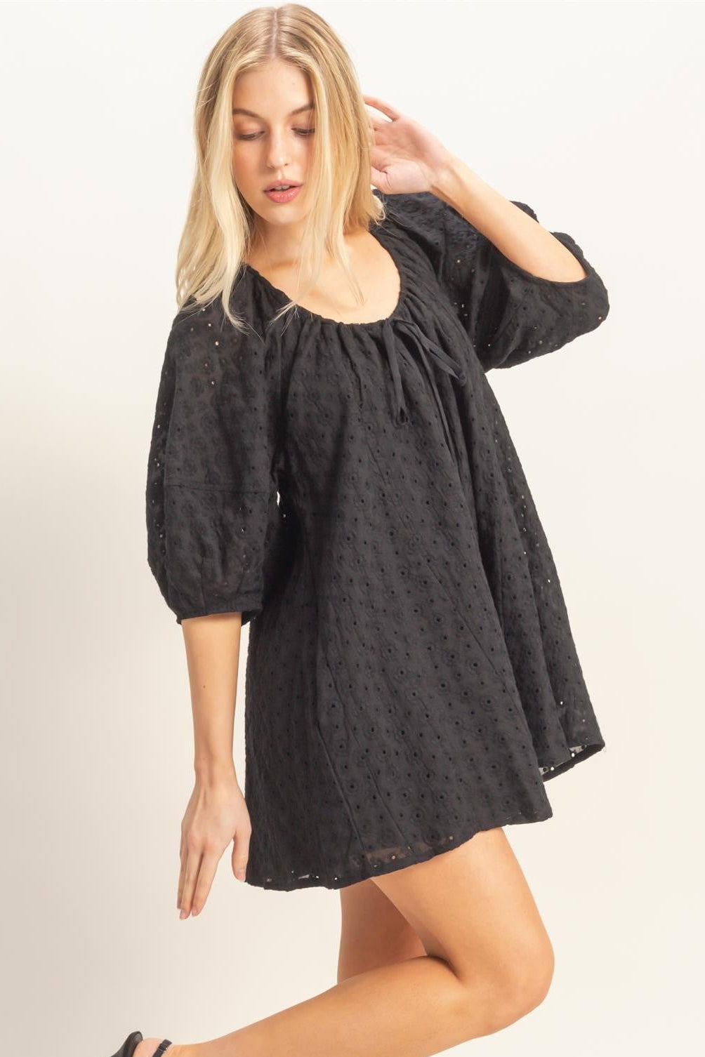 This eyelet baby doll romper features a scoop neckline and puff sleeves with a flowy silhouette. The back has a keyhole fastener and is fully lined.  The fit is loose and there are side pockets!