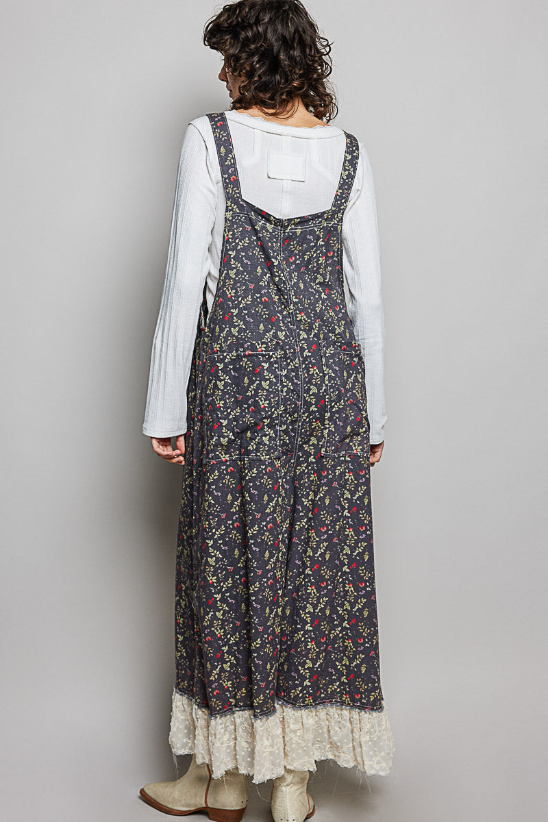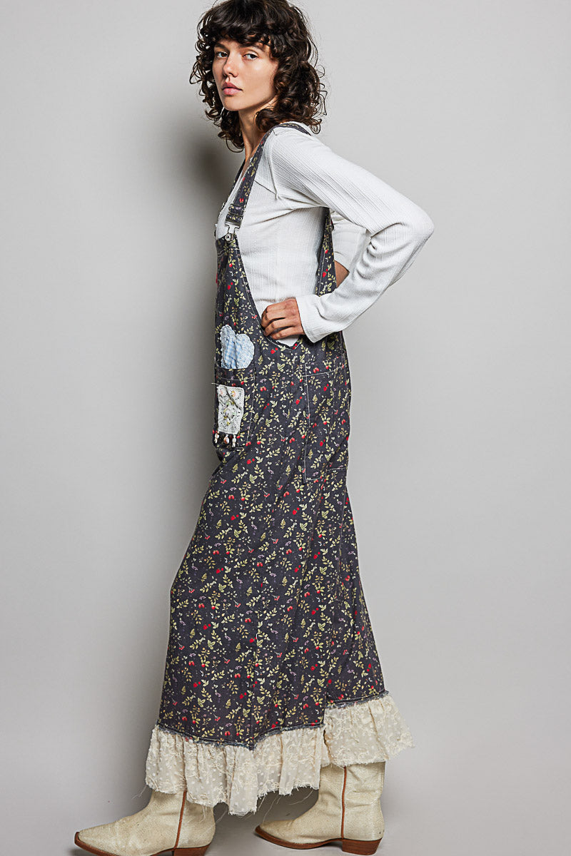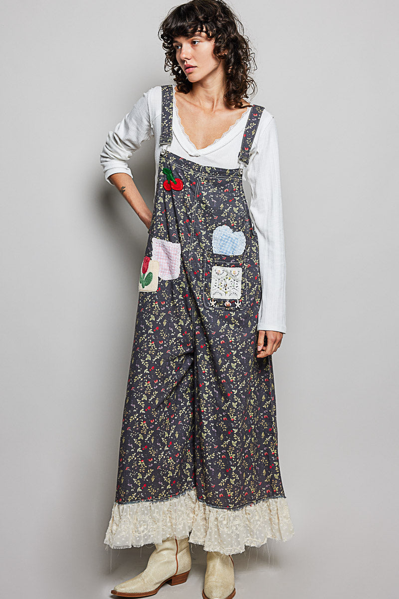 Soft overalls in black with a red floral and with mixed patch pockets and bead details.  The hem is a embroidered ivory chiffon ruffle.  These overalls have an adjustable strap and have a loose fit.