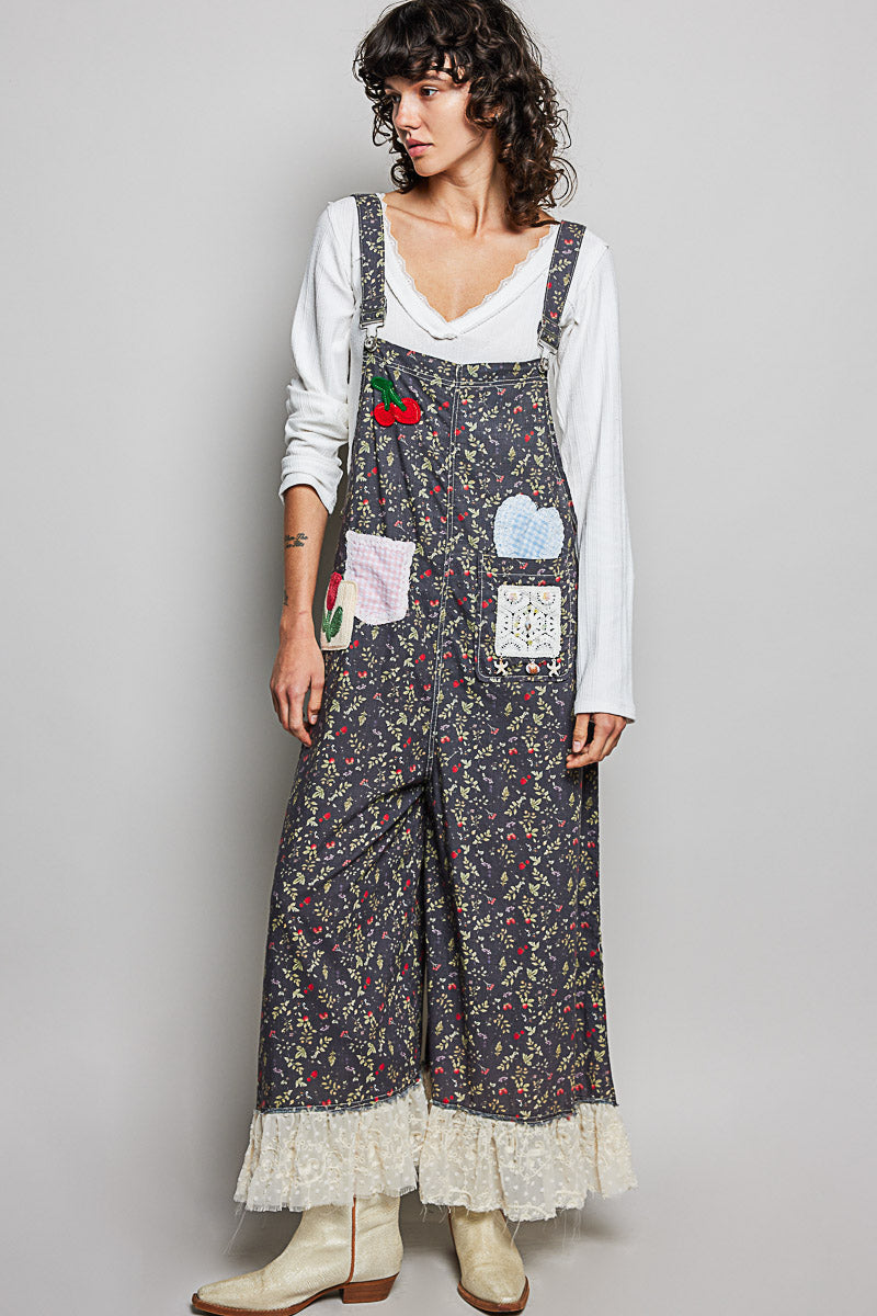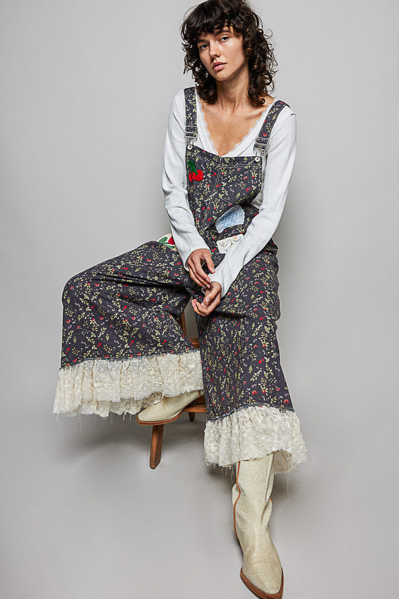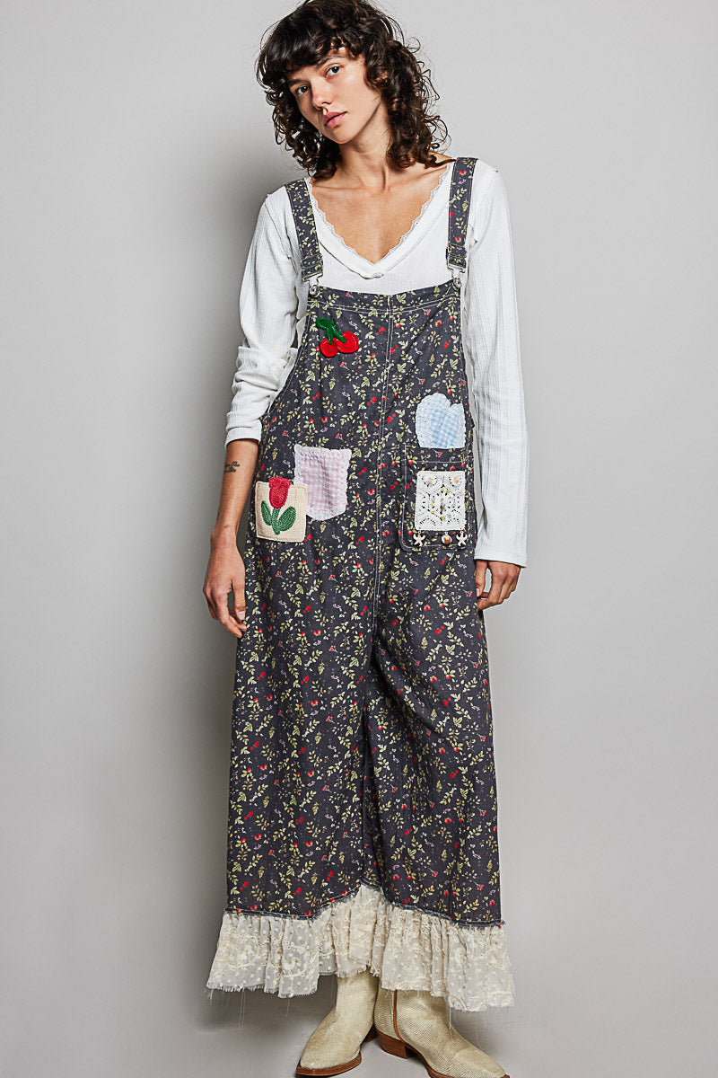 Black Floral Patch and Lace Detail Overalls by POL Clothing