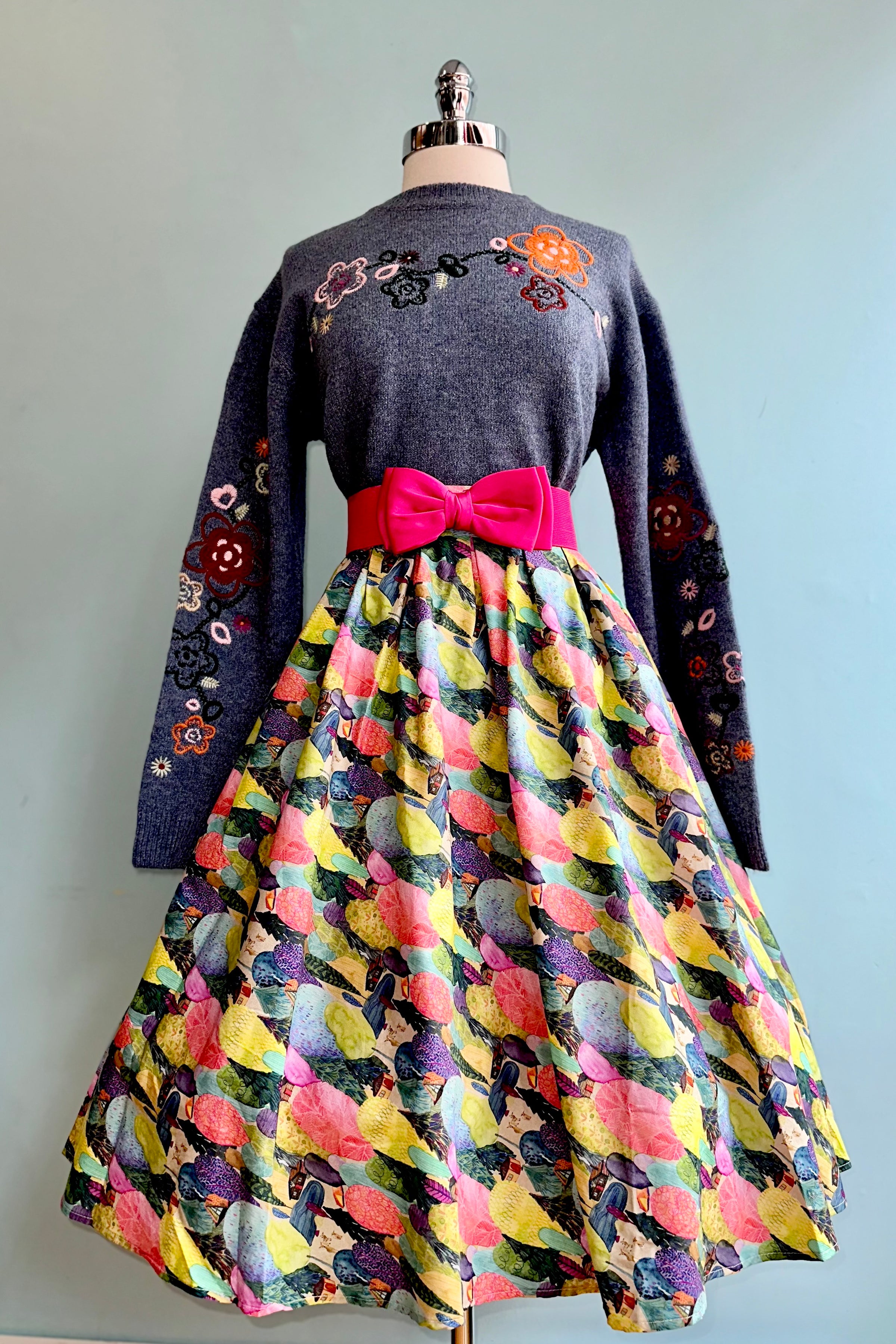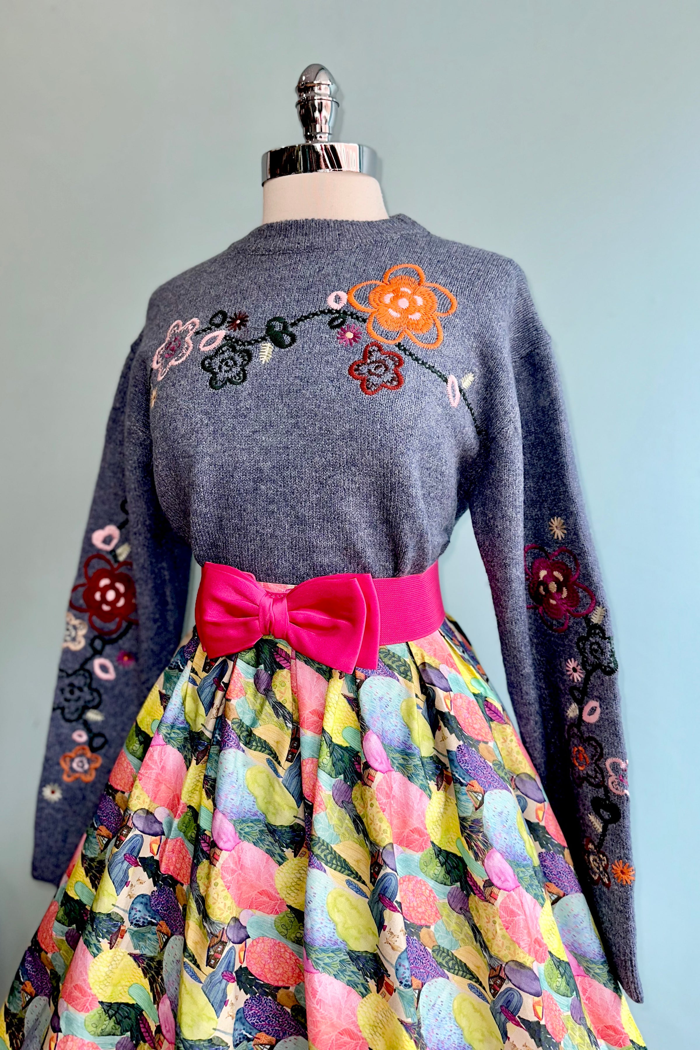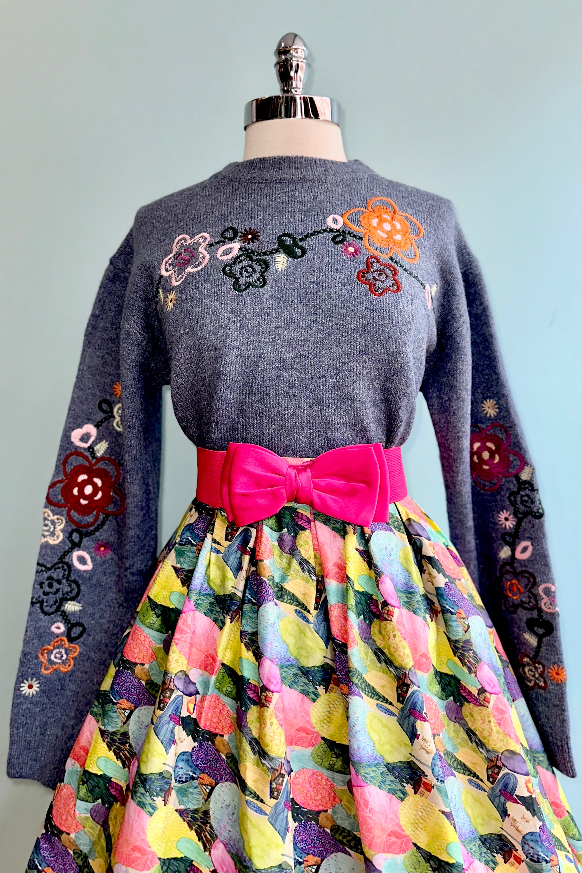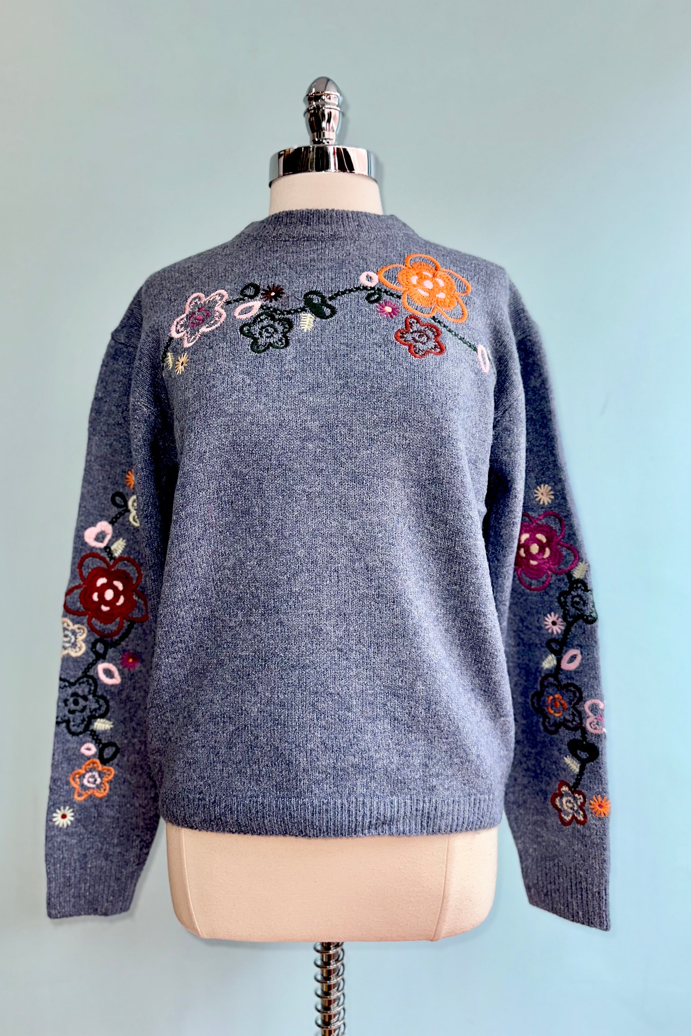 Pullover sweater in blue with floral embroidery on the bodice, yoke, and sleeves. This sweater has a ribbed round neck and drop shoulder with long sleeves. This sweater is a pullover crewneck style with a loose fit.