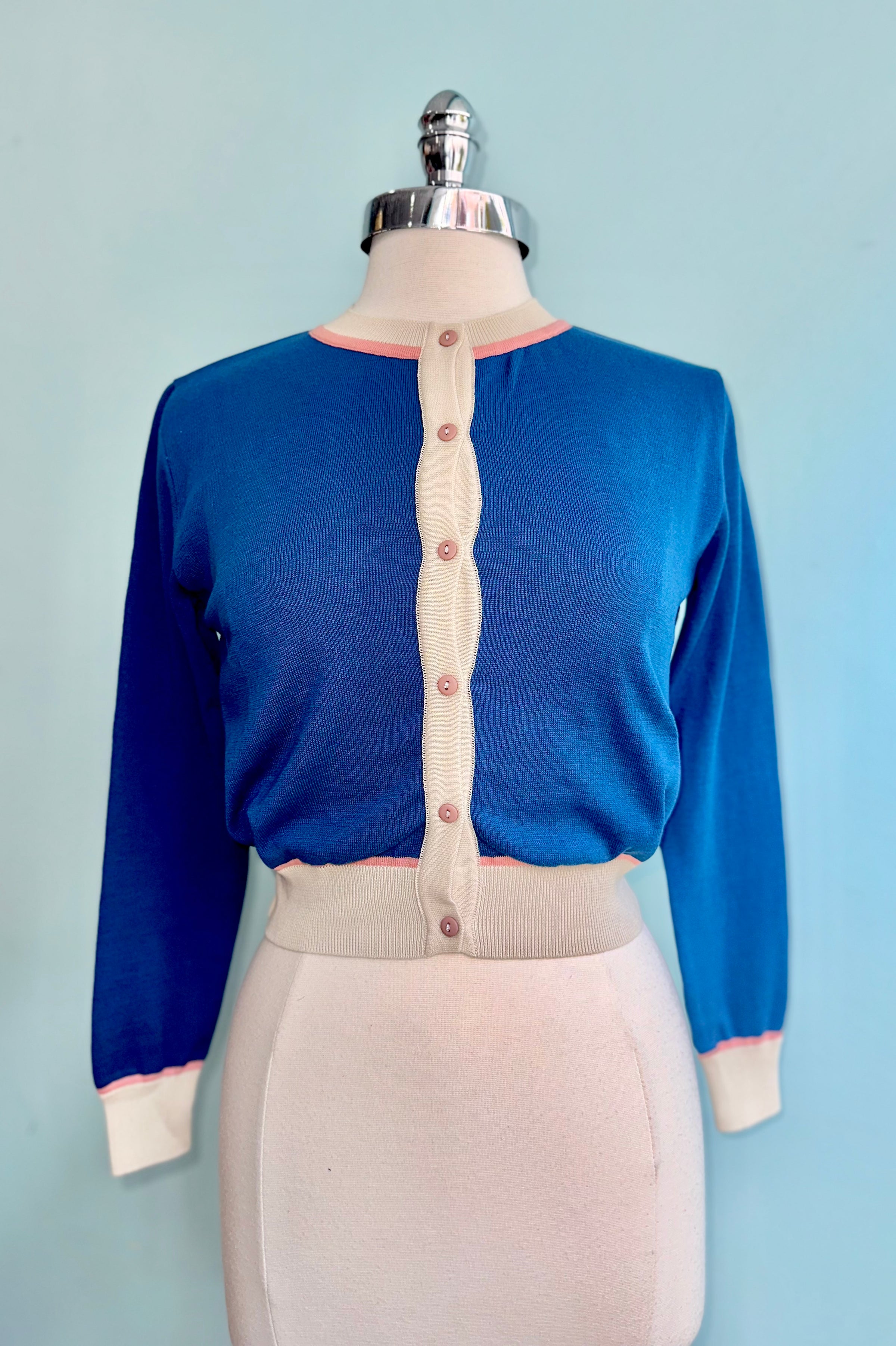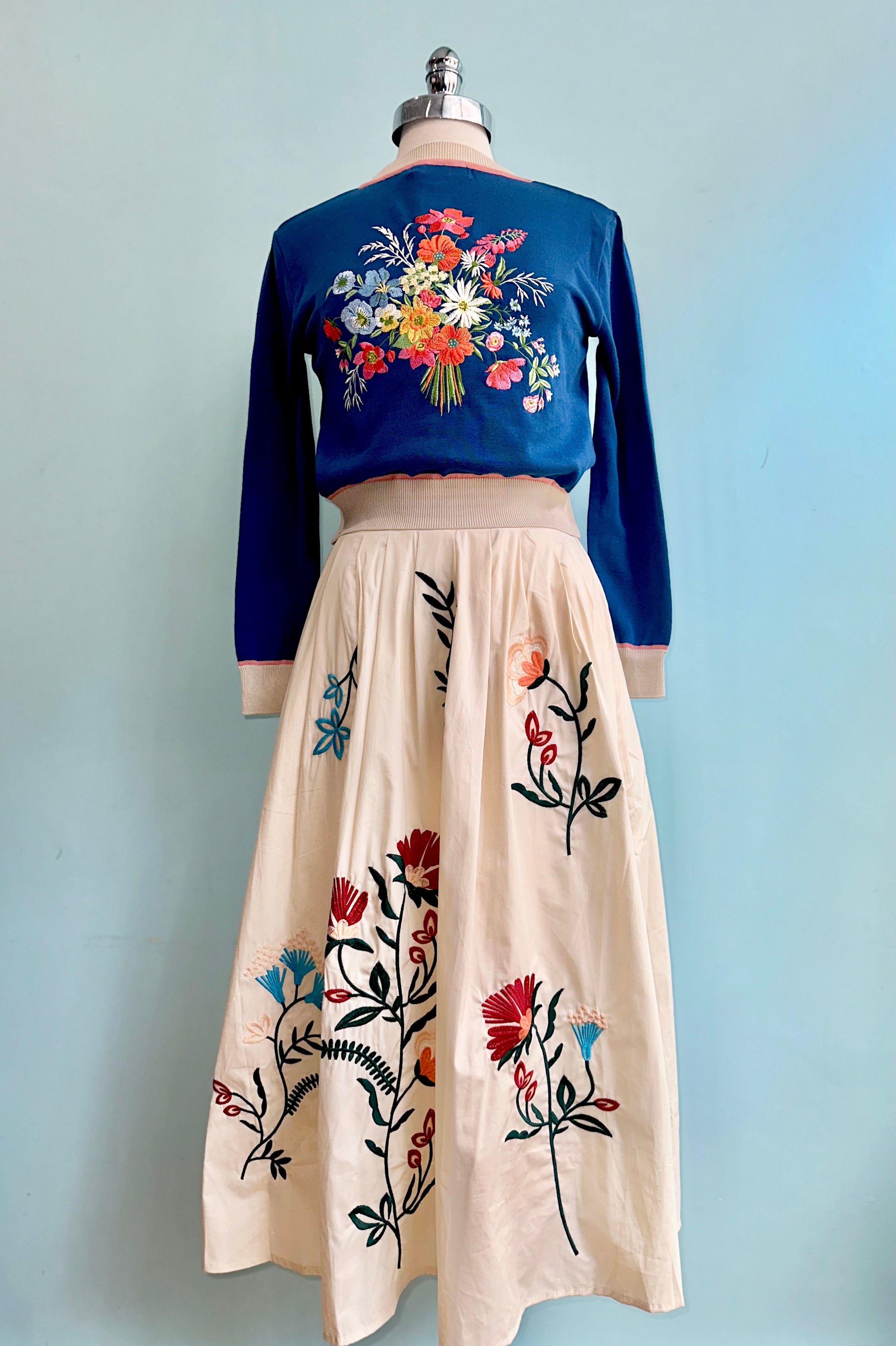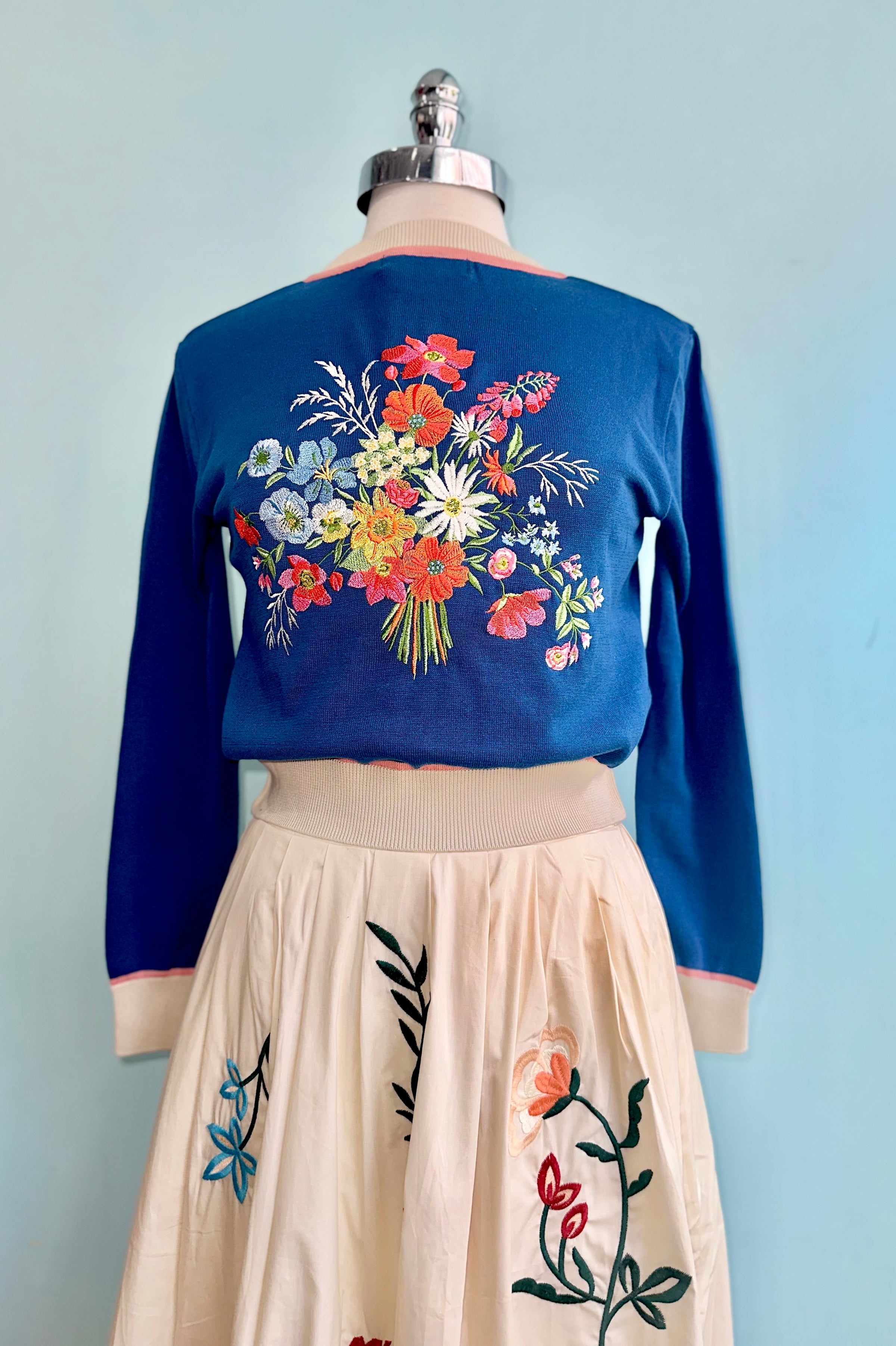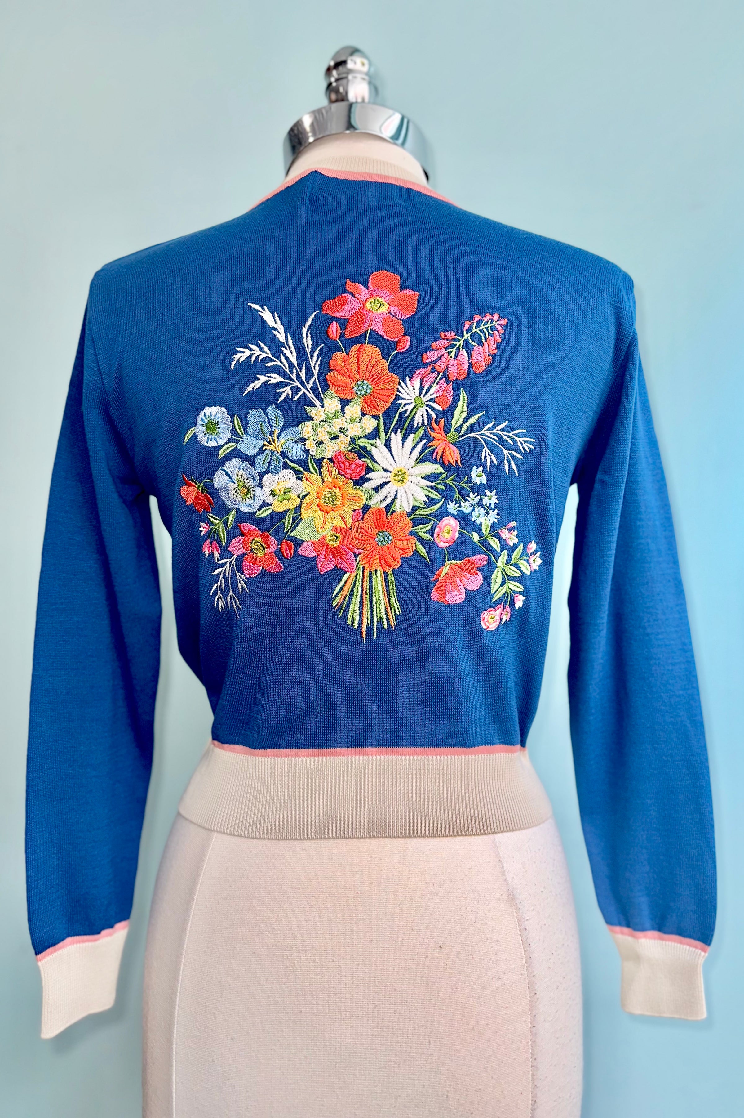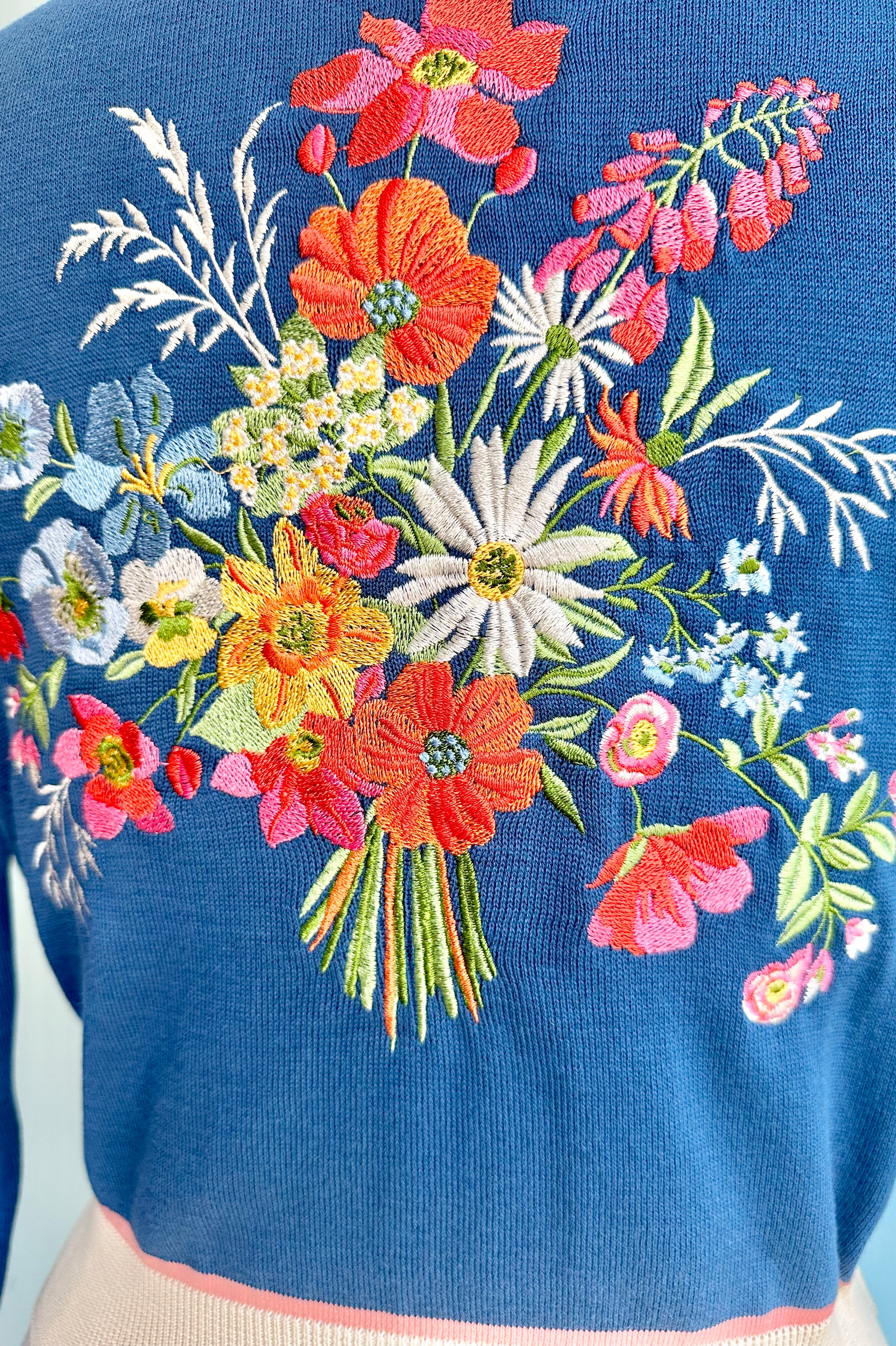 A blue cardigan with cream colored trim and embroidered flowers, poppies, pansies, cosmos, and wild grasses decorating the back drawn by Ingebjørg Hunskaar and inspired by long, light Norwegian summer evenings spent picking posies.