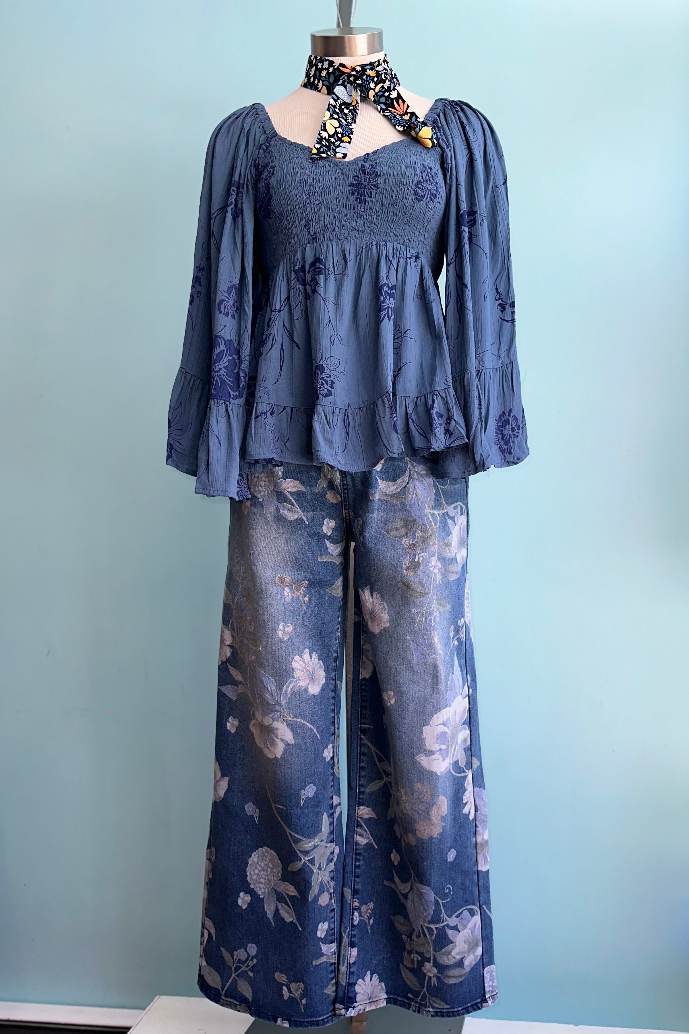 Bell sleeve top in blue with a dark blue rose print. This top has a fully smocked bodice with an empire waist. The front has a V-neckline and a square back.