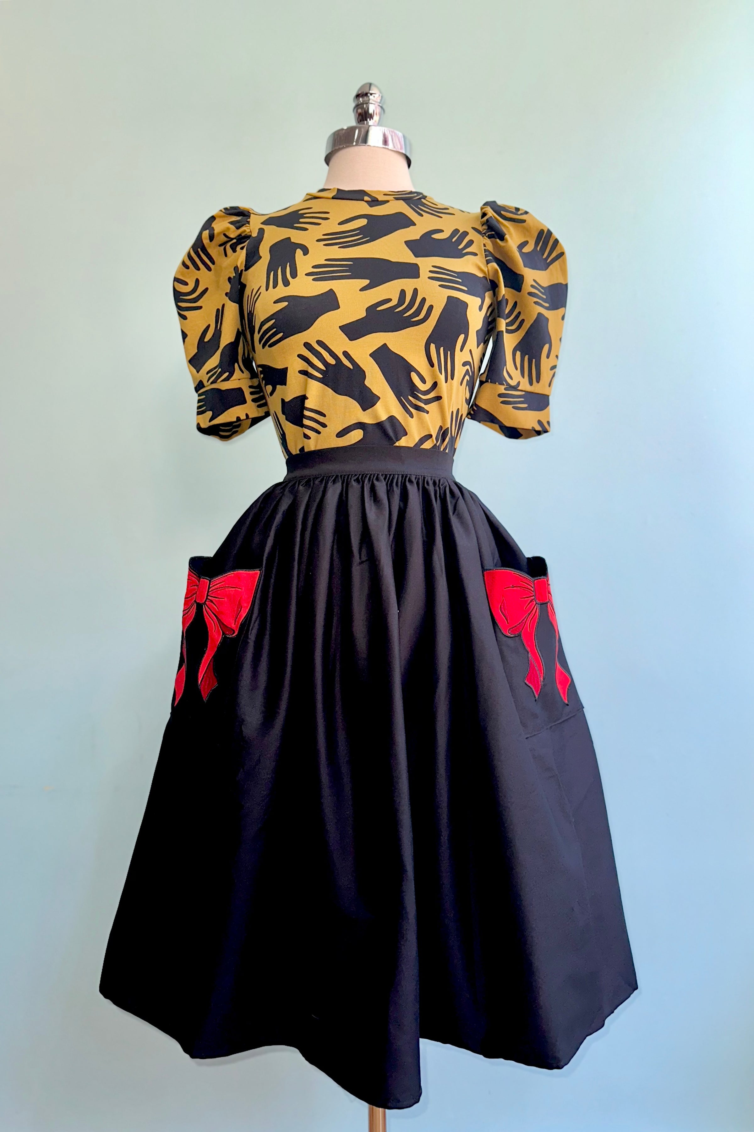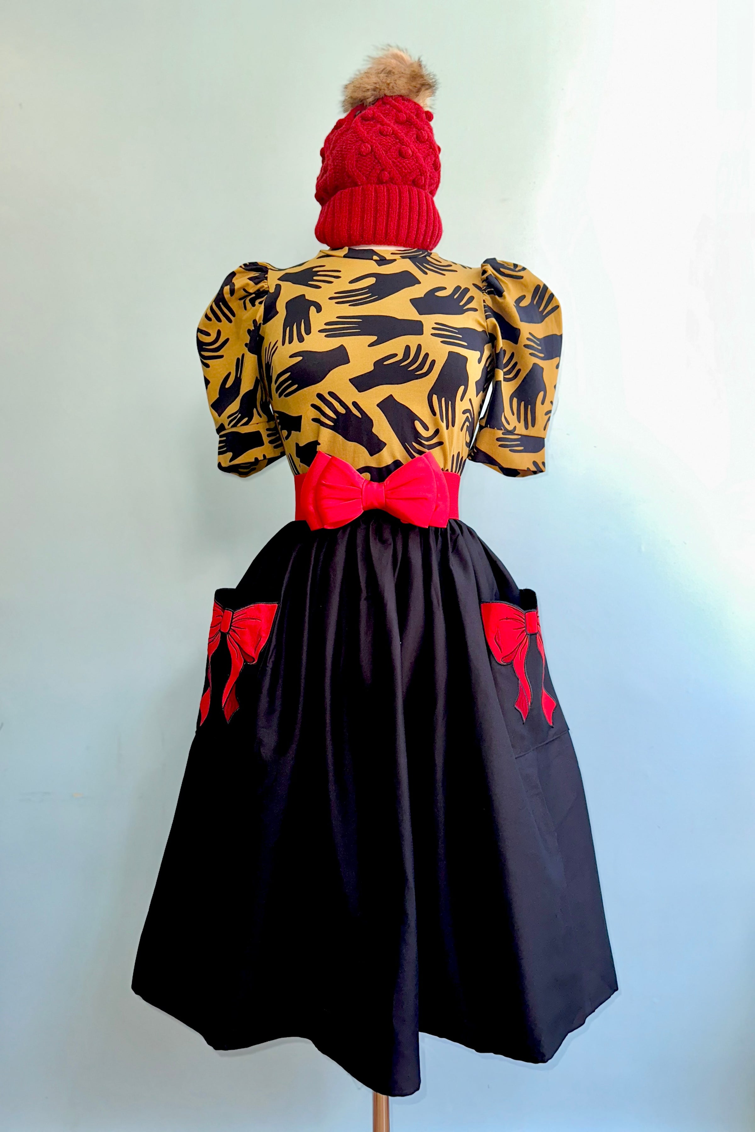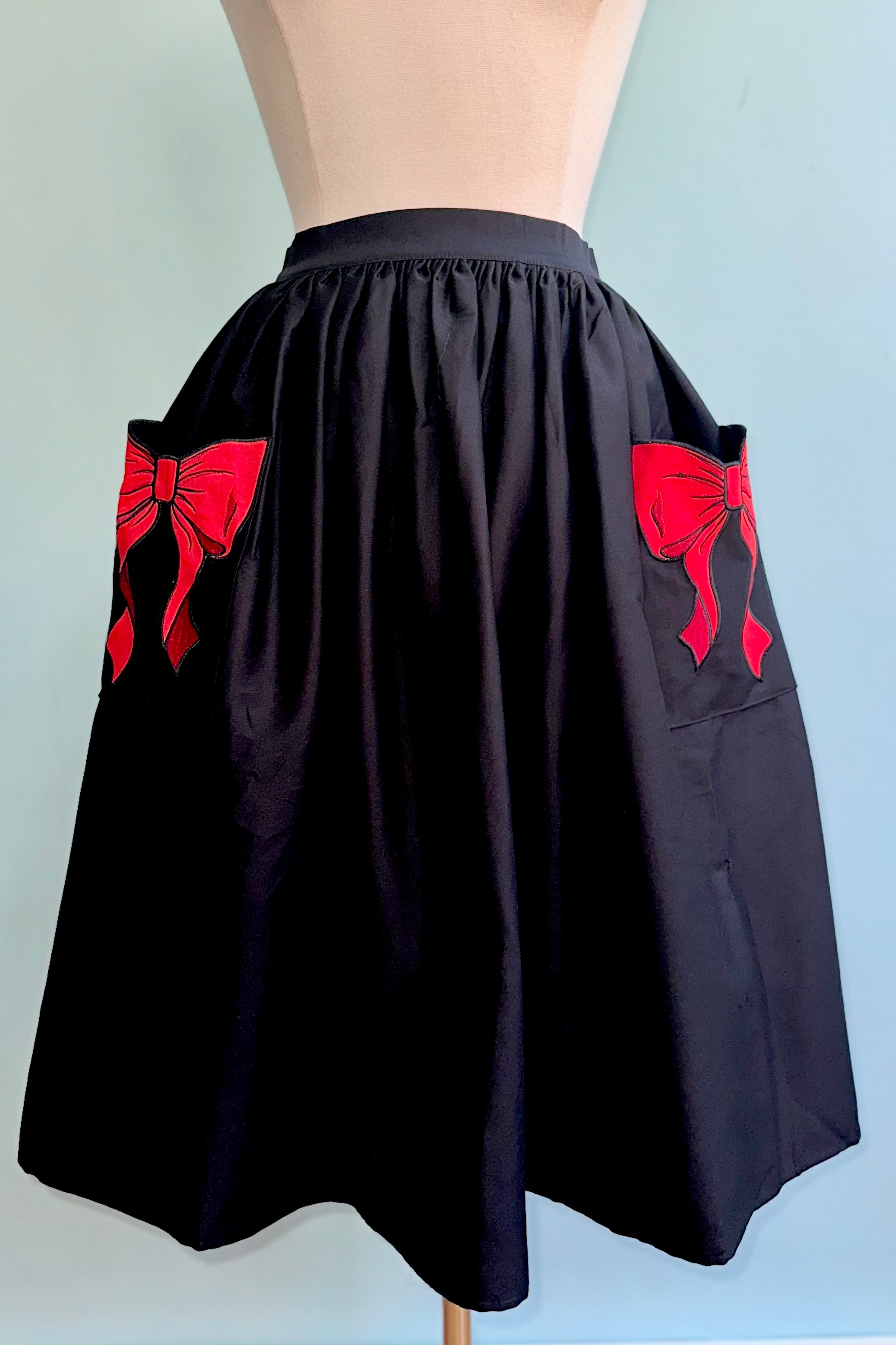 Cotton gathered skirt with bow pockets. This skirt has a back zip and button closure. The fabric has a small amount of ease.