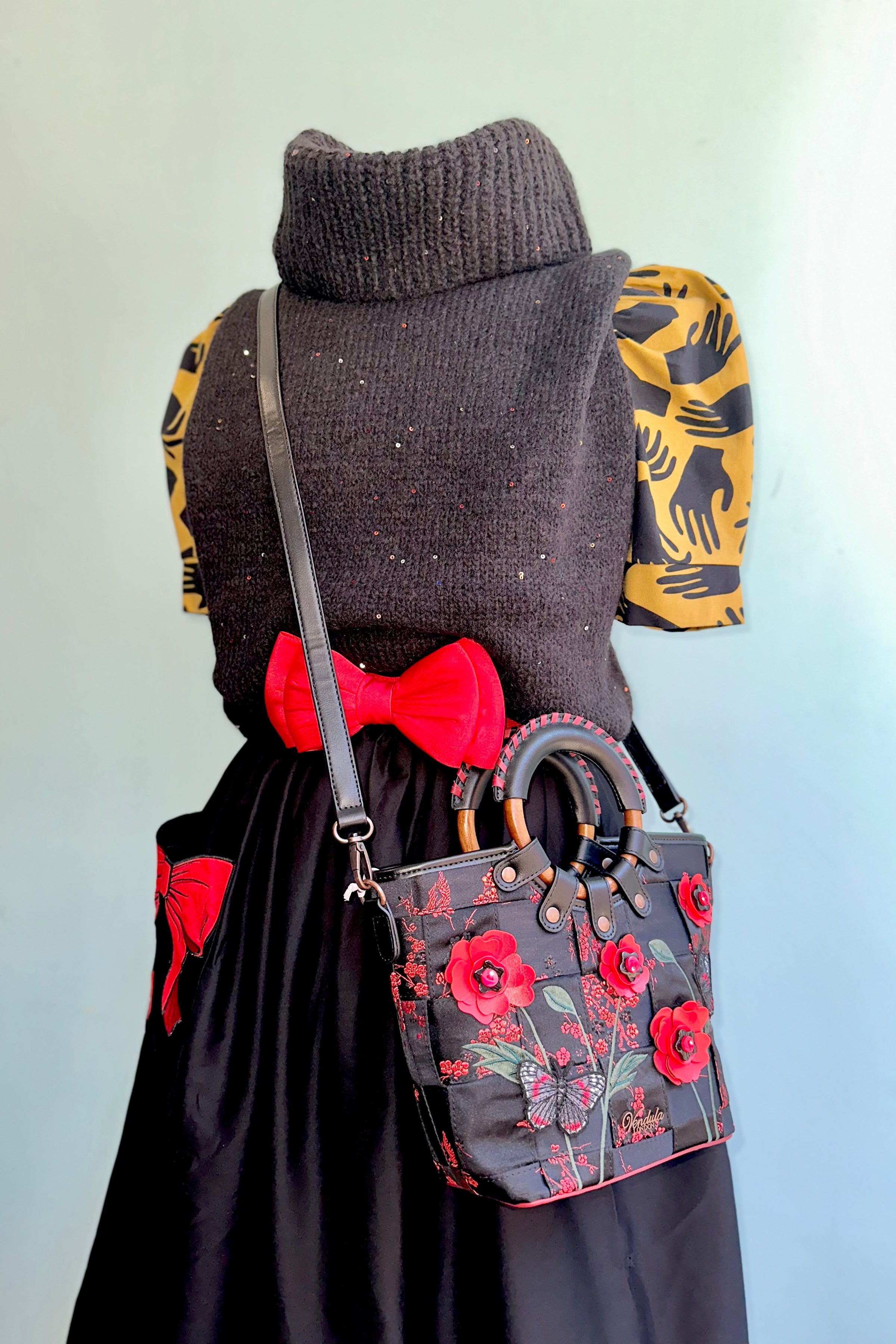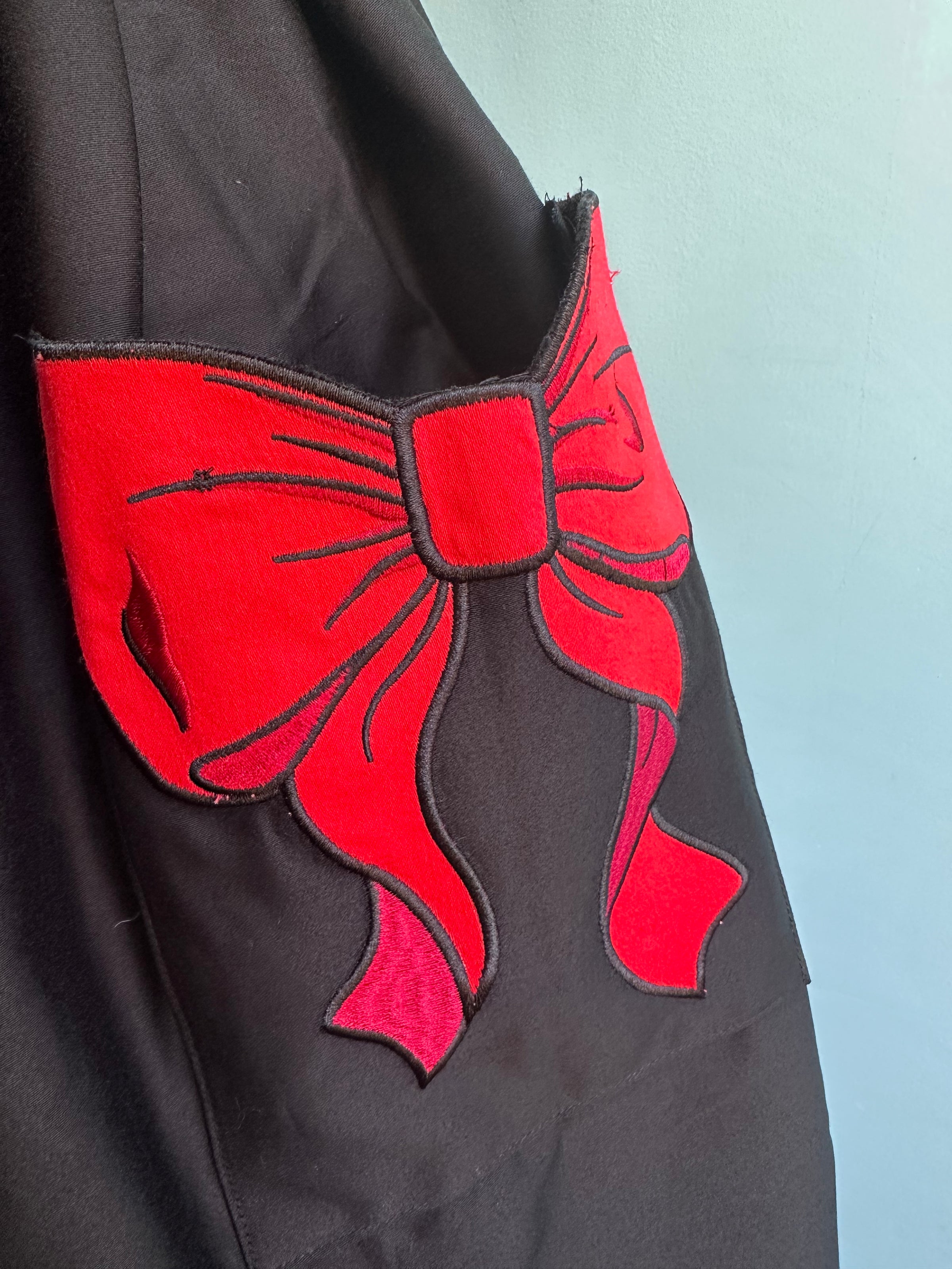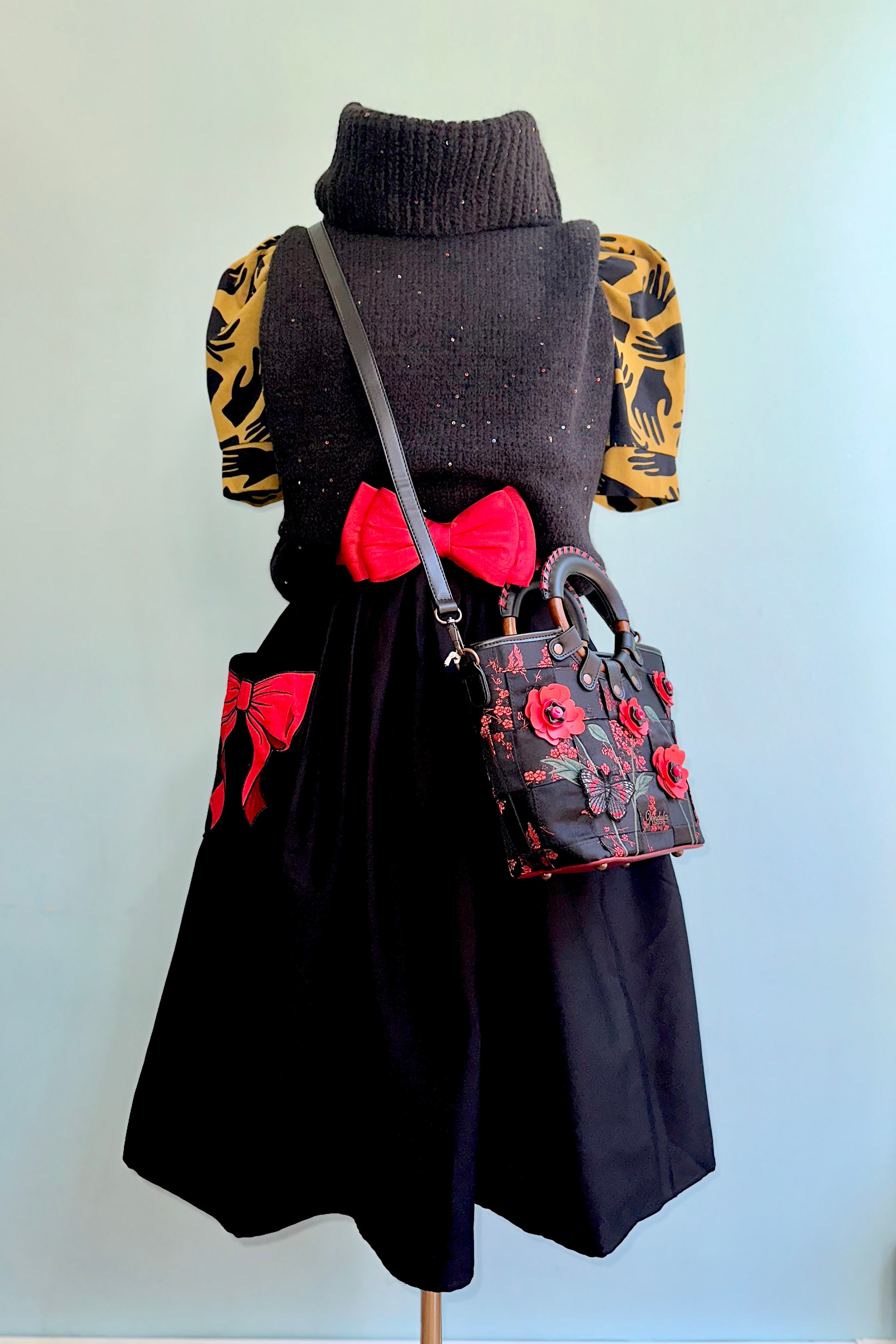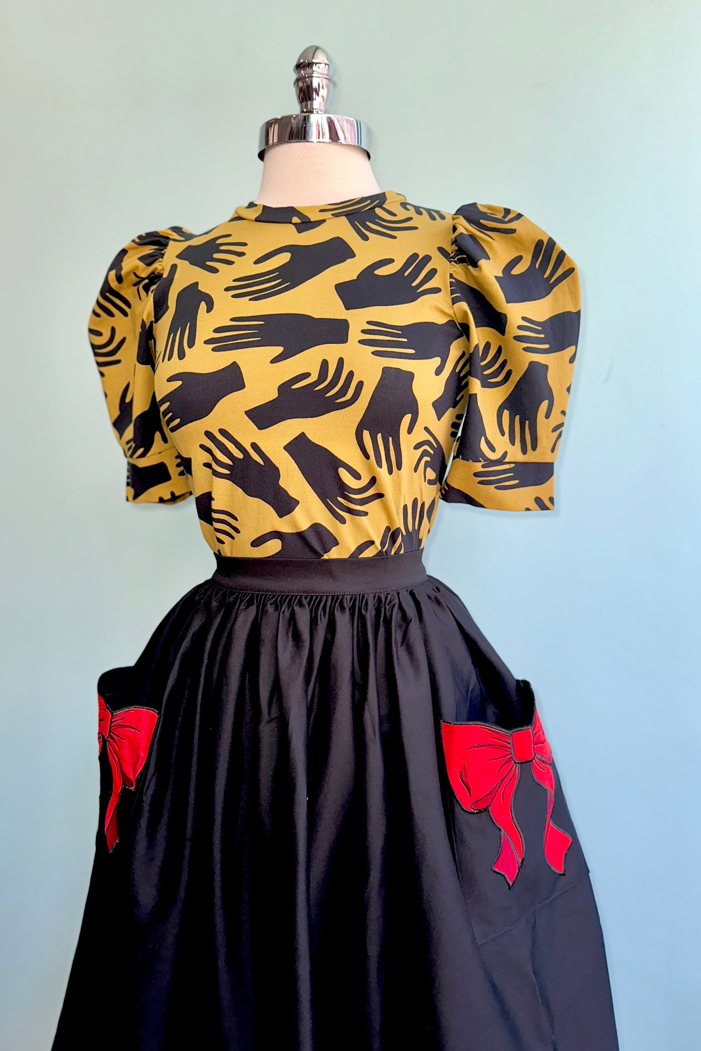 Cotton gathered skirt with bow pockets. This skirt has a back zip and button closure. The fabric has a small amount of ease.