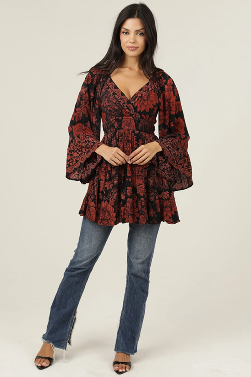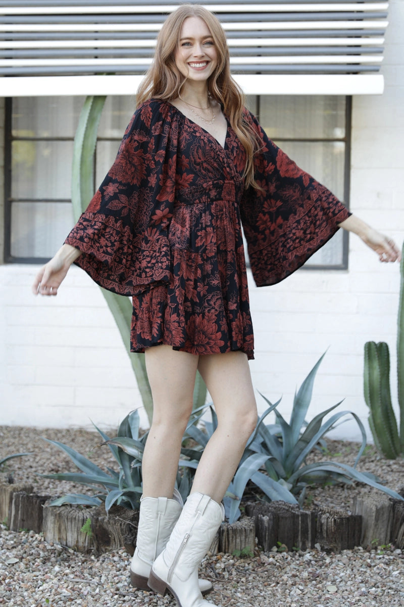 Burgundy and Black Floral Bell Sleeve Mini Dress