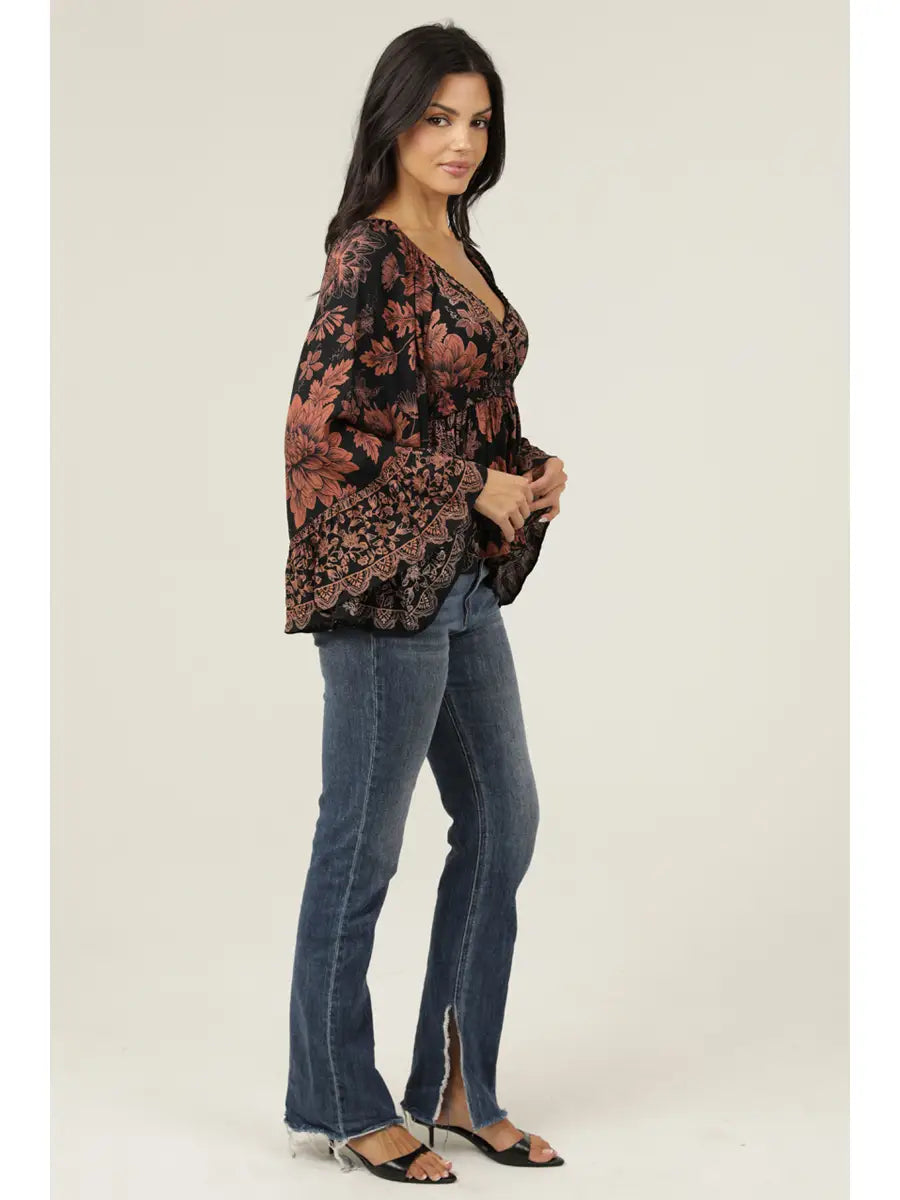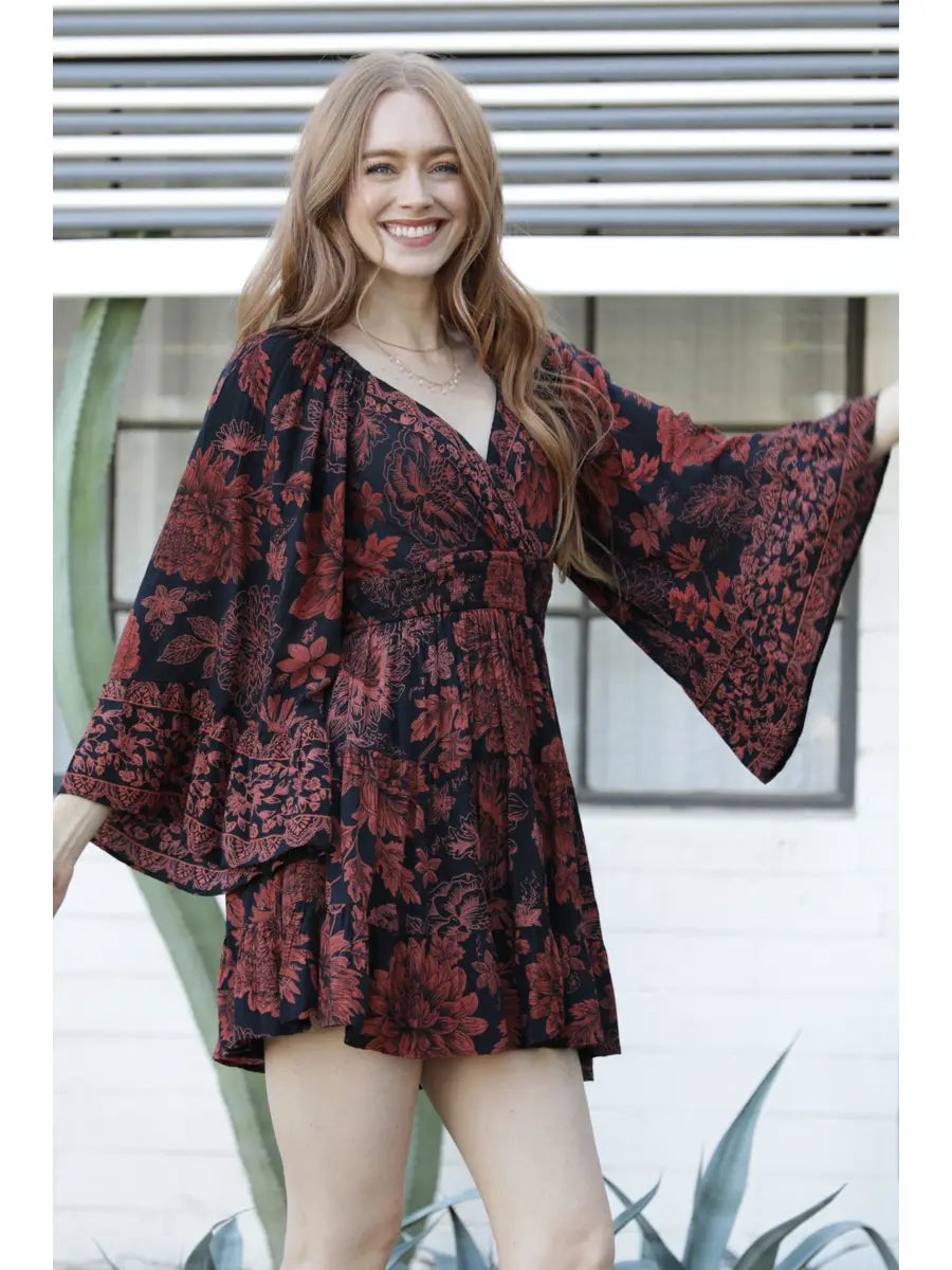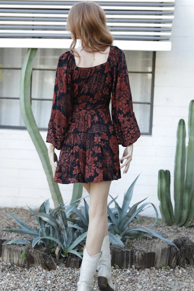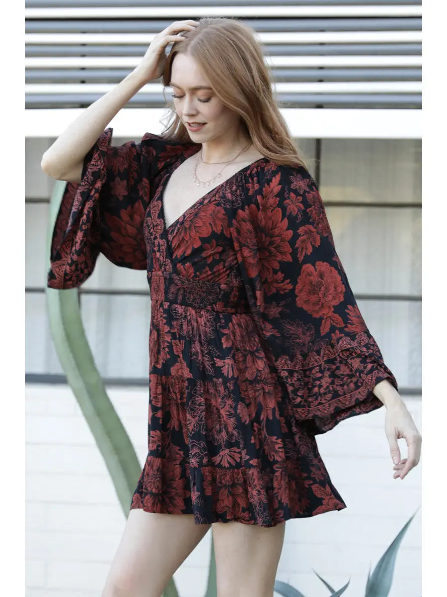 A black and burgundy floral and leaf mini dress with bell sleeves. This dress has an elasticized waist and a tiered mini length skirt. It is not lined and does not have pockets.