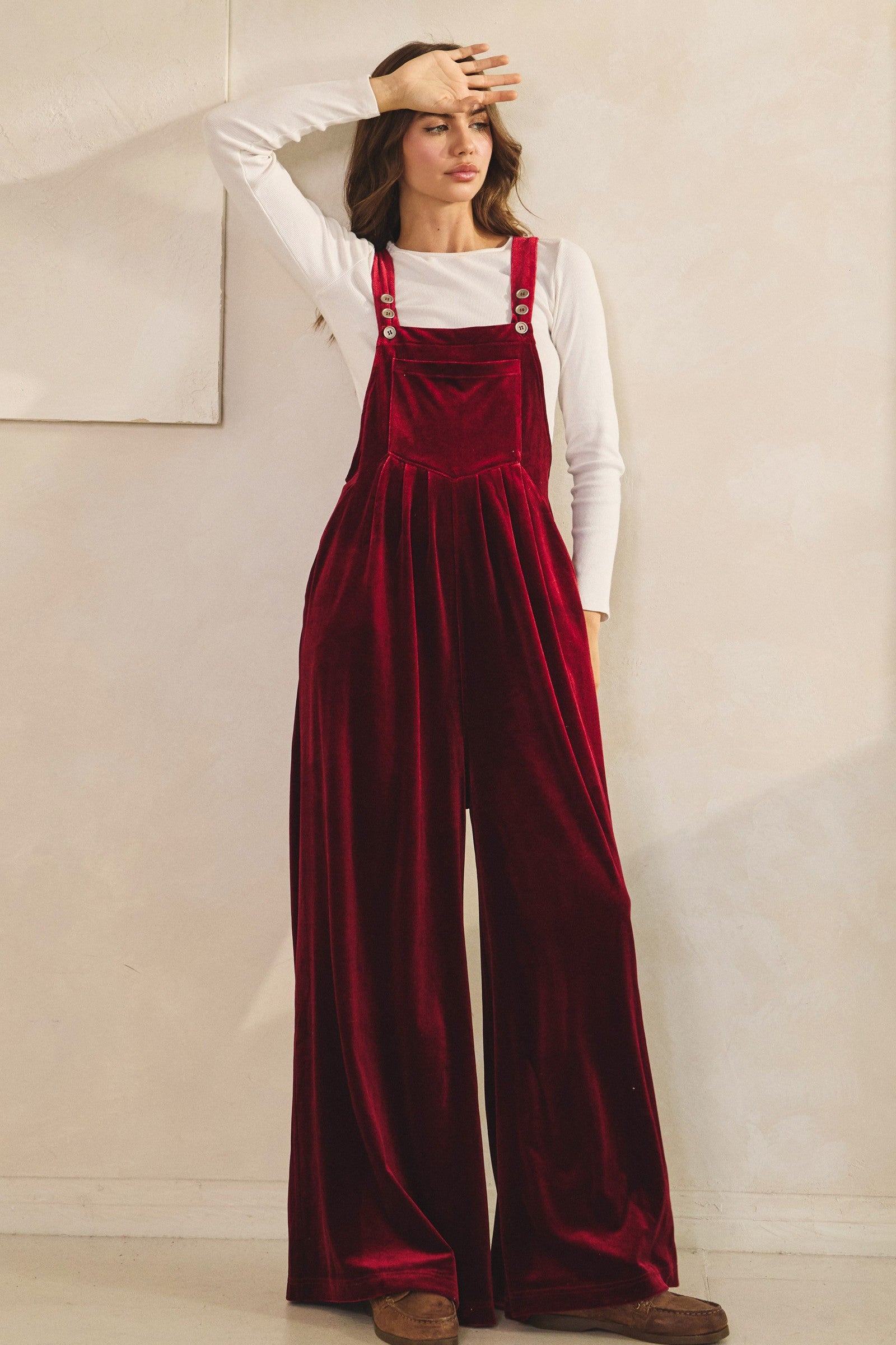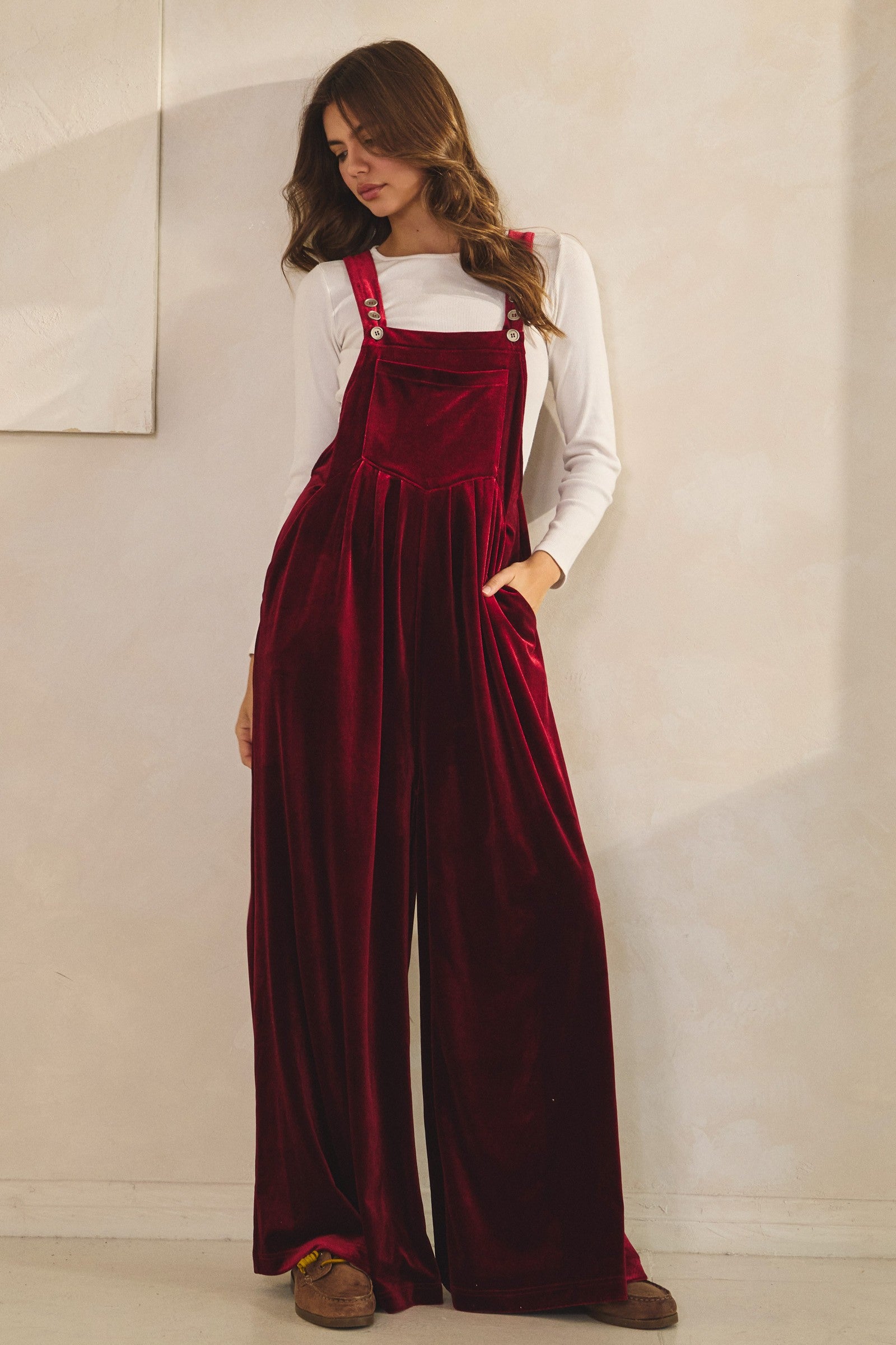 Burgundy velvet overalls with adjustable straps.  This jumpsuit has side pockets and a center front bib pocket.  The fabric is so stretchy and roomy!