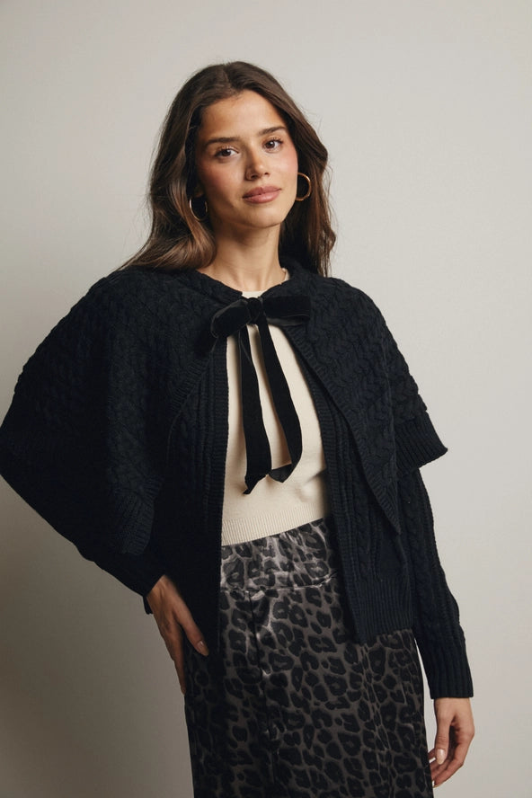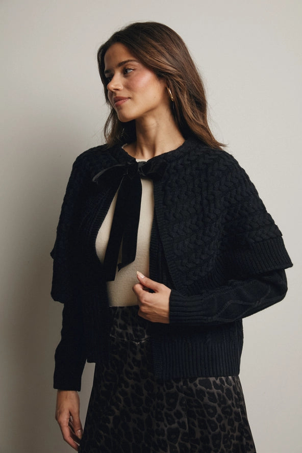 Cable Knit Capelet Cardigan with Velvet Bow in Black