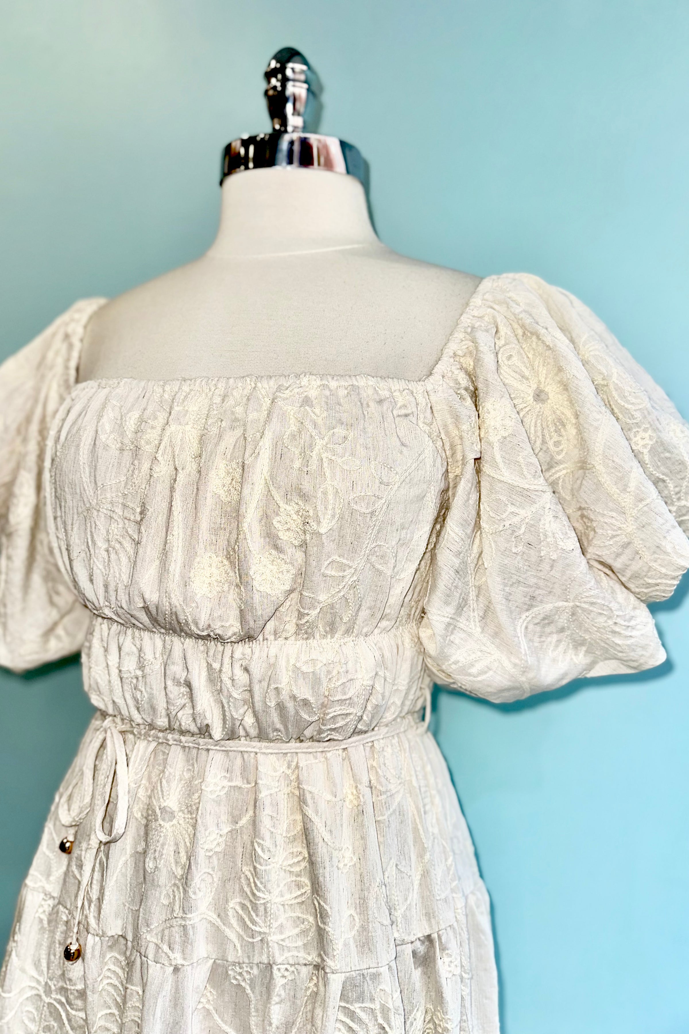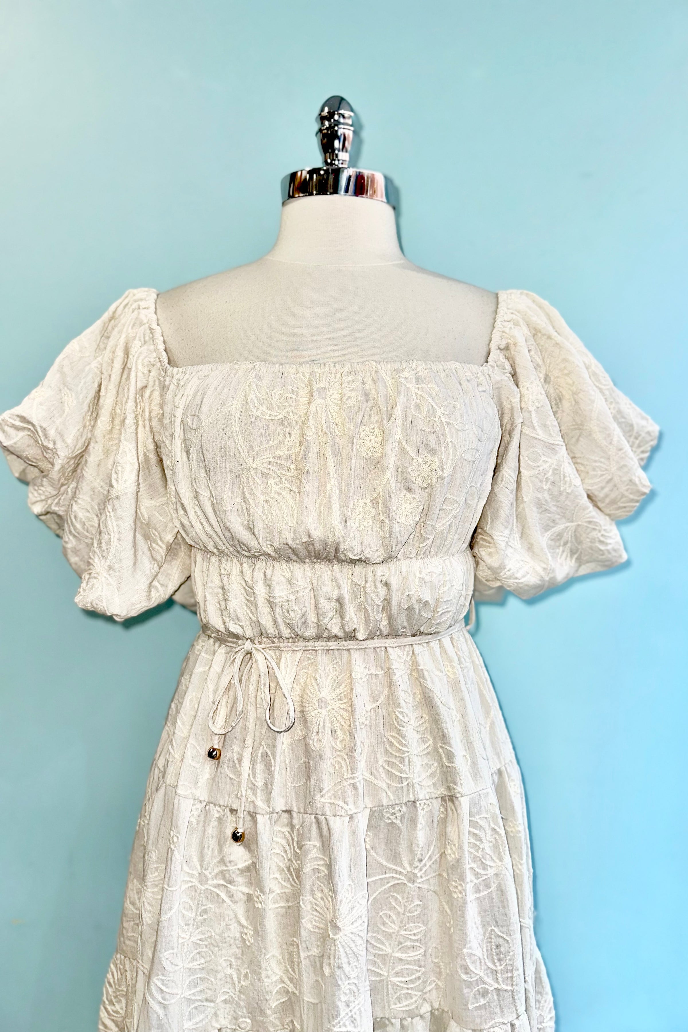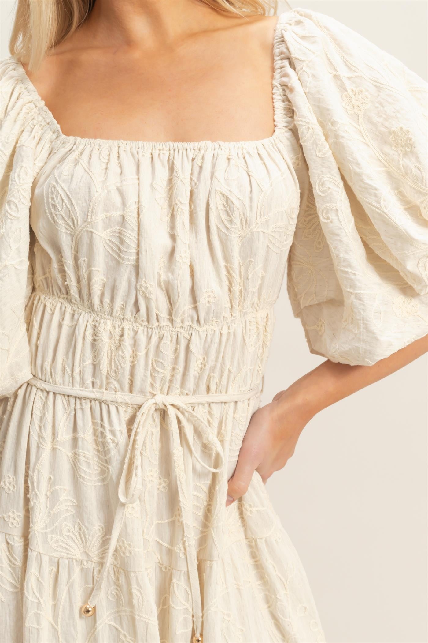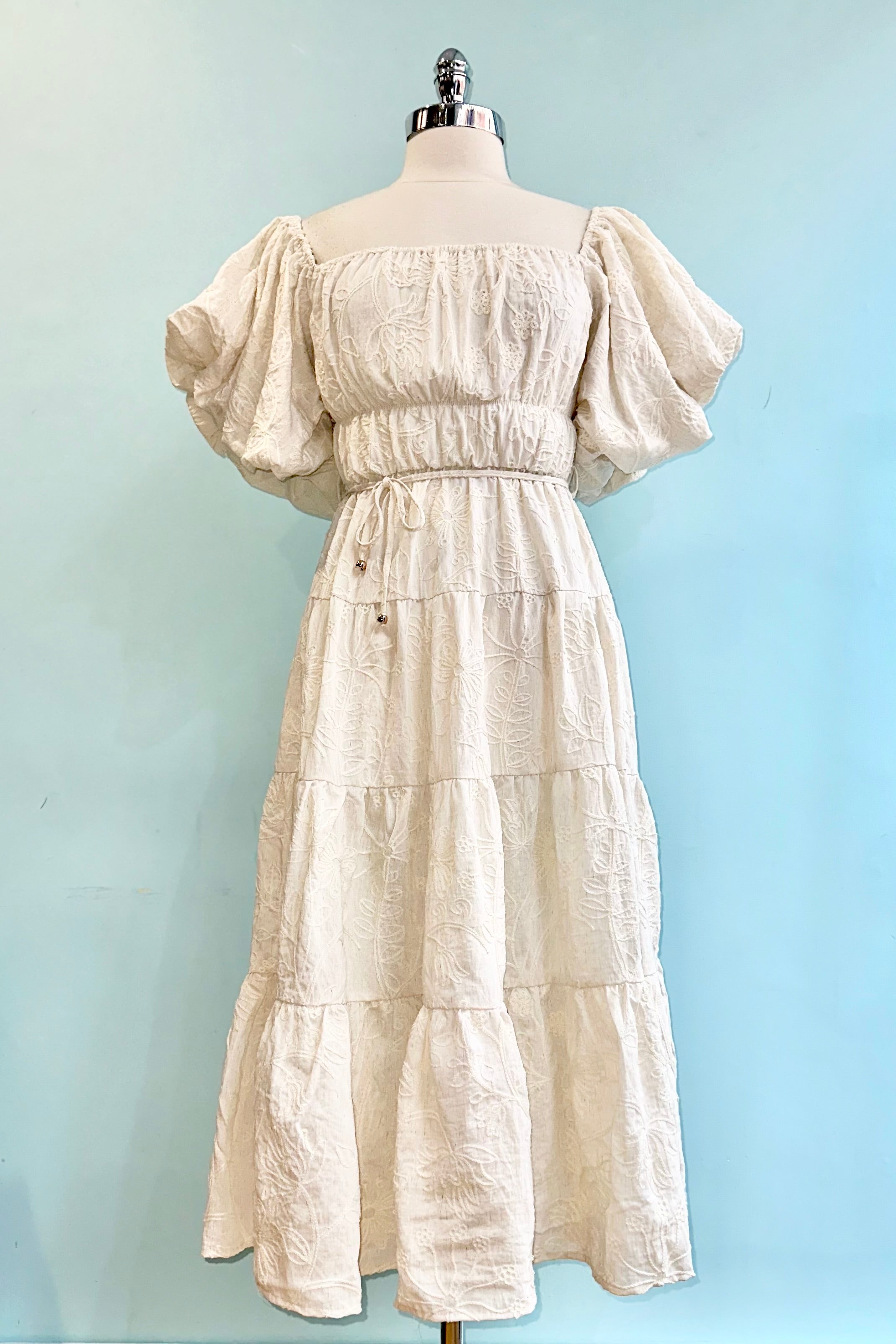 A super comfy midi length dress cream with embroidered flowers. The waist features two elastic bands and a fabric tie belt. The bodice has an elasticized neckline and awesome elastic puff sleeves. The skirt is tiered, the dress is fully lined, and it does not have pockets.