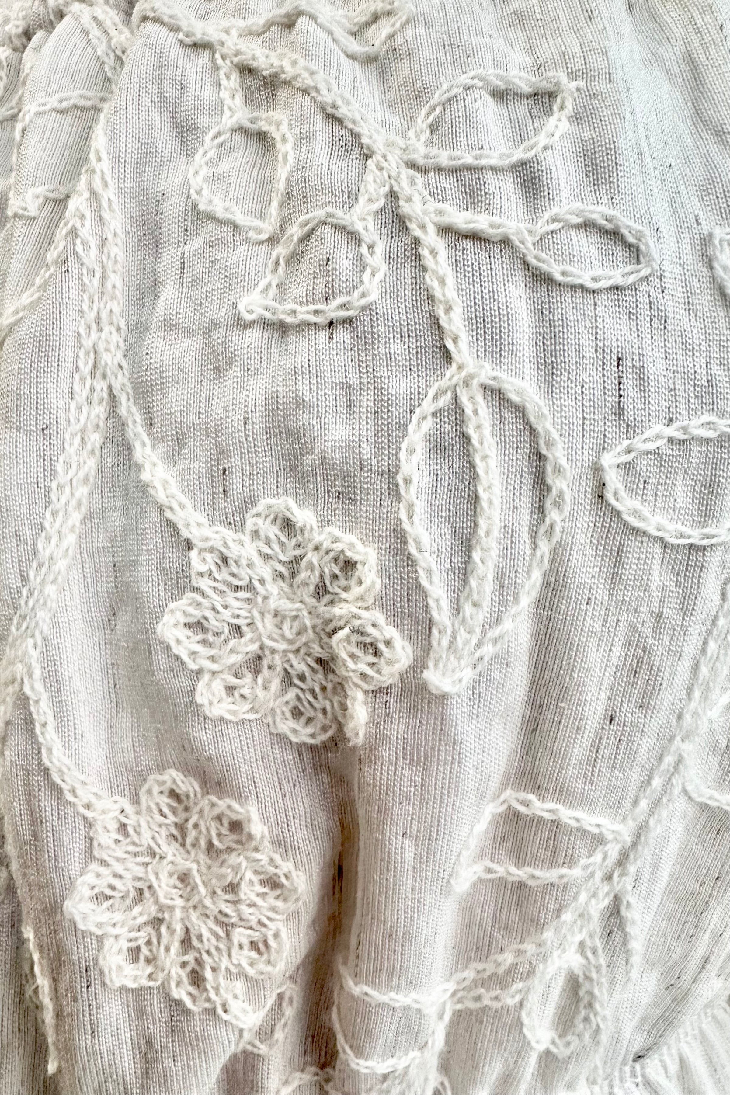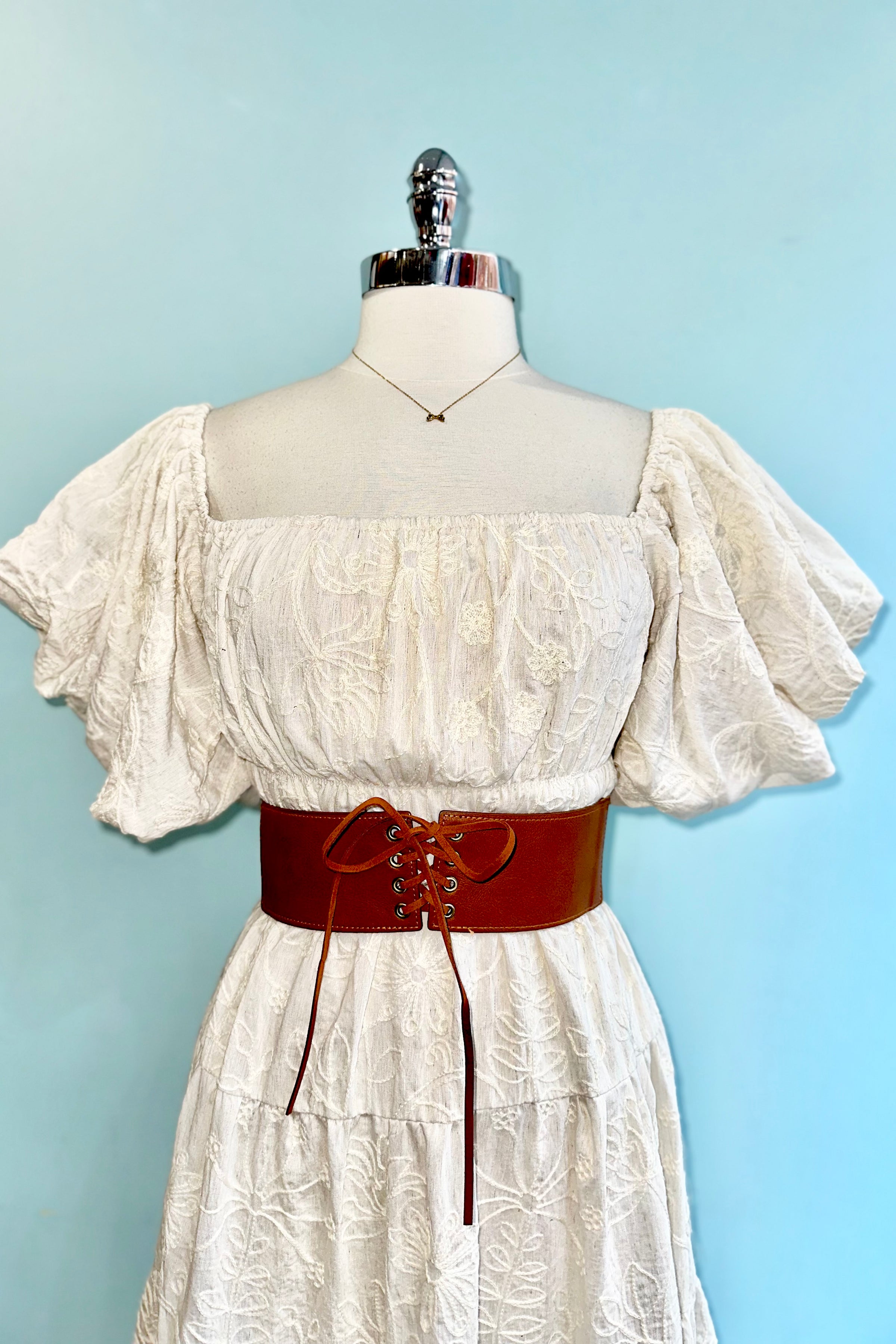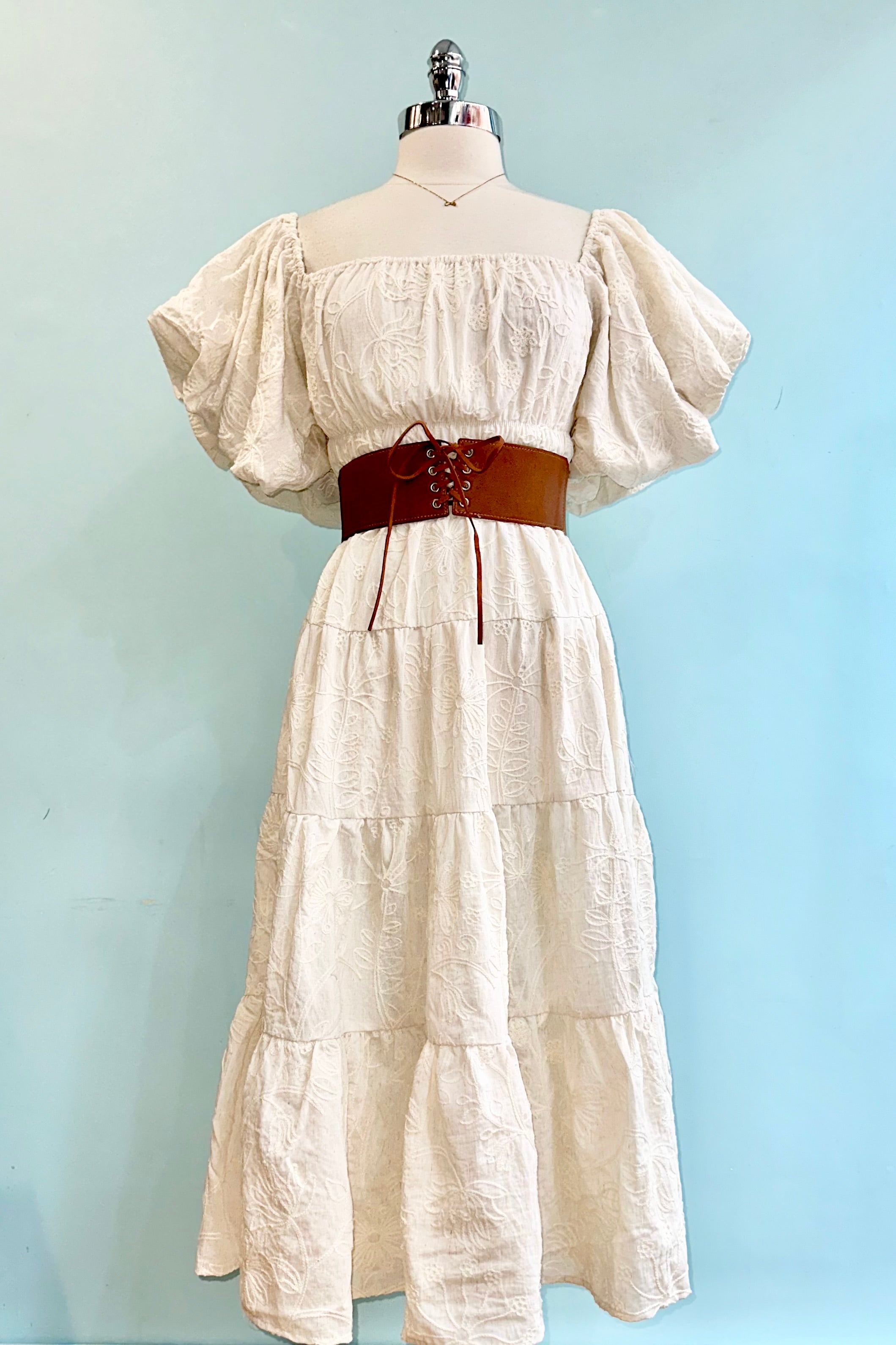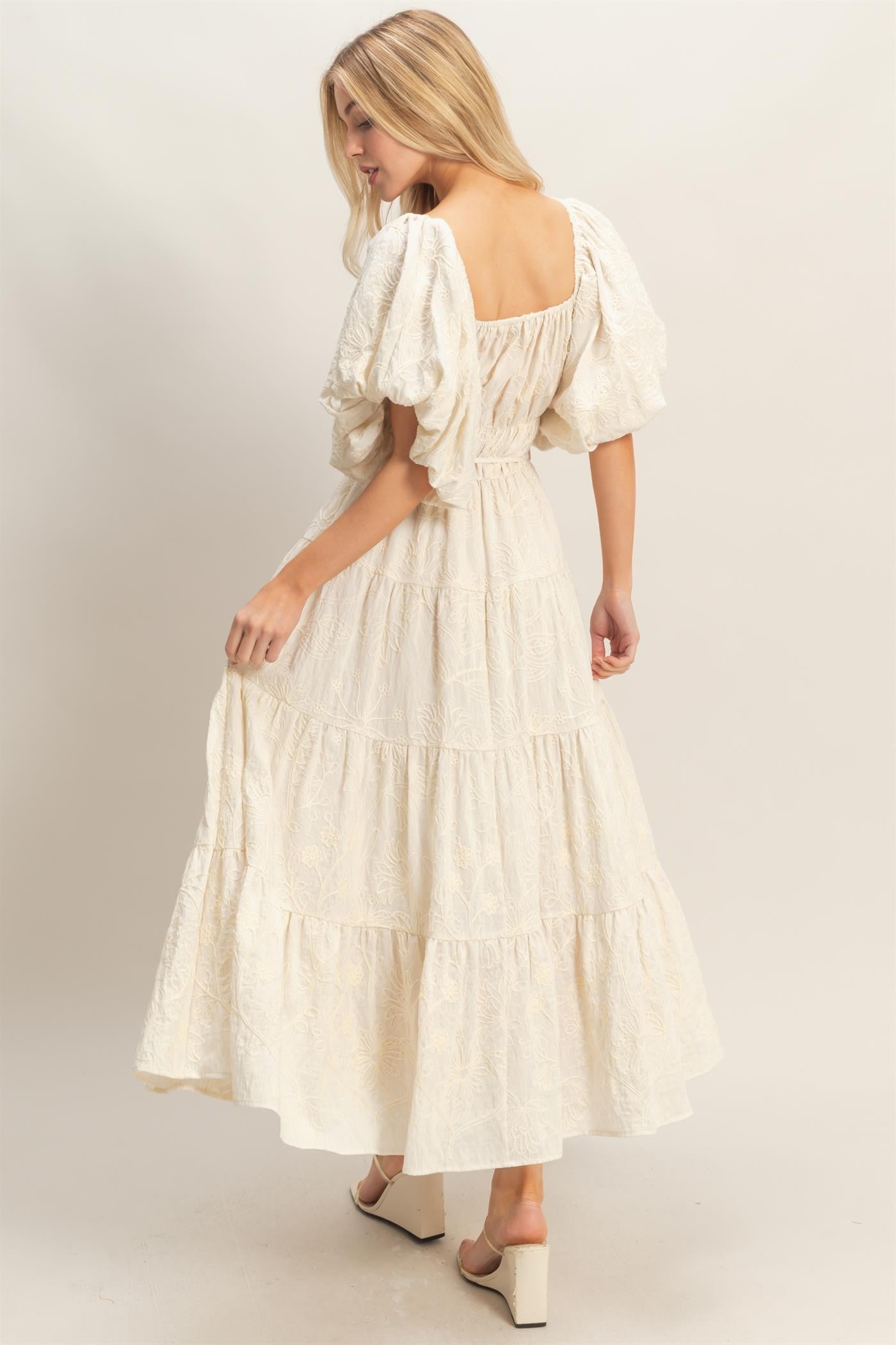 A super comfy midi length dress cream with embroidered flowers. The waist features two elastic bands and a fabric tie belt. The bodice has an elasticized neckline and awesome elastic puff sleeves. The skirt is tiered, the dress is fully lined, and it does not have pockets.