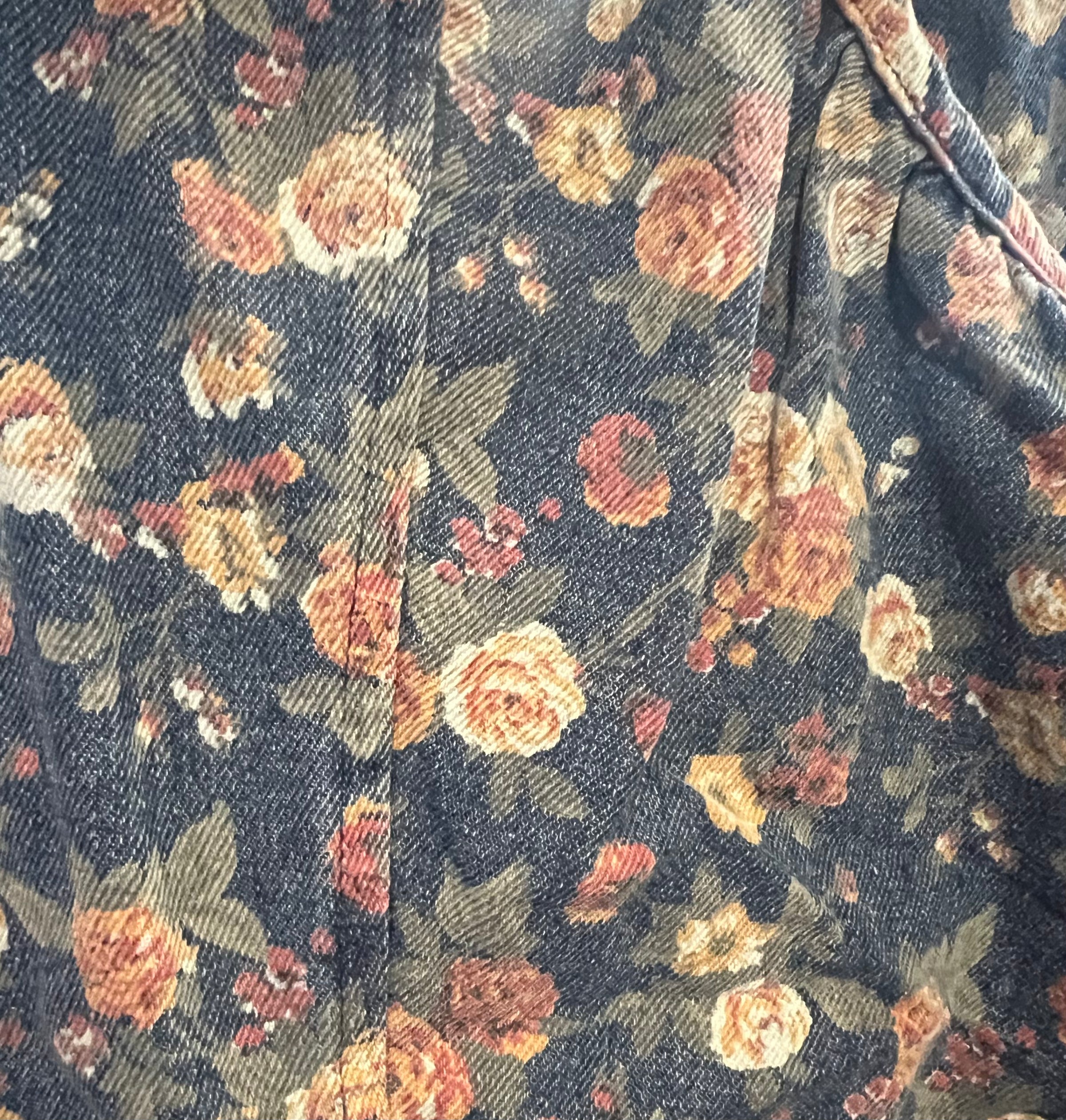Denim joggers with a floral print in rust and ivory. These pants have big side pockets with an elastic waist and elastic cuff at the ankle.