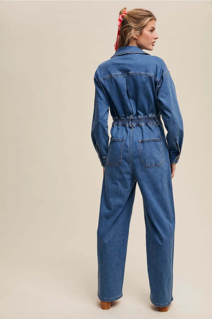 This utility-inspired jumpsuit merges modern functionality with effortless style. The stretchy fabric and elastic waist offer all-day comfort, while the zip-front closure and tailored details create a streamlined look. This jumpsuit has long sleeves with a buttoned cuff and a fold over collar. There are front and back pockets.  Easy on and off!