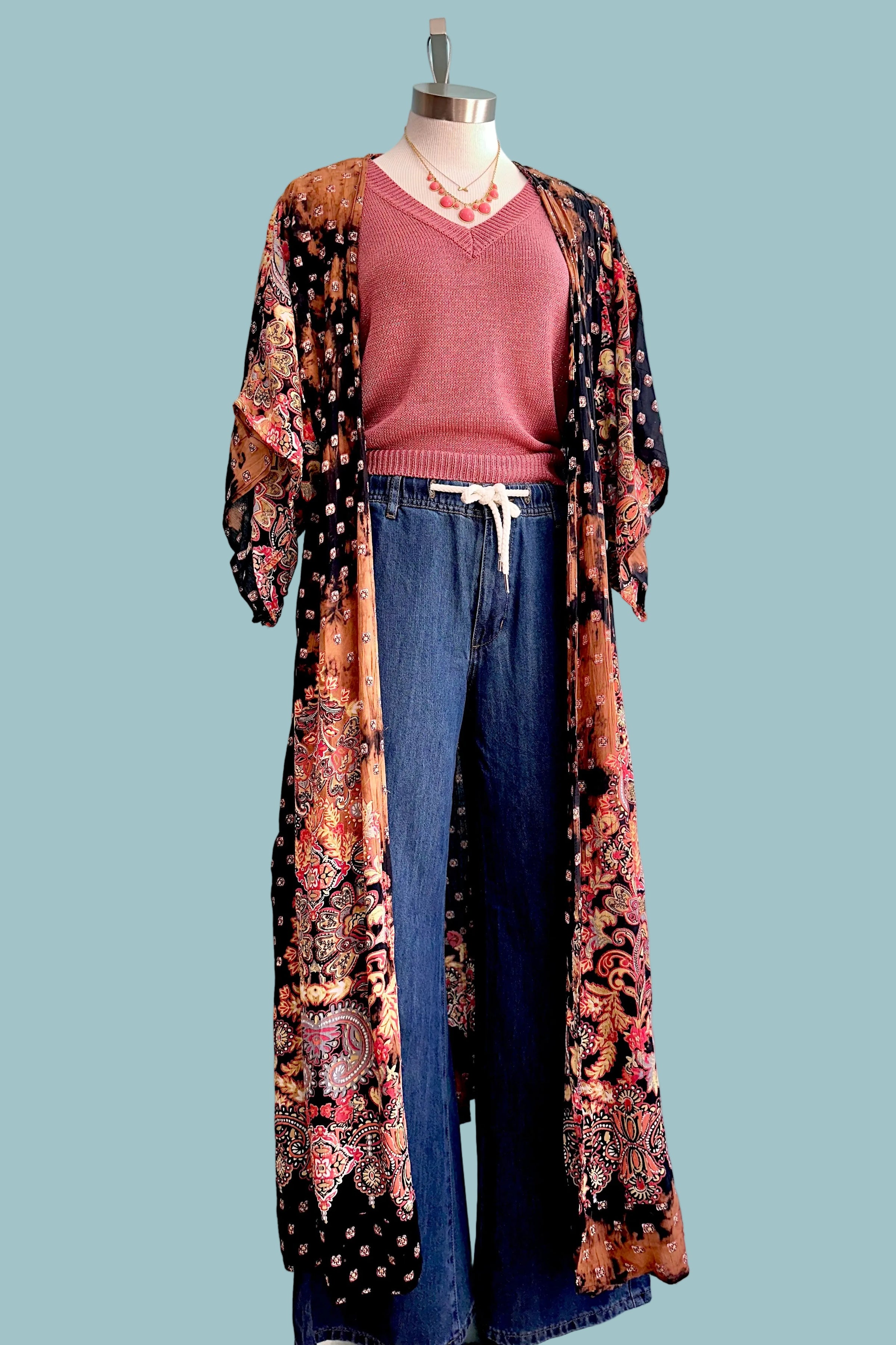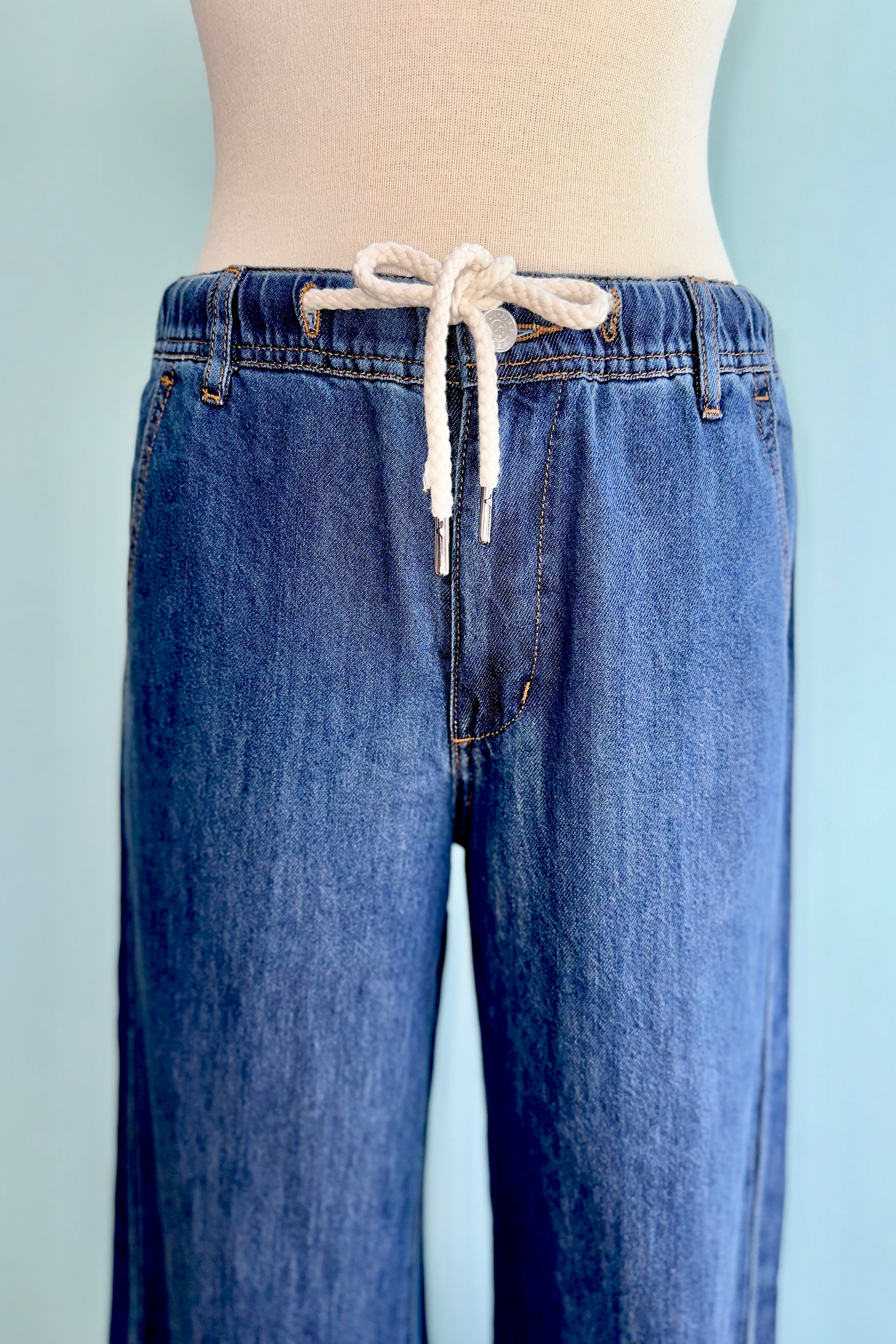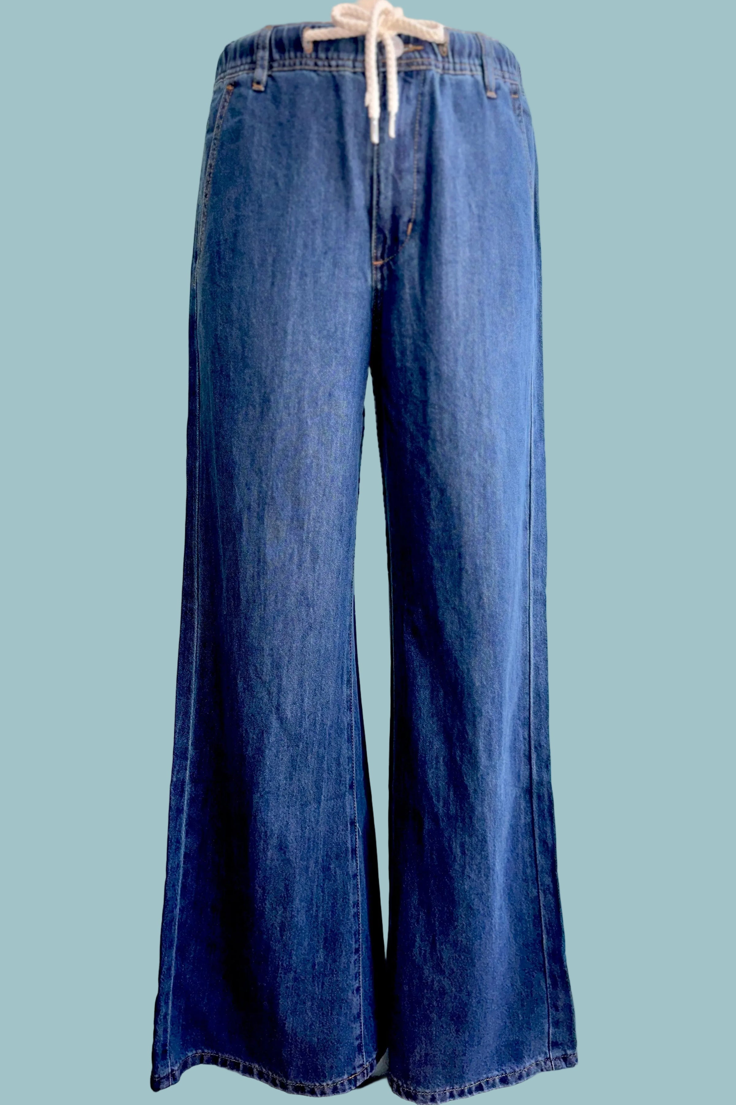 Drawstring and elastic waist denim pants with a wide flared leg. These pants have pockets on both the front and the back, they have belt loops, and they zip and button at the front.
