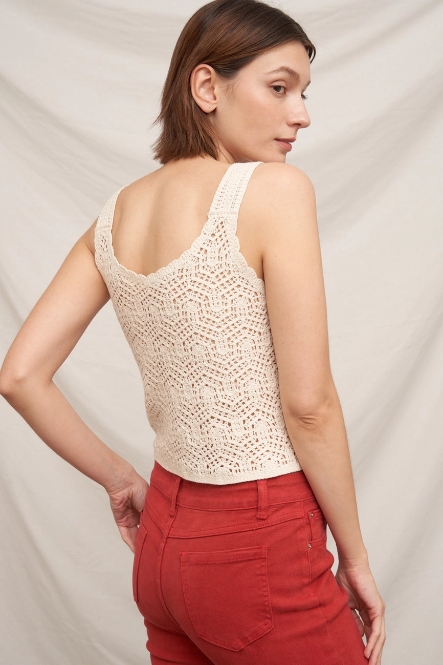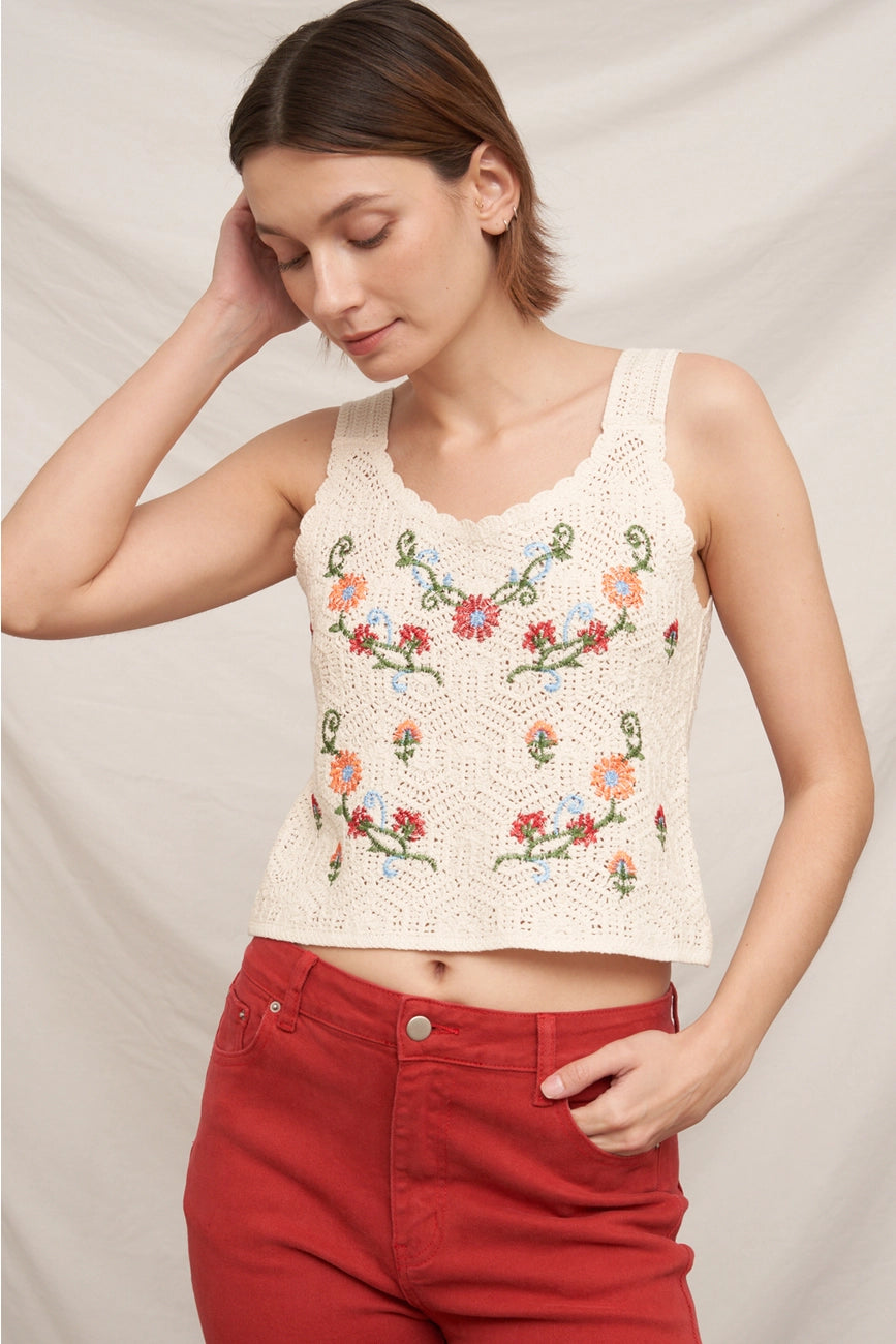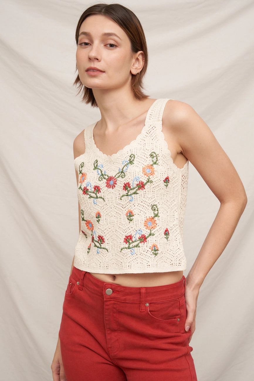 Embroidered Floral Knit Crochet Vest in Cream
