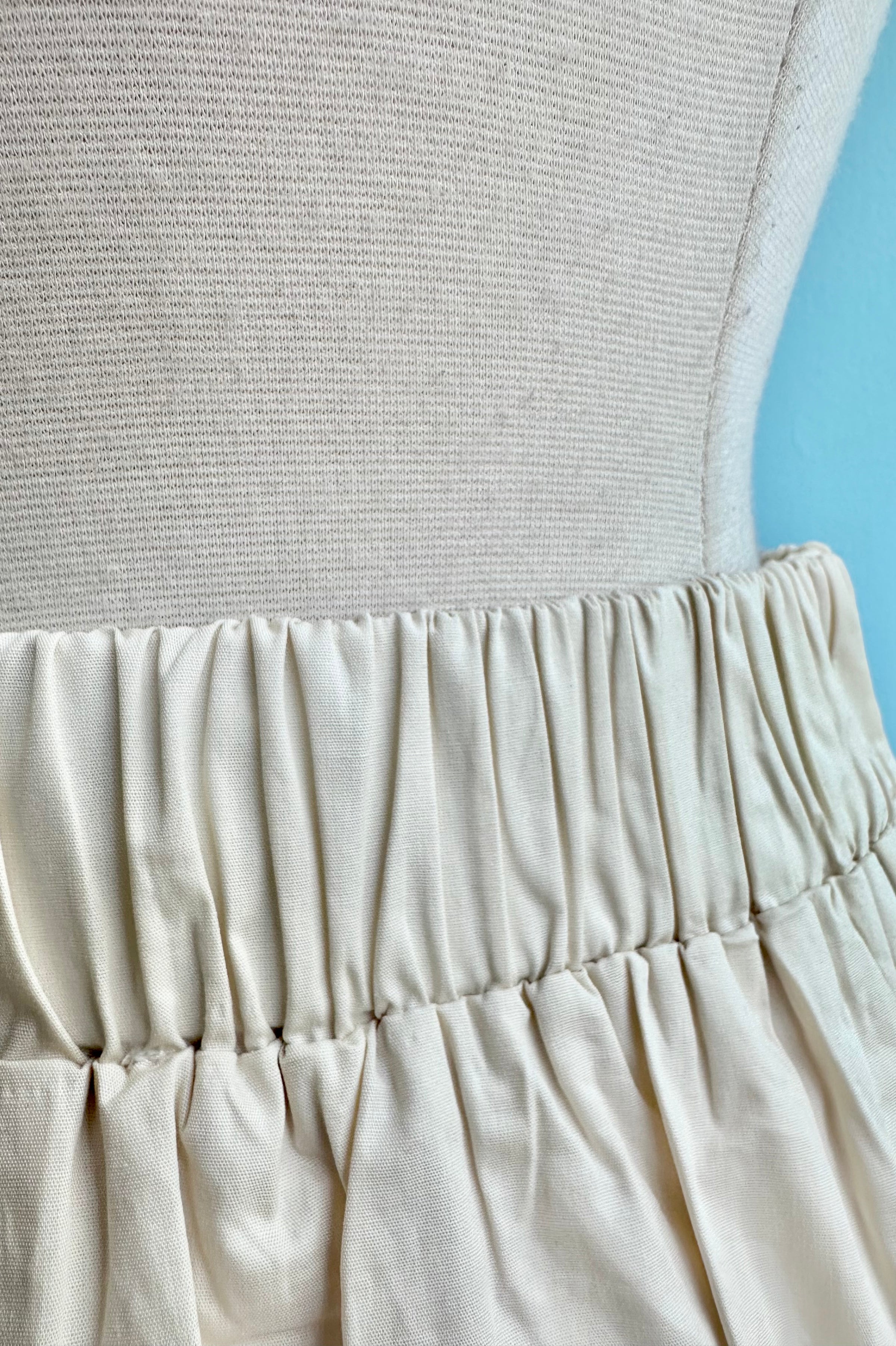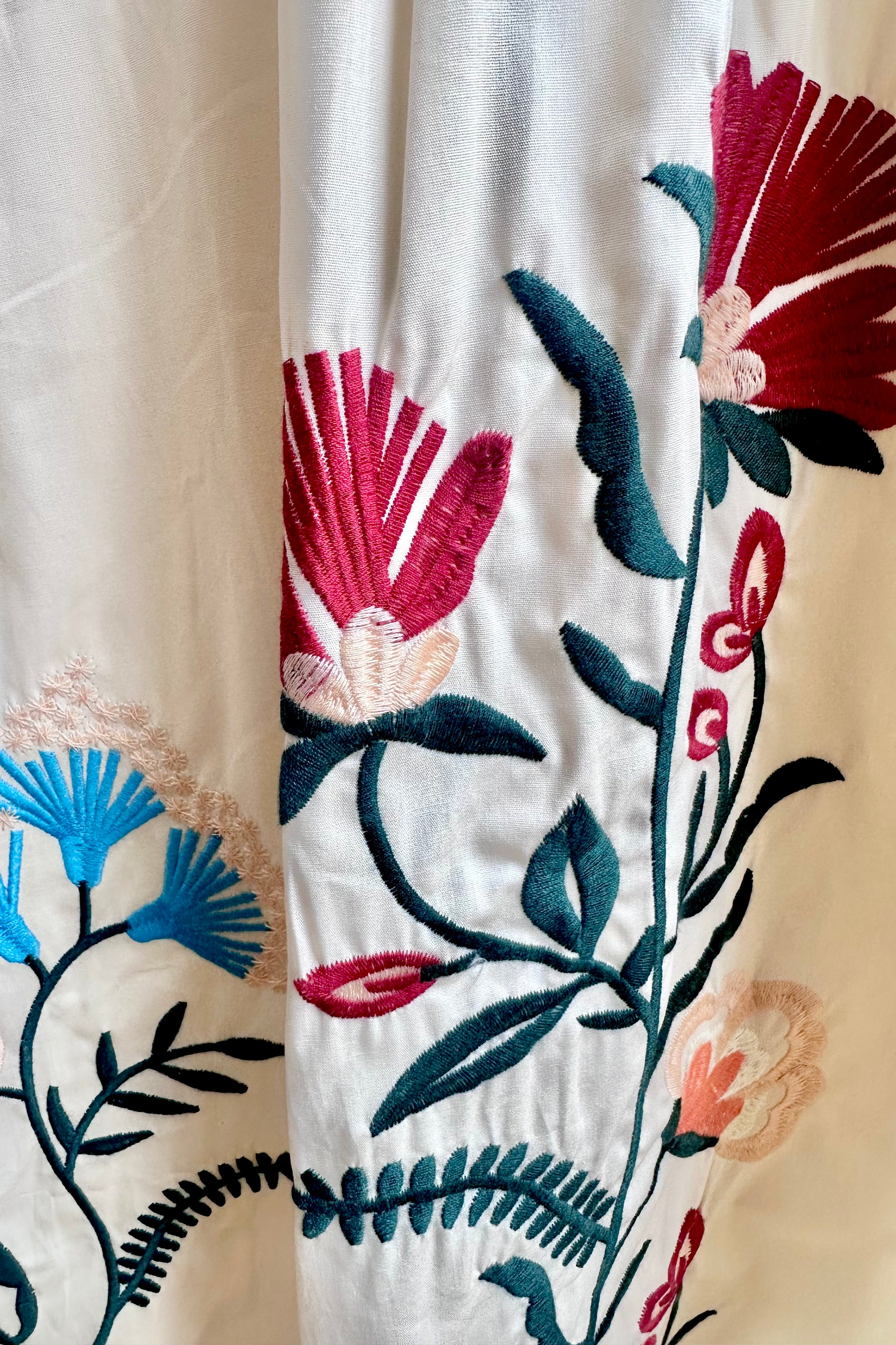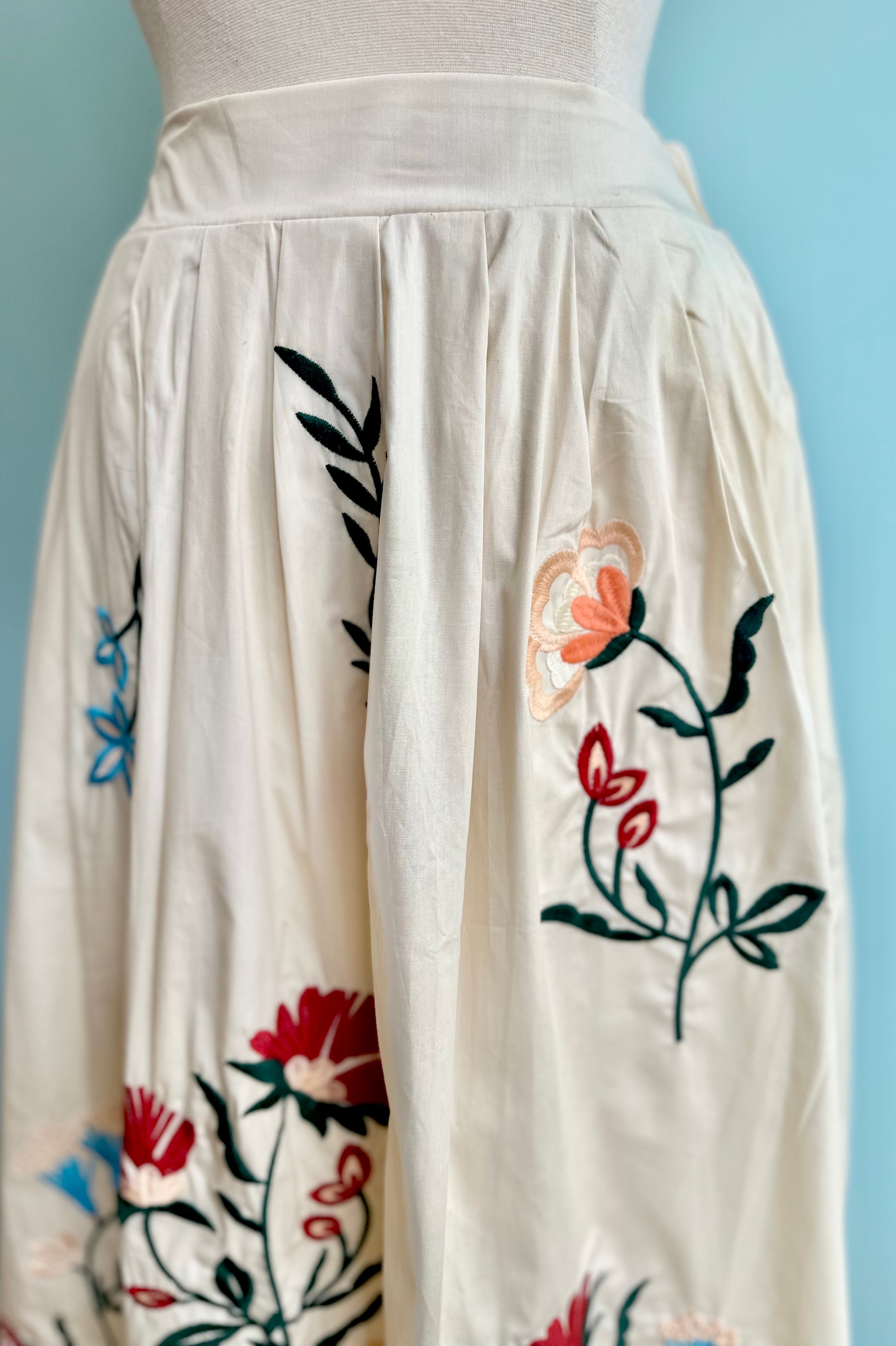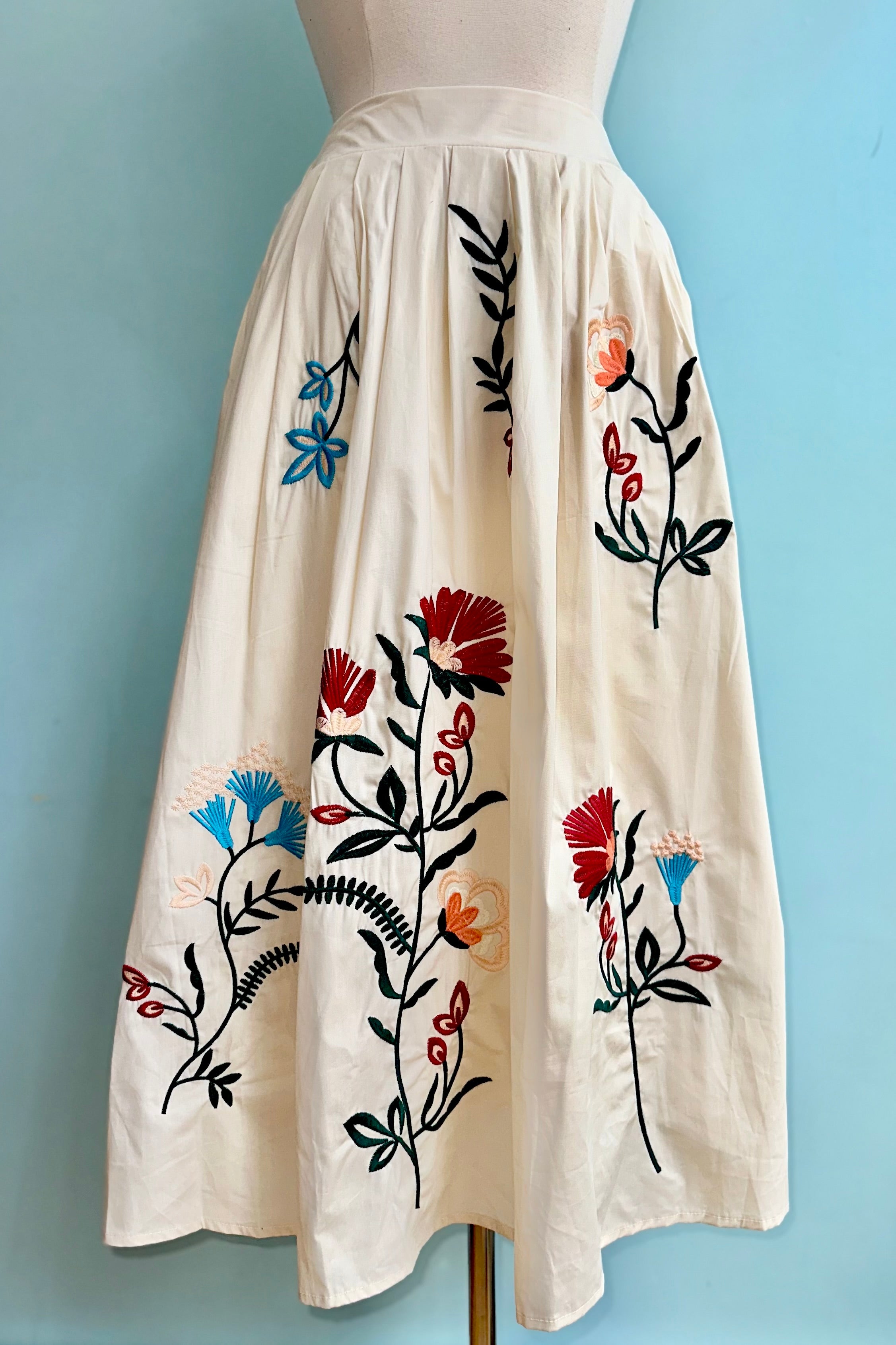 Cream skirt with embroidered flowers throughout. This skirt is a lined midi length with side pockets, and an elastic back waist.