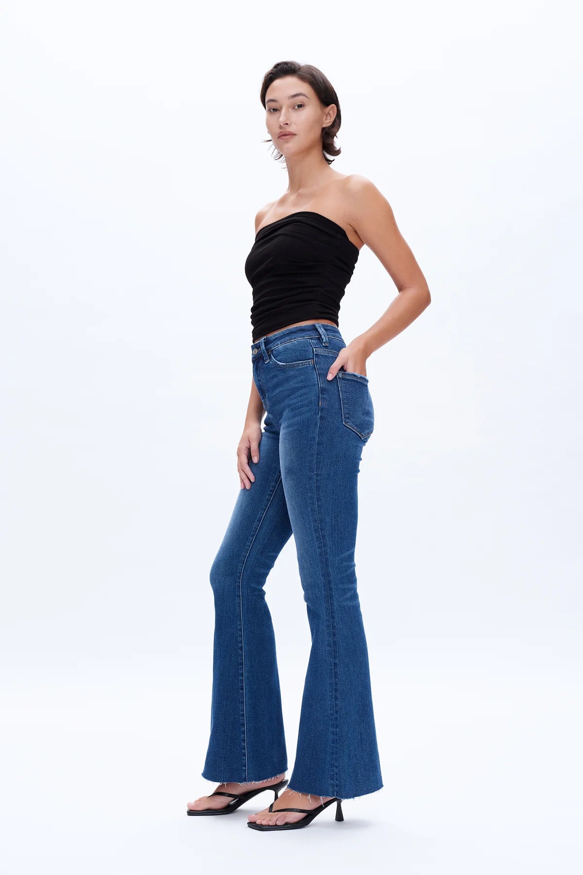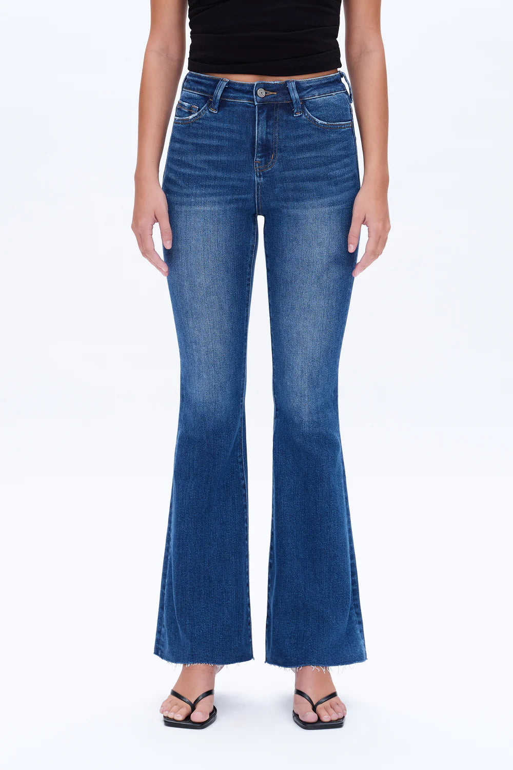 Flare Medium Wash High Rise Raw Hem Jeans by Bayeas