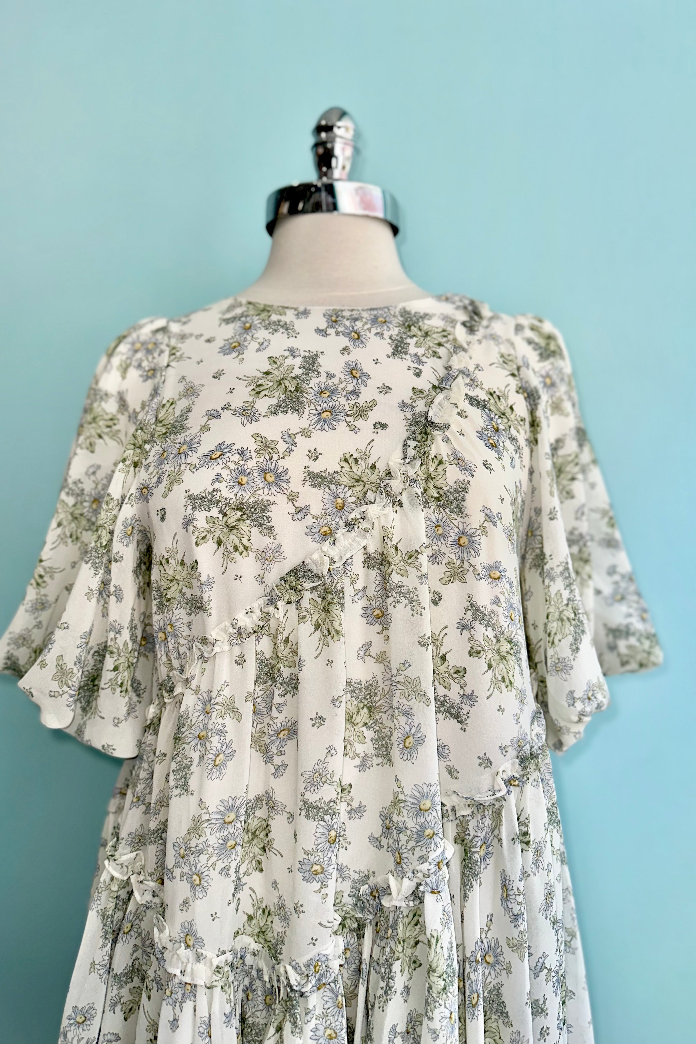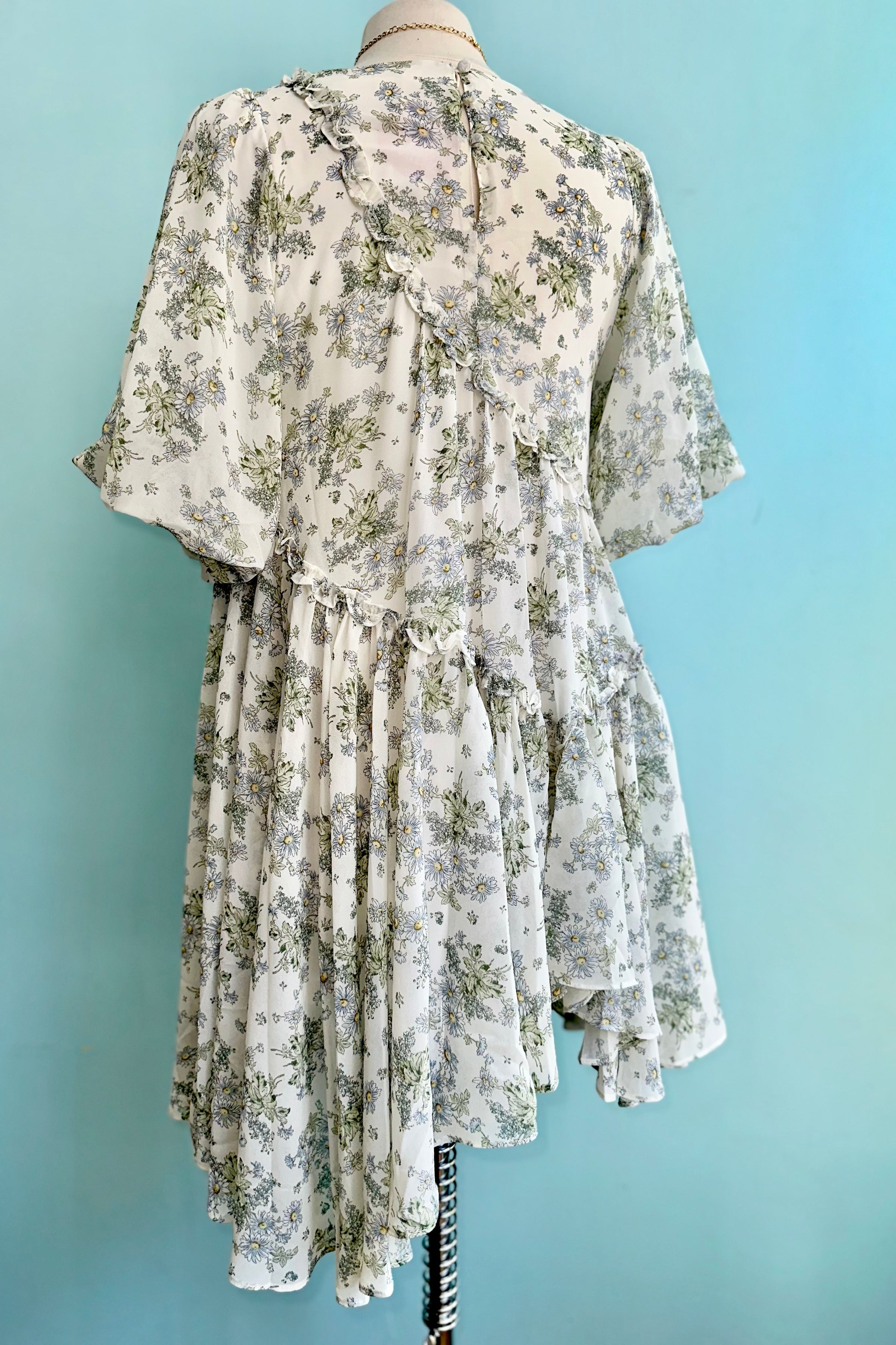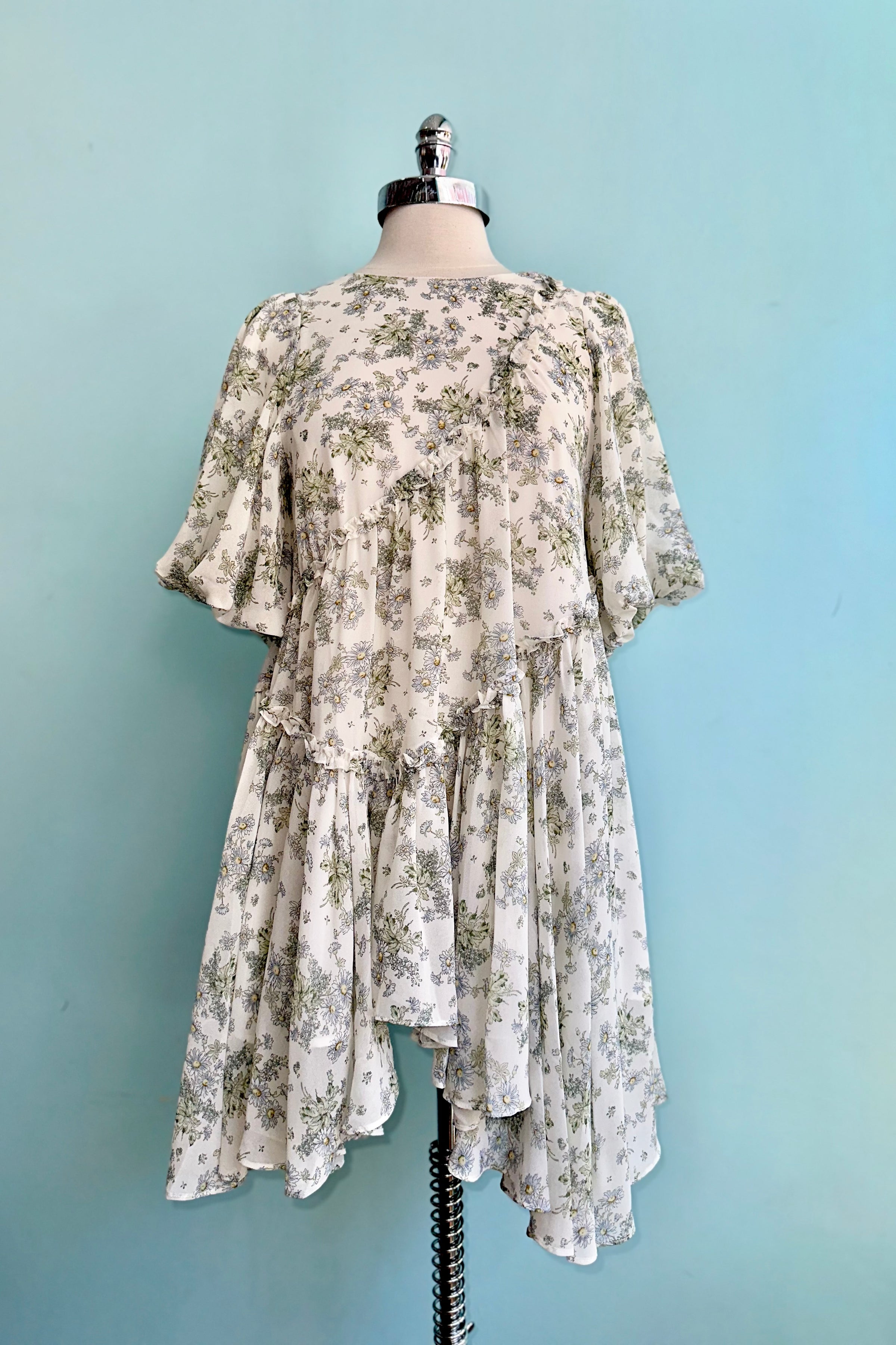 Rounded neck mini dress with a handkerchief hem, ruffle detail and bubble sleeves.  The fabric is white chiffon with little blue flowers with green leaves throughout.  The closure is a keyhole fastener in the back neck.