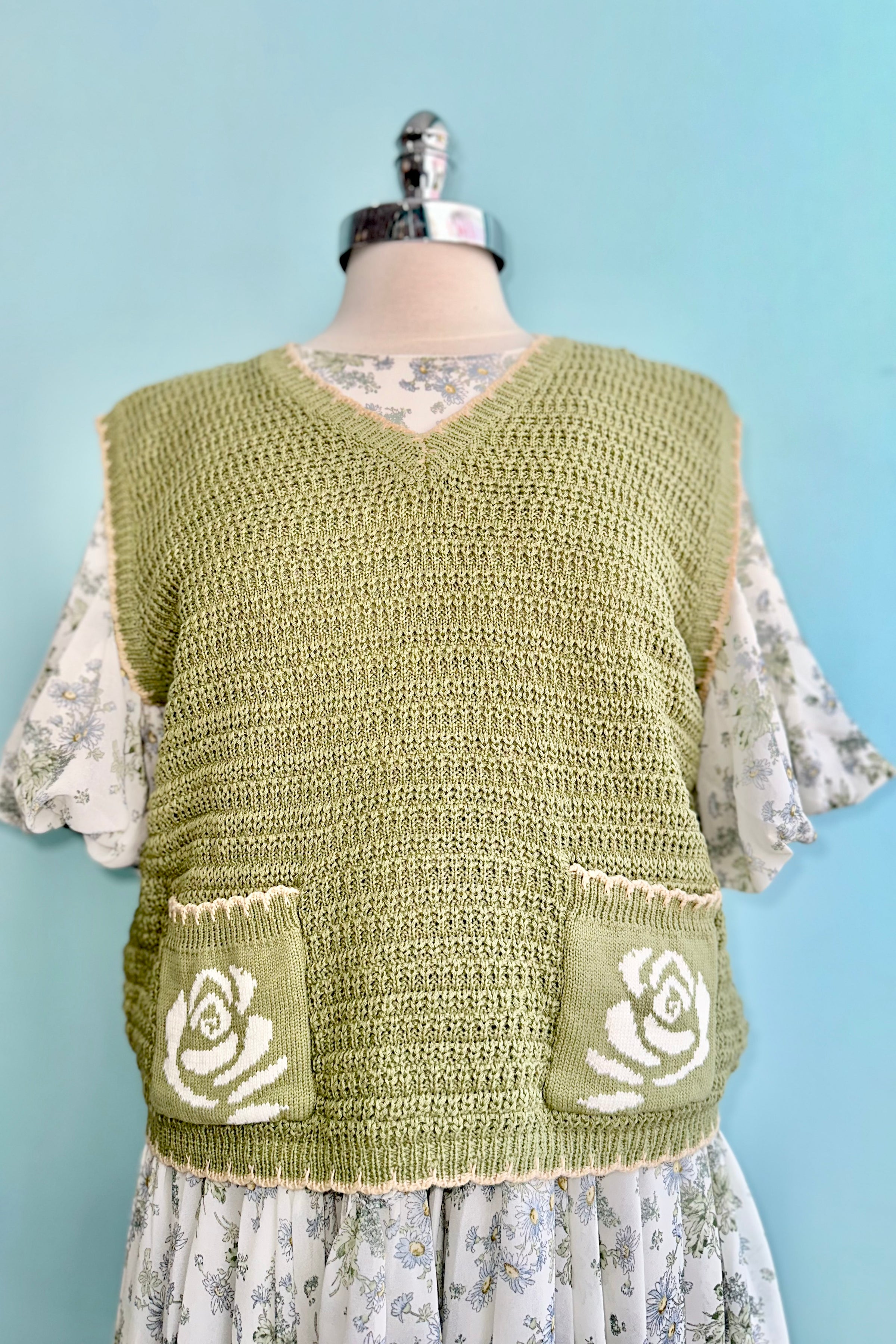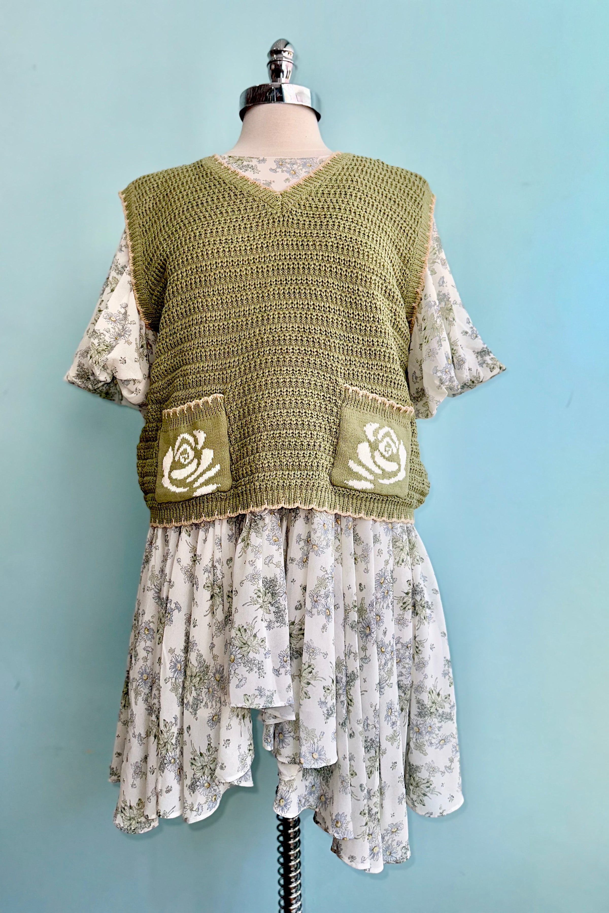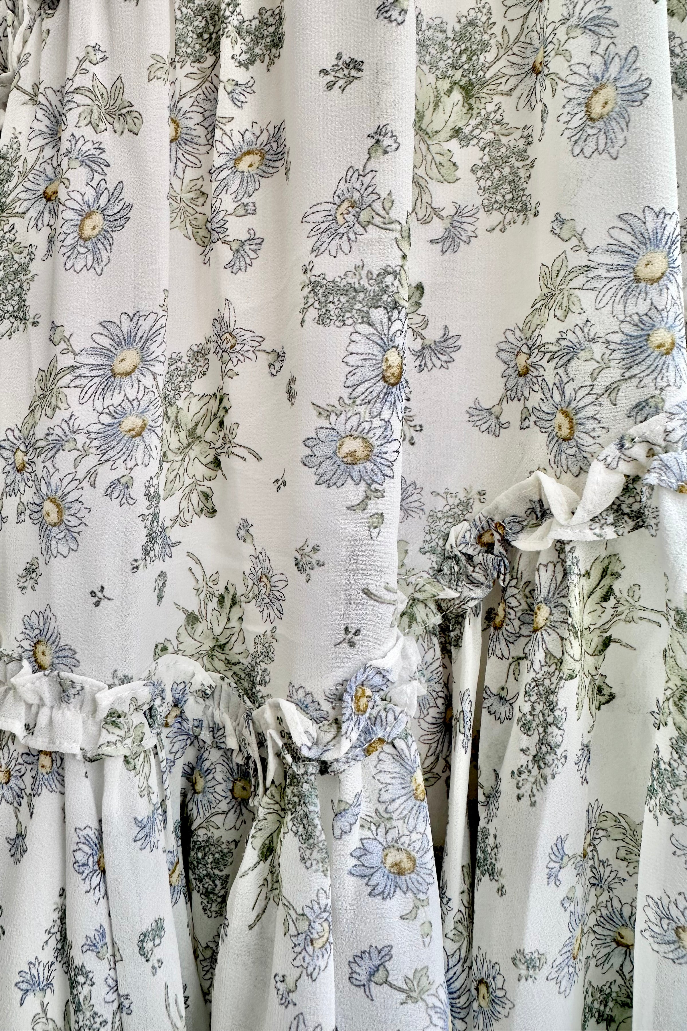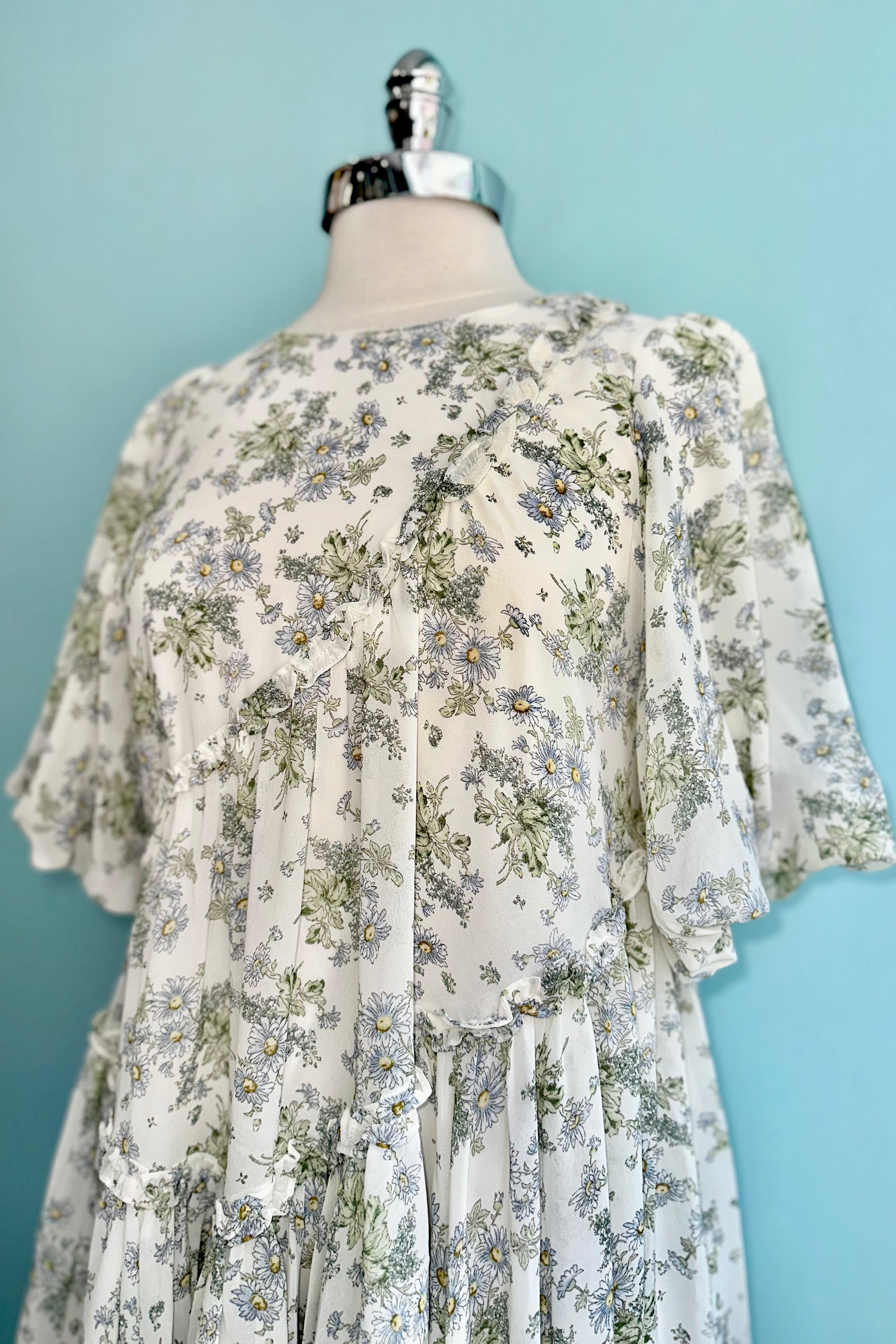 Rounded neck mini dress with a handkerchief hem, ruffle detail and bubble sleeves.  The fabric is white chiffon with little blue flowers with green leaves throughout.  The closure is a keyhole fastener in the back neck.