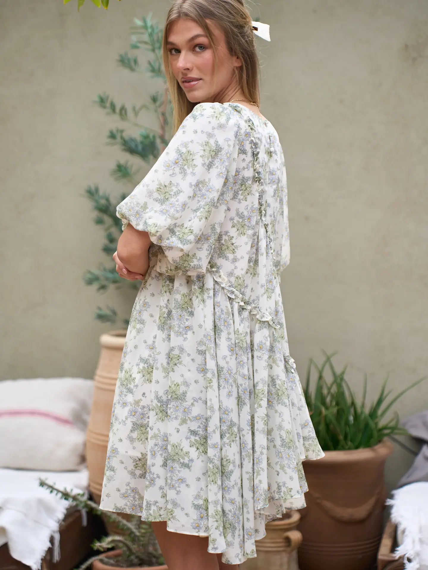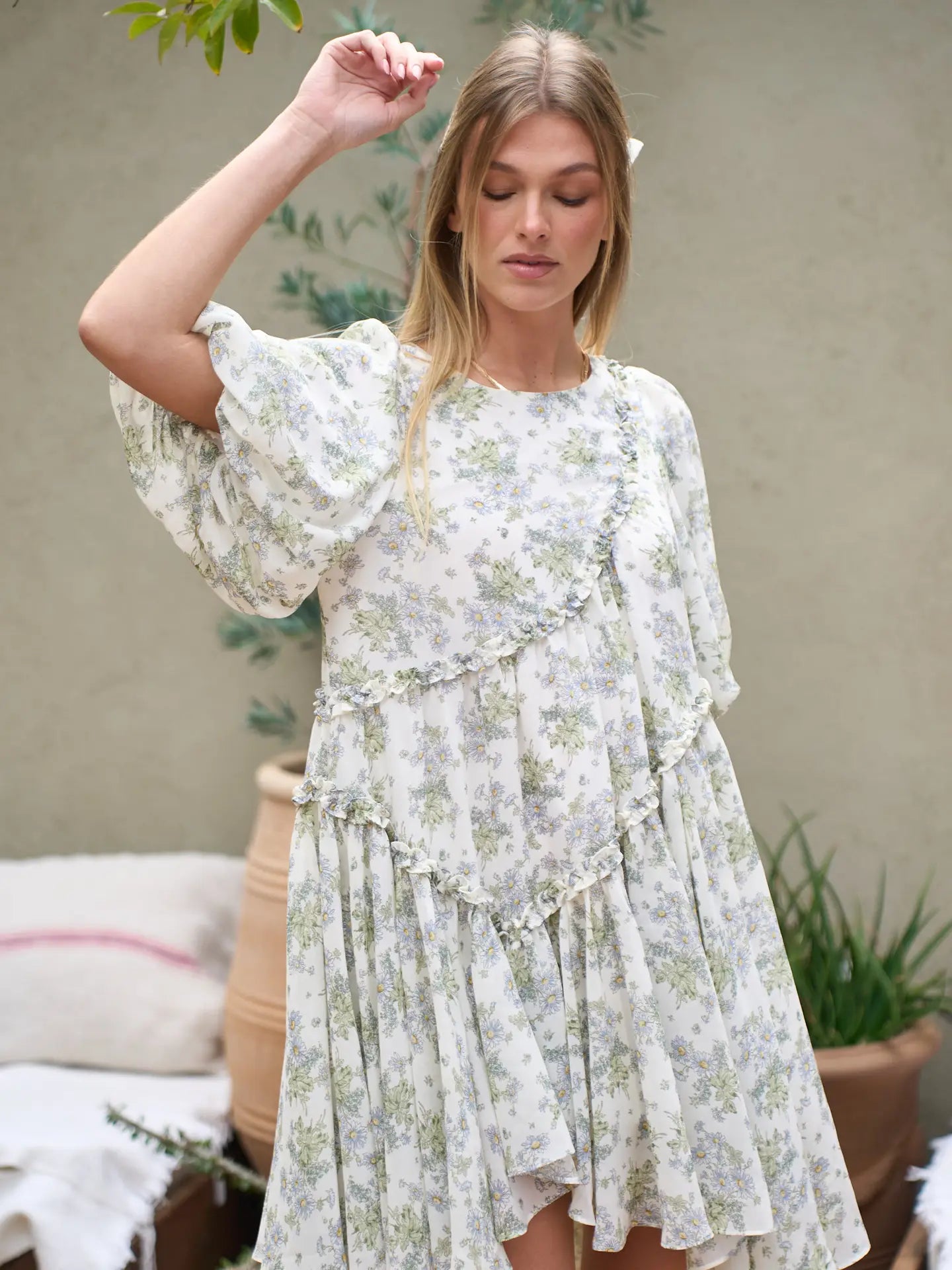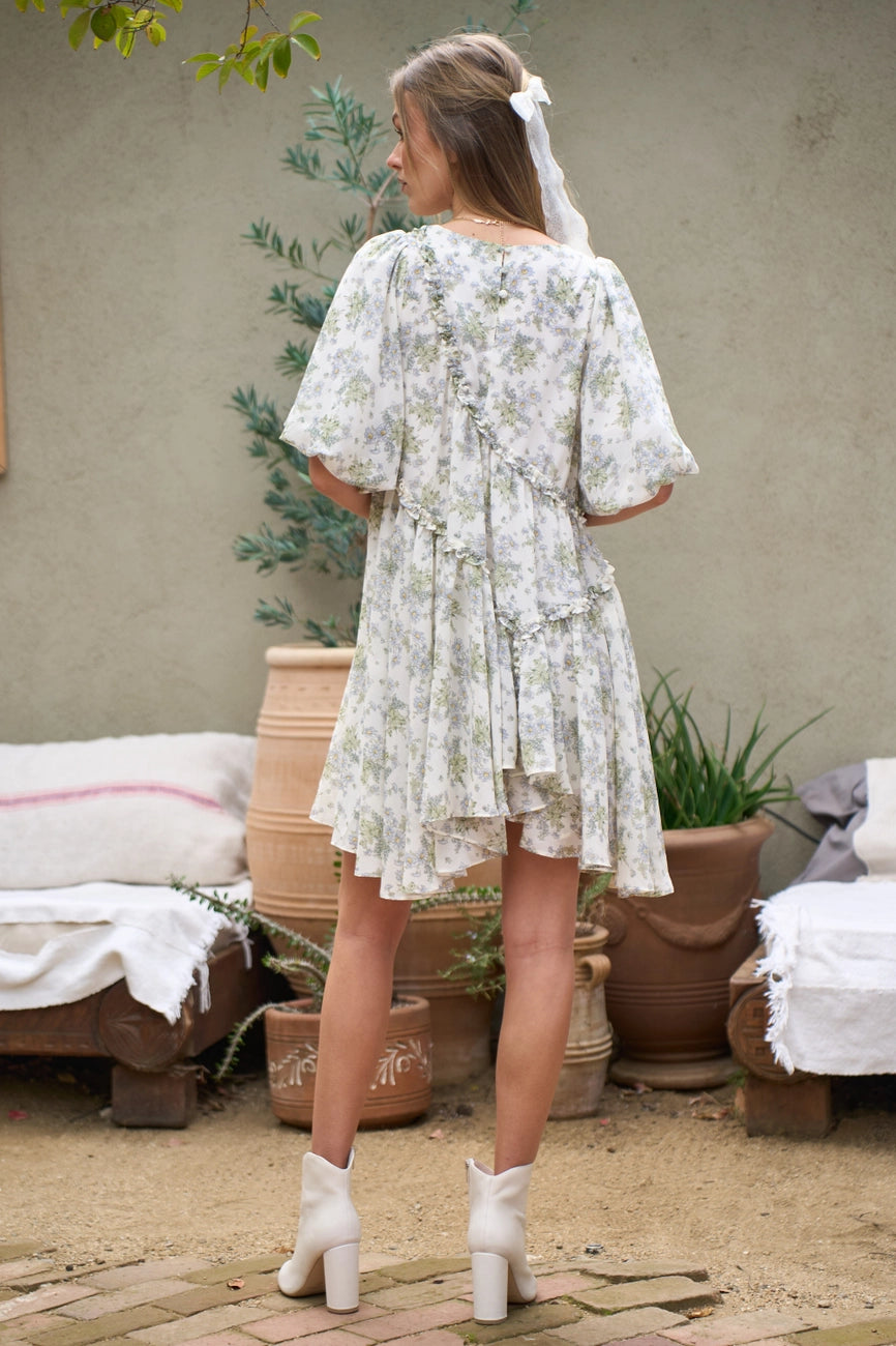 Floral Ruffle and Bubble Sleeve Mini Dress in White