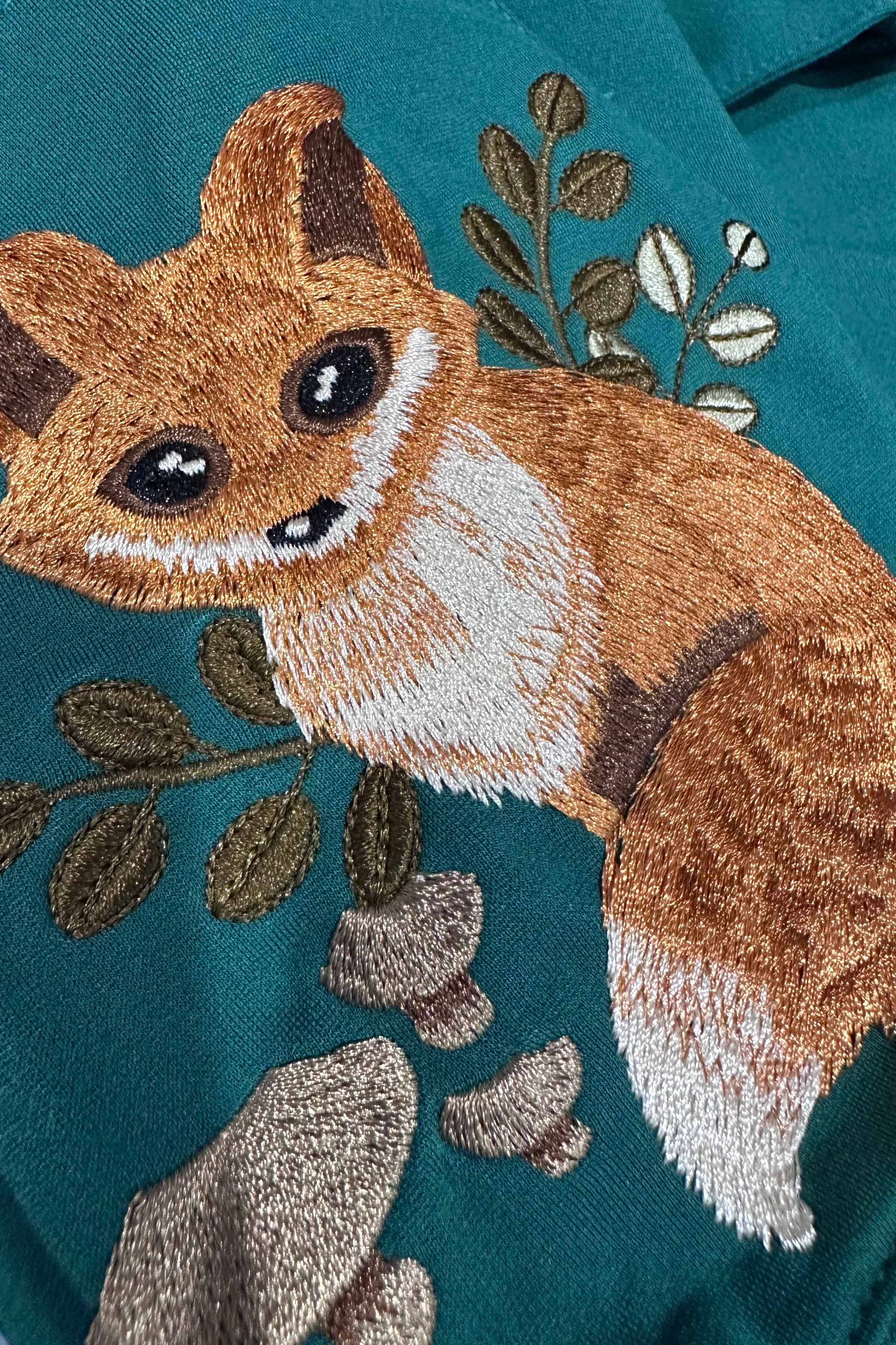 Green high waisted skirt with attached suspenders. There are embroidered mushrooms at the center waist and the pockets have the most adorable embroidered baby foxes! The straps are adjustable with a button in the back. The closure is a back zip. Not lined.