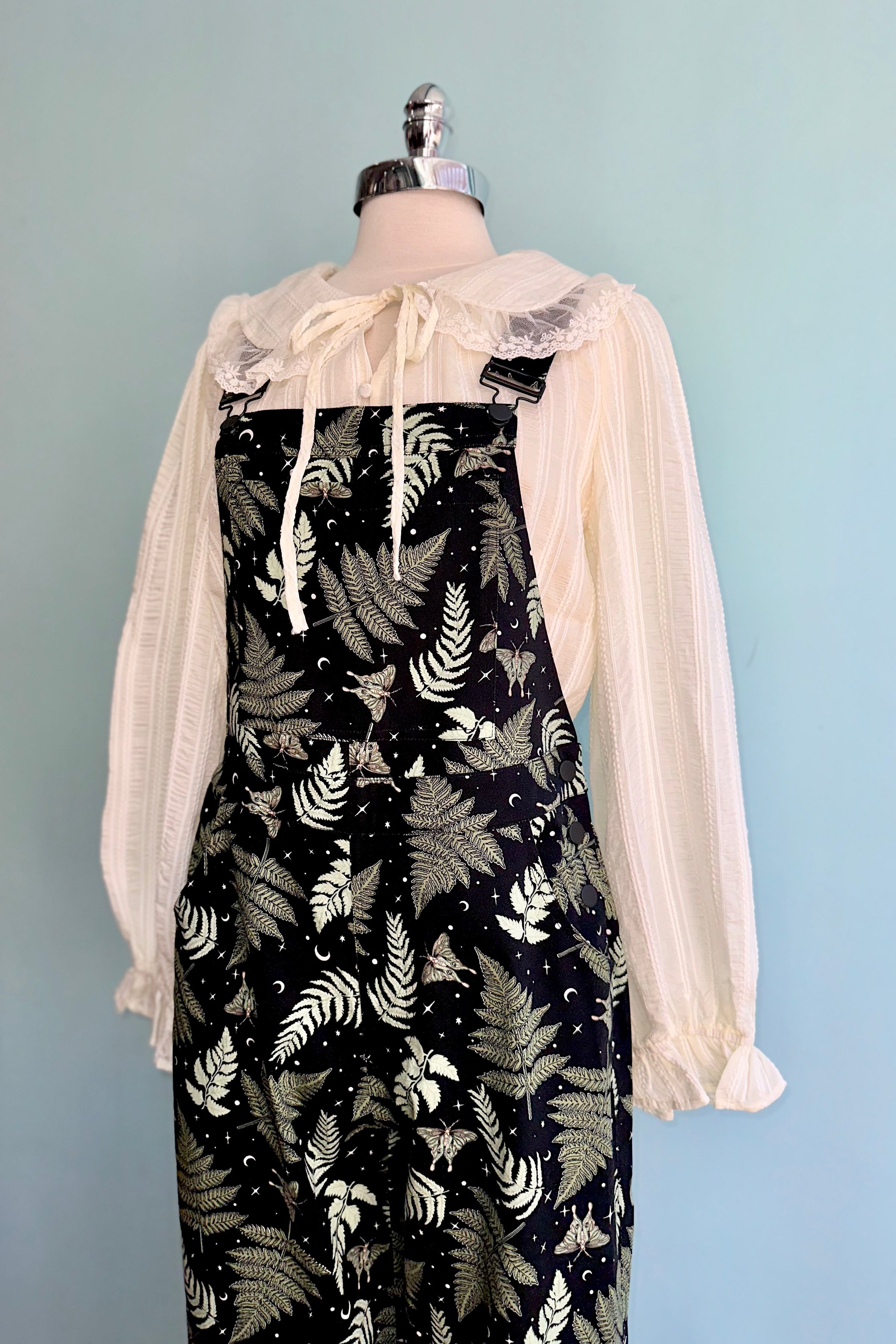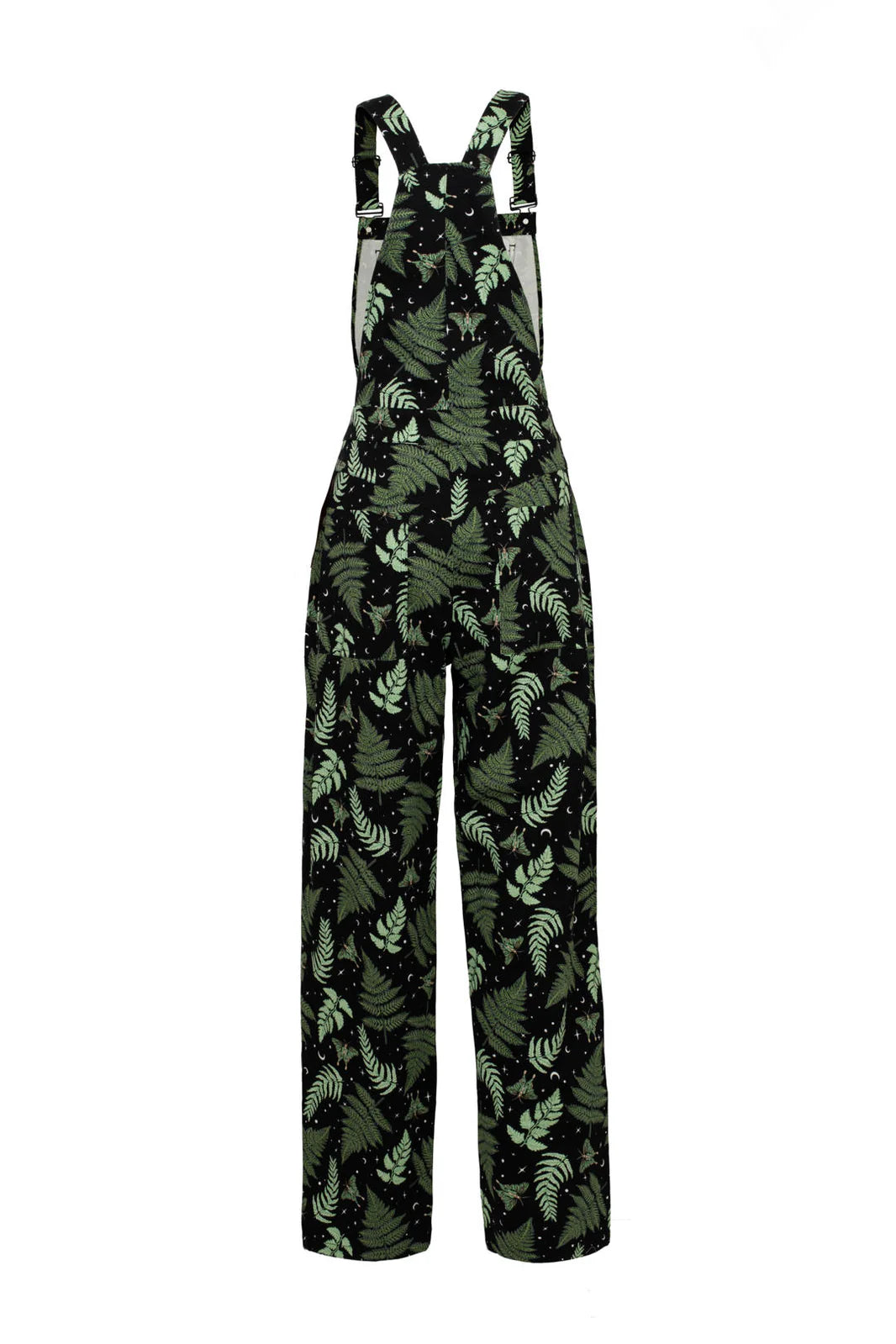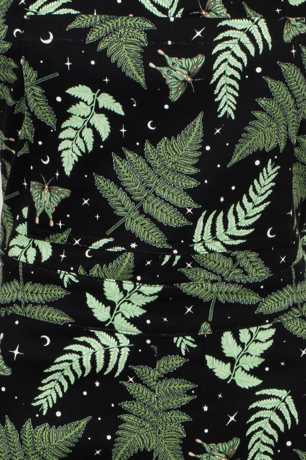 Overalls in our beloved Gaia print! These overalls are black with green moths and leaves and has little stars and moons throughout. These are classic overalls with the front pocketed bib and adjustable straps. There are three buttons on each side of the hips for closure. The pant legs taper a little and can be folded a few inches because the hem is faced in the same fabric. There are front side pockets and two back pockets.