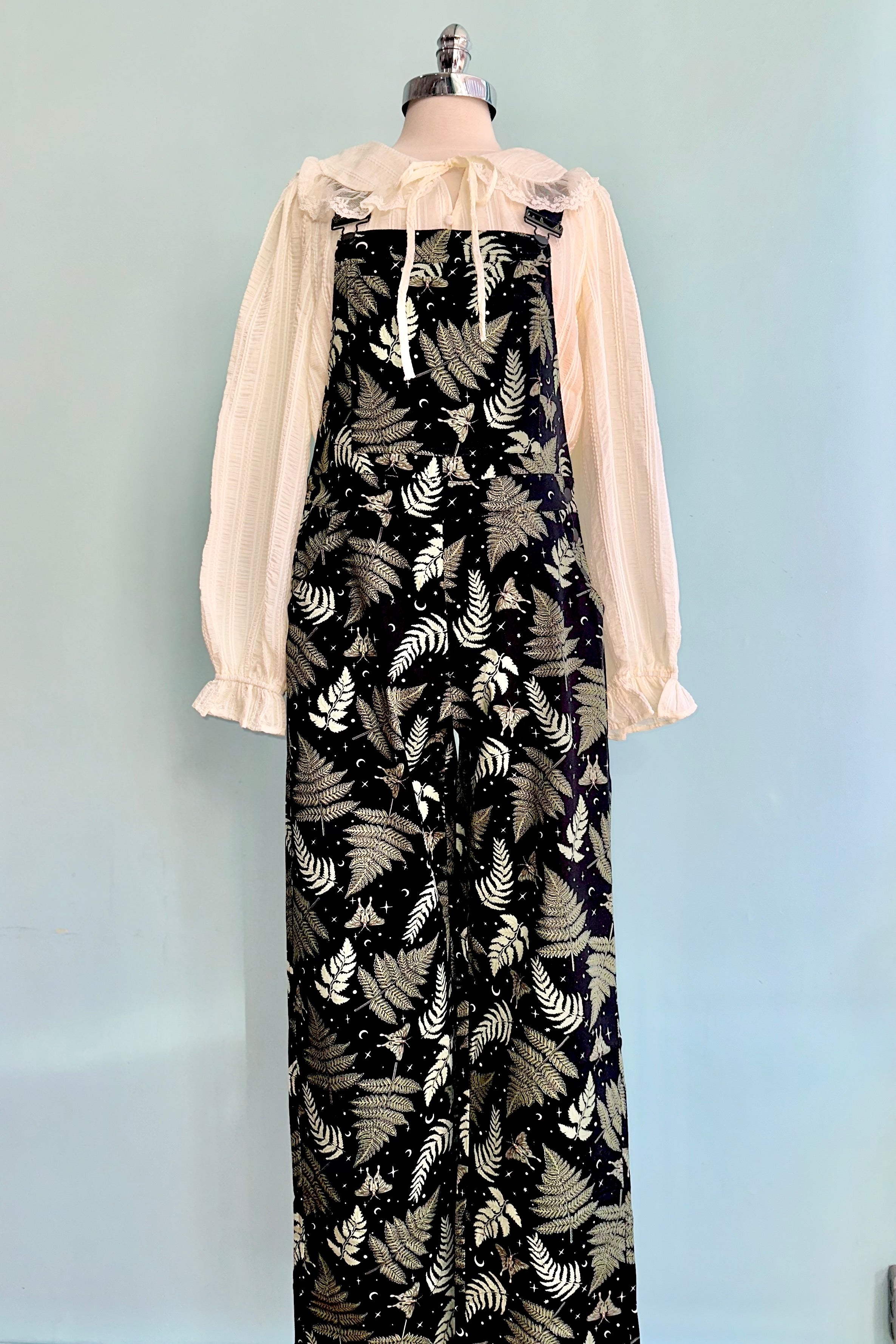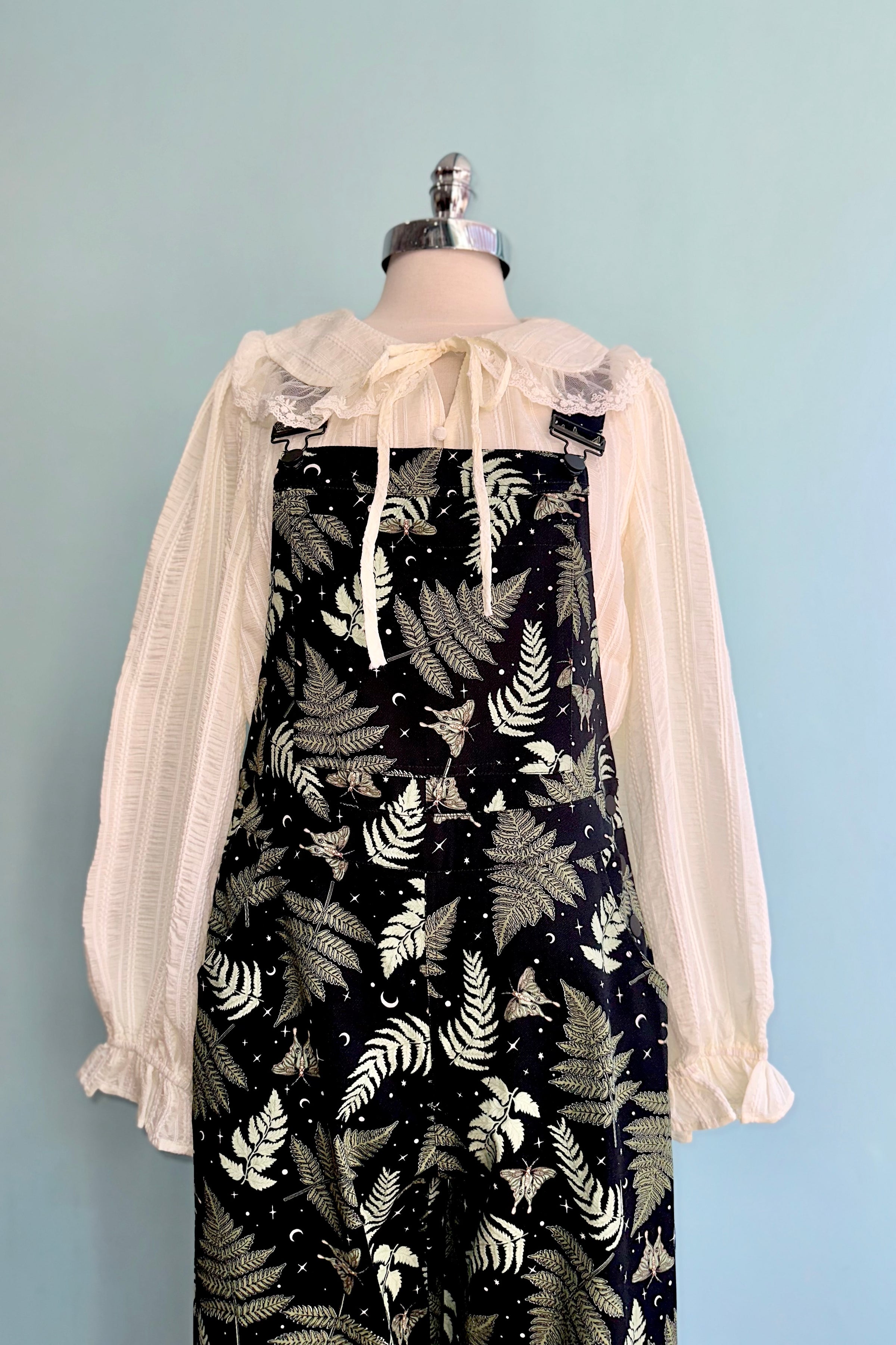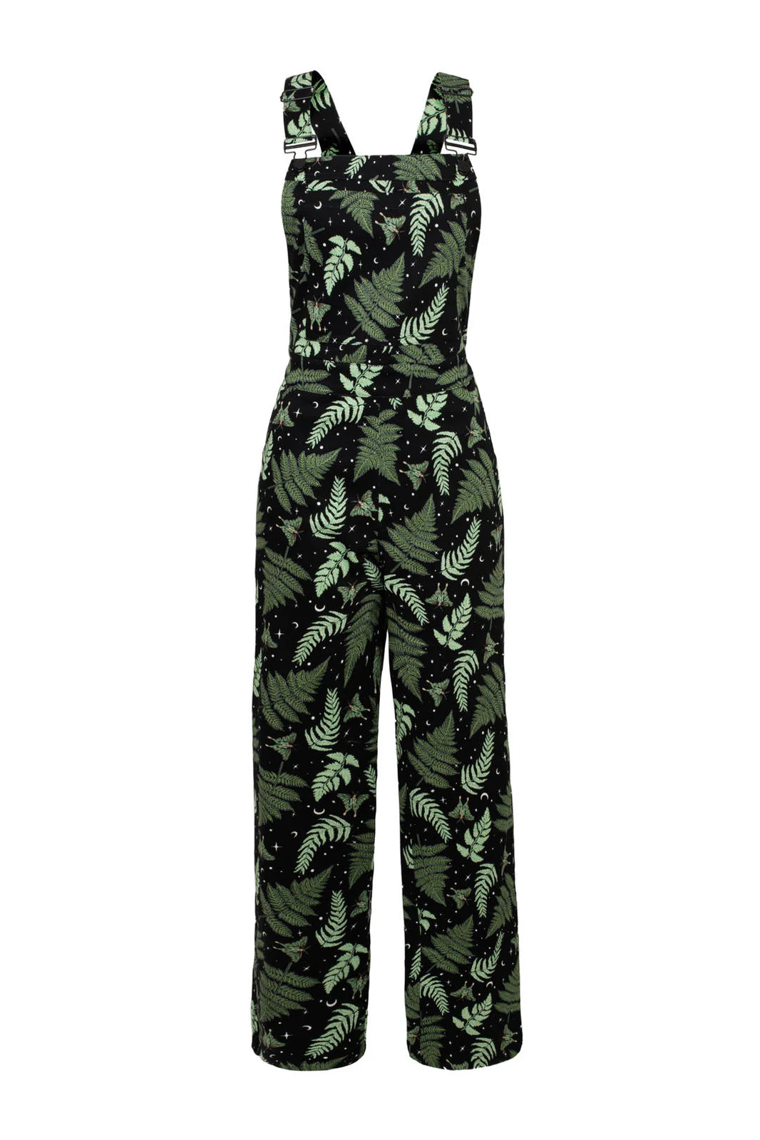 Overalls in our beloved Gaia print! These overalls are black with green moths and leaves and has little stars and moons throughout. These are classic overalls with the front pocketed bib and adjustable straps. There are three buttons on each side of the hips for closure. The pant legs taper a little and can be folded a few inches because the hem is faced in the same fabric. There are front side pockets and two back pockets.