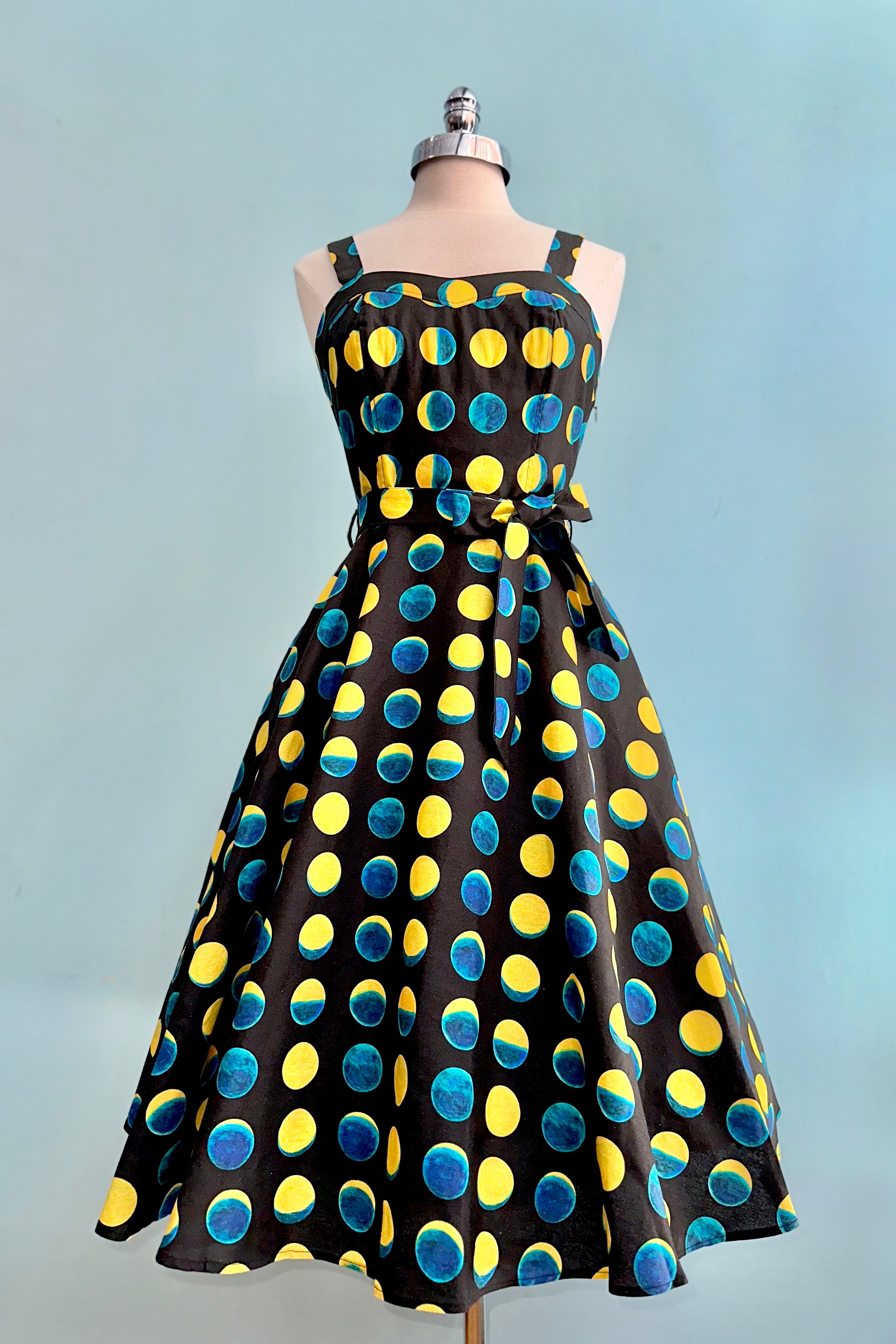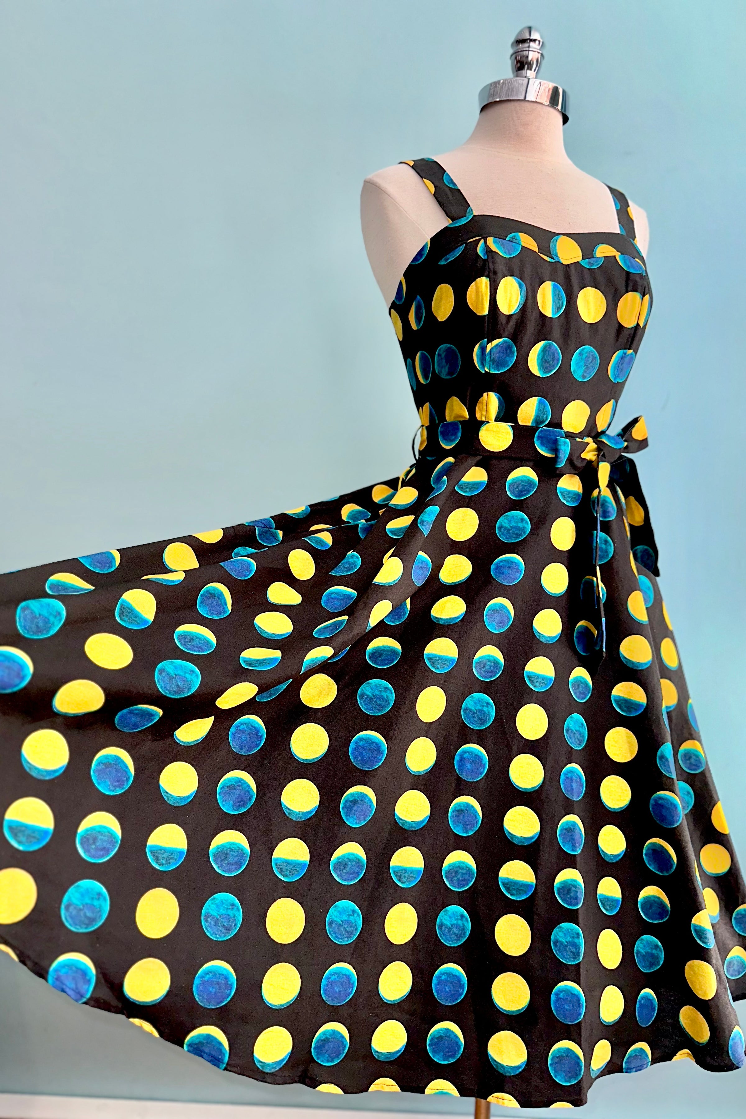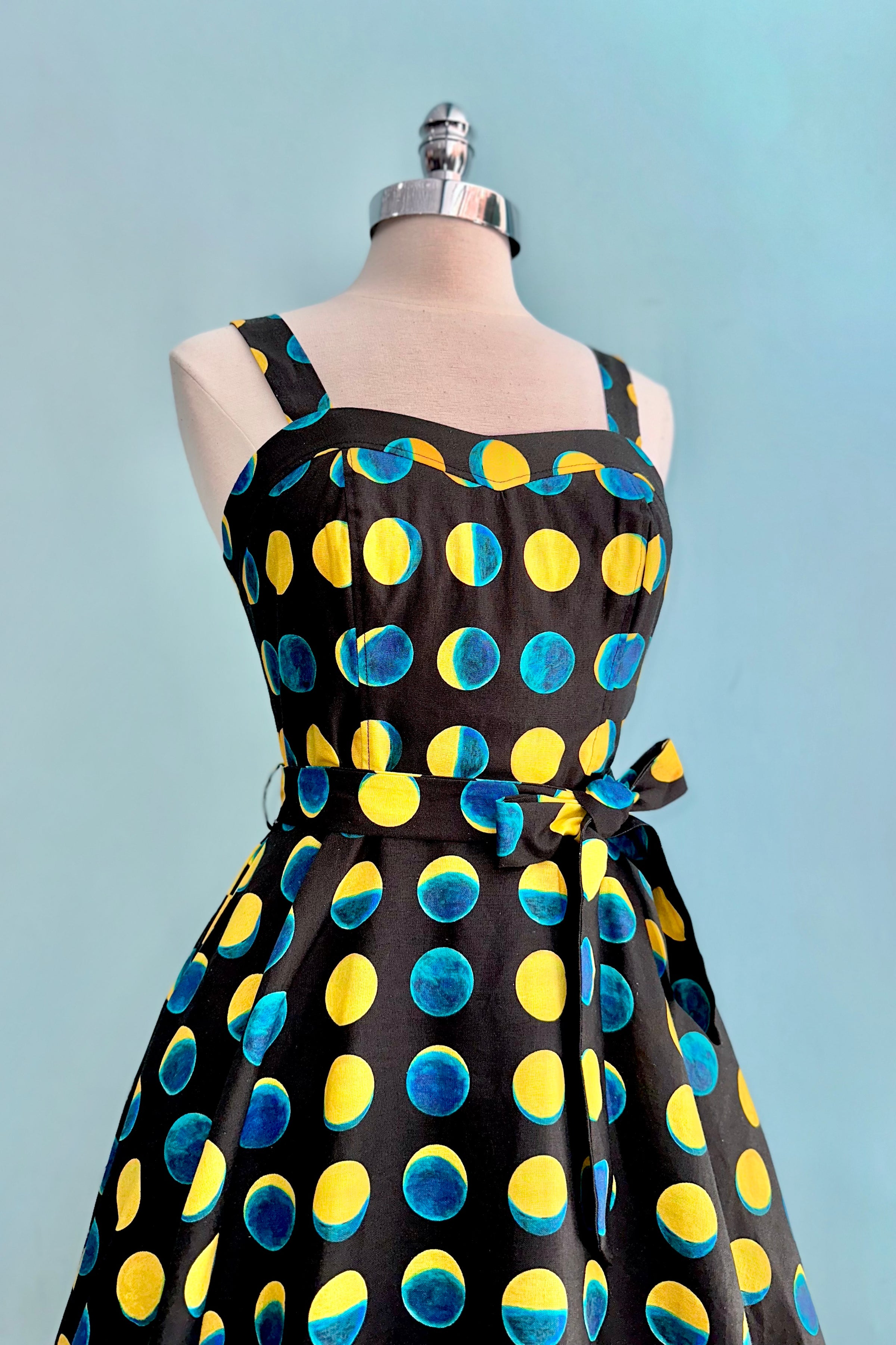 The Lori dress has a sweetheart neckline and adjustable straps.  The fabric is a stretch woven soy silk in black with a print of teal and yellow moon phases. This dress has a great fit!  The back bodice is smocked which allows ease of wear and comfort.  Zips up the side, is lined at the bodice, unlined skirt and has pockets! Original print artwork by Sweven Print Design.
