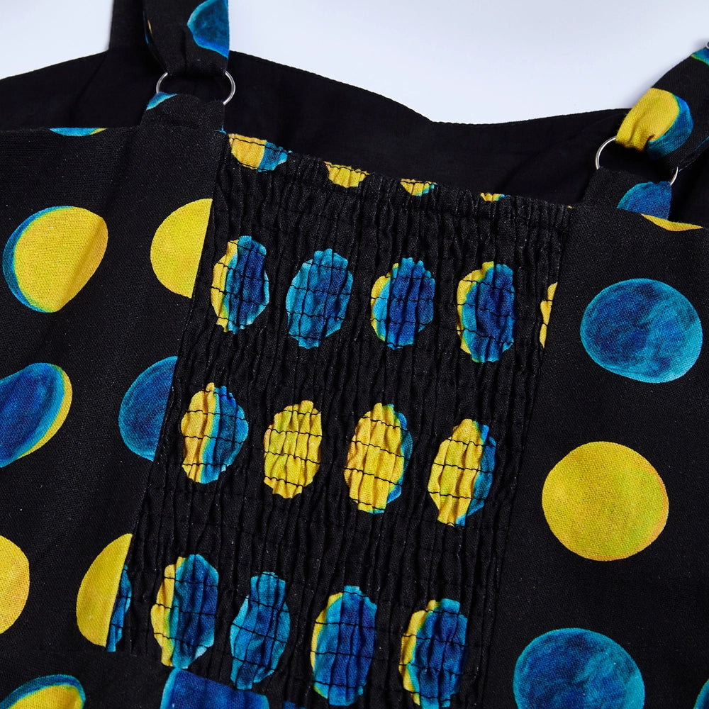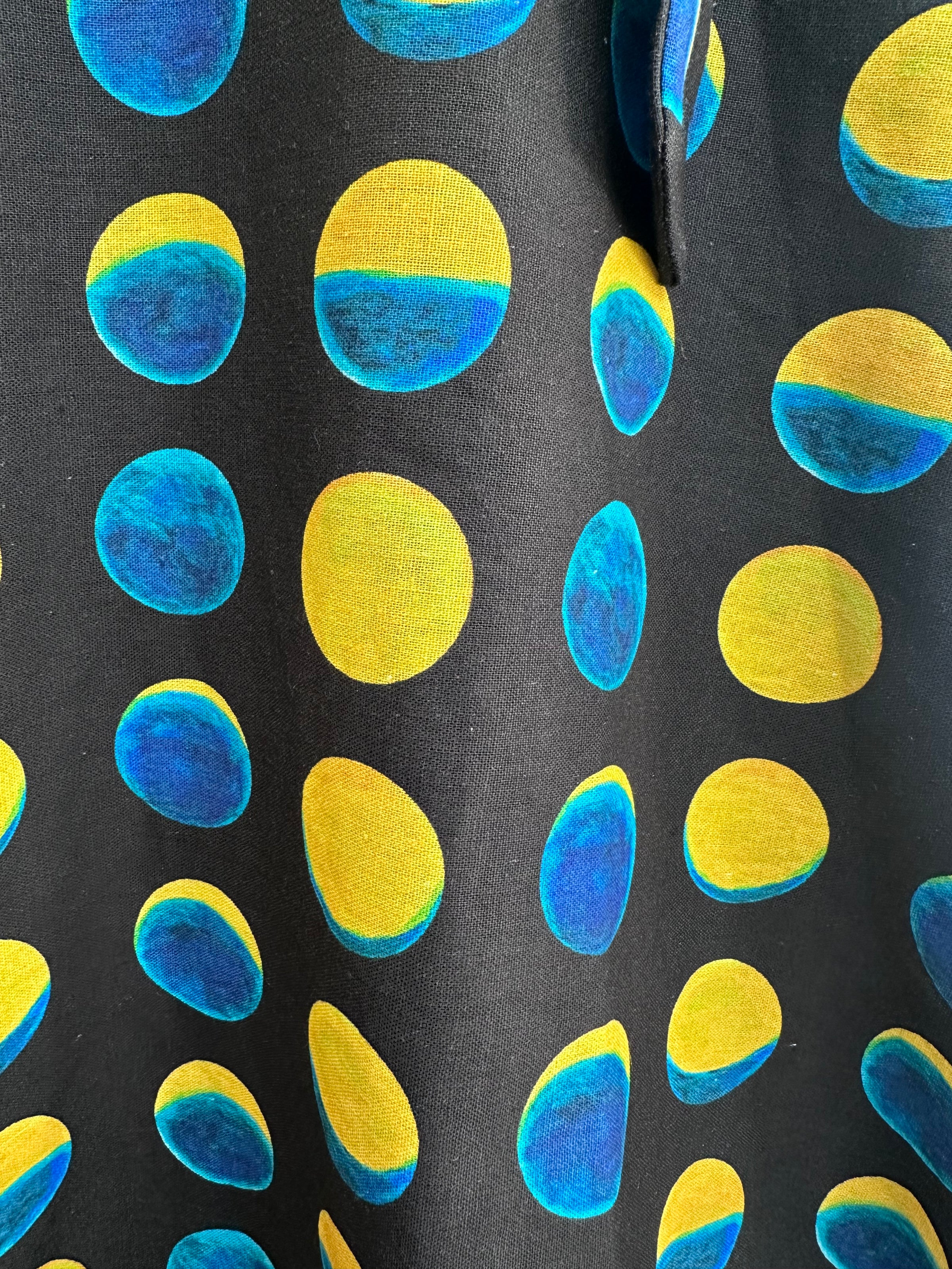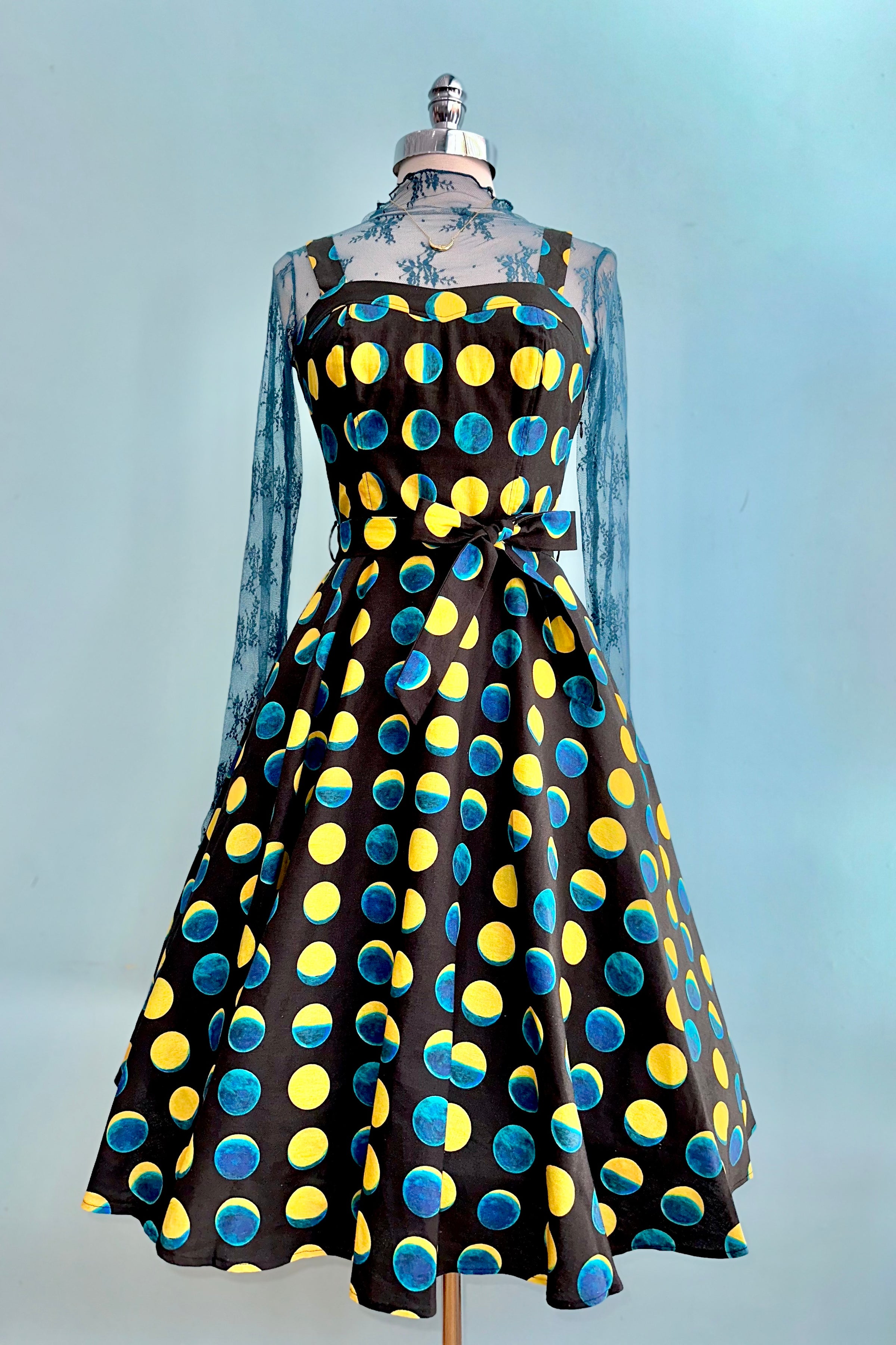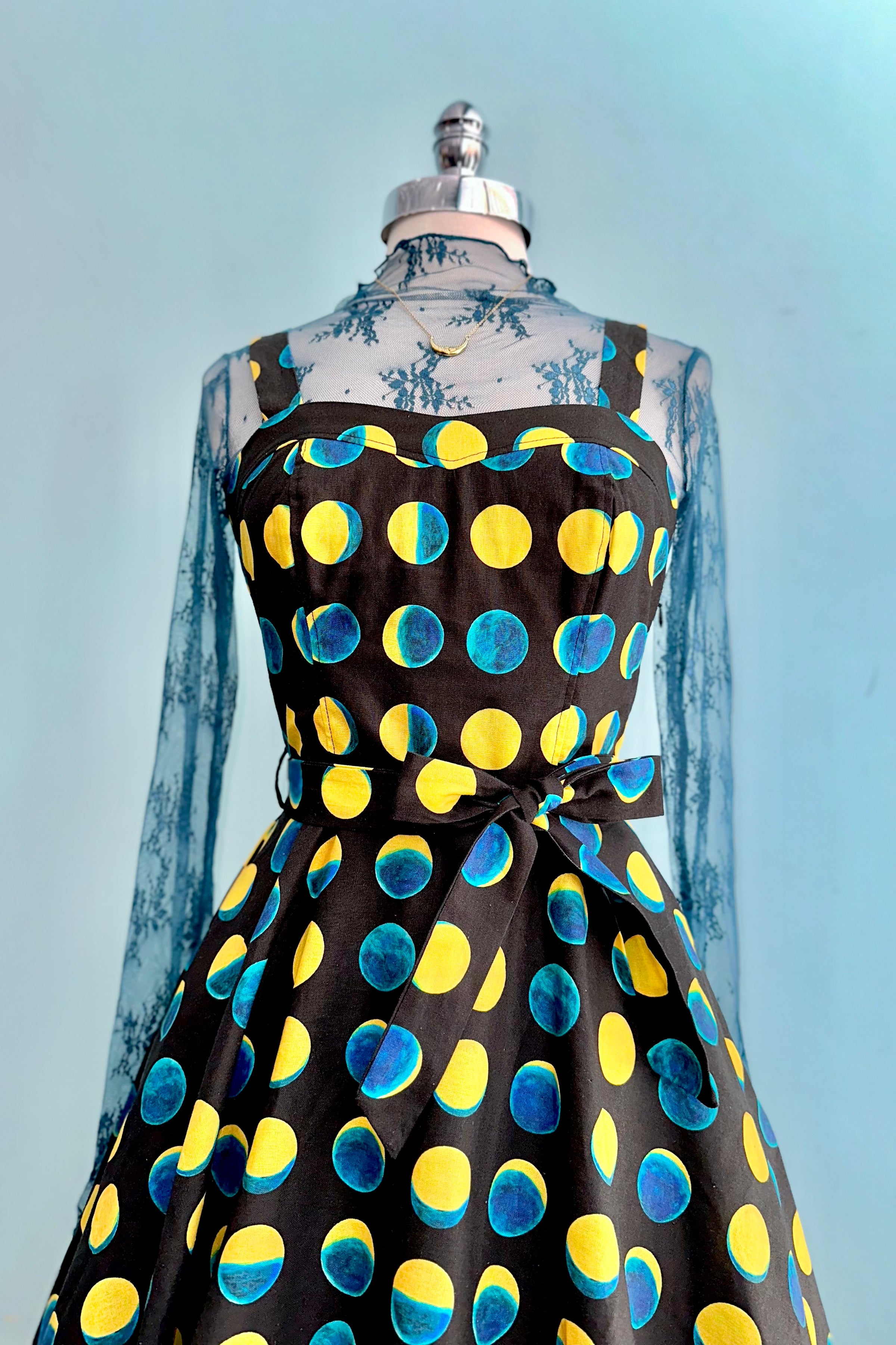 The Lori dress has a sweetheart neckline and adjustable straps.  The fabric is a stretch woven soy silk in black with a print of teal and yellow moon phases. This dress has a great fit!  The back bodice is smocked which allows ease of wear and comfort.  Zips up the side, is lined at the bodice, unlined skirt and has pockets! Original print artwork by Sweven Print Design.