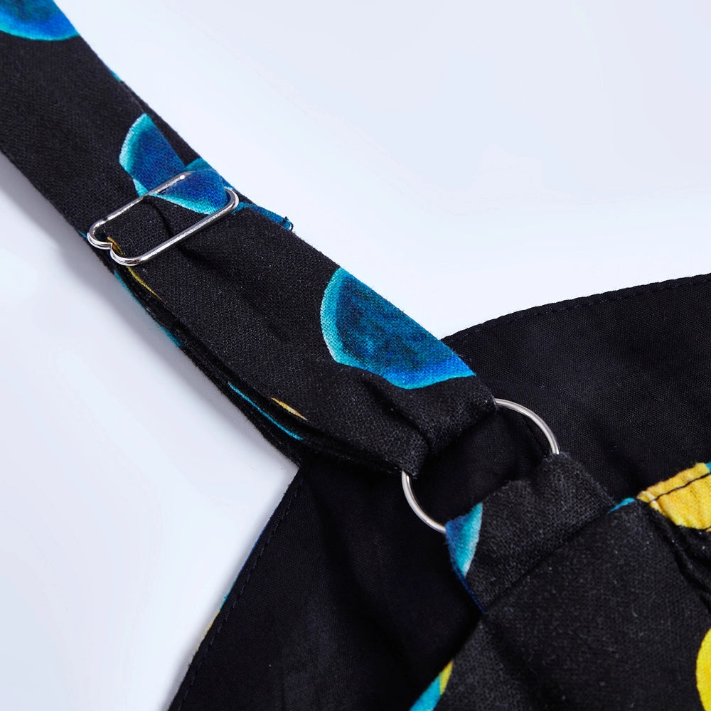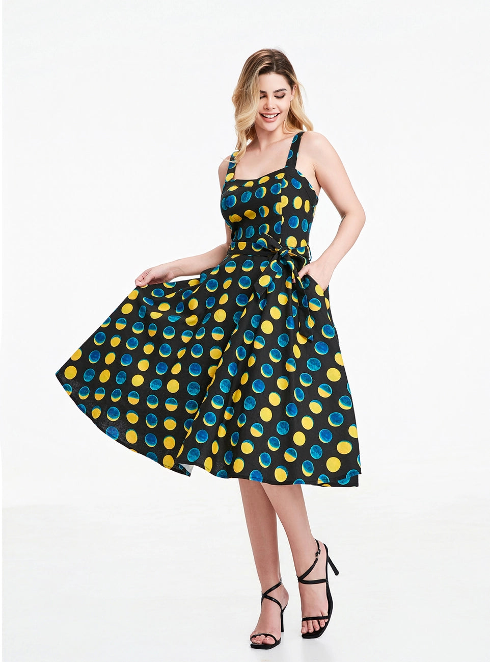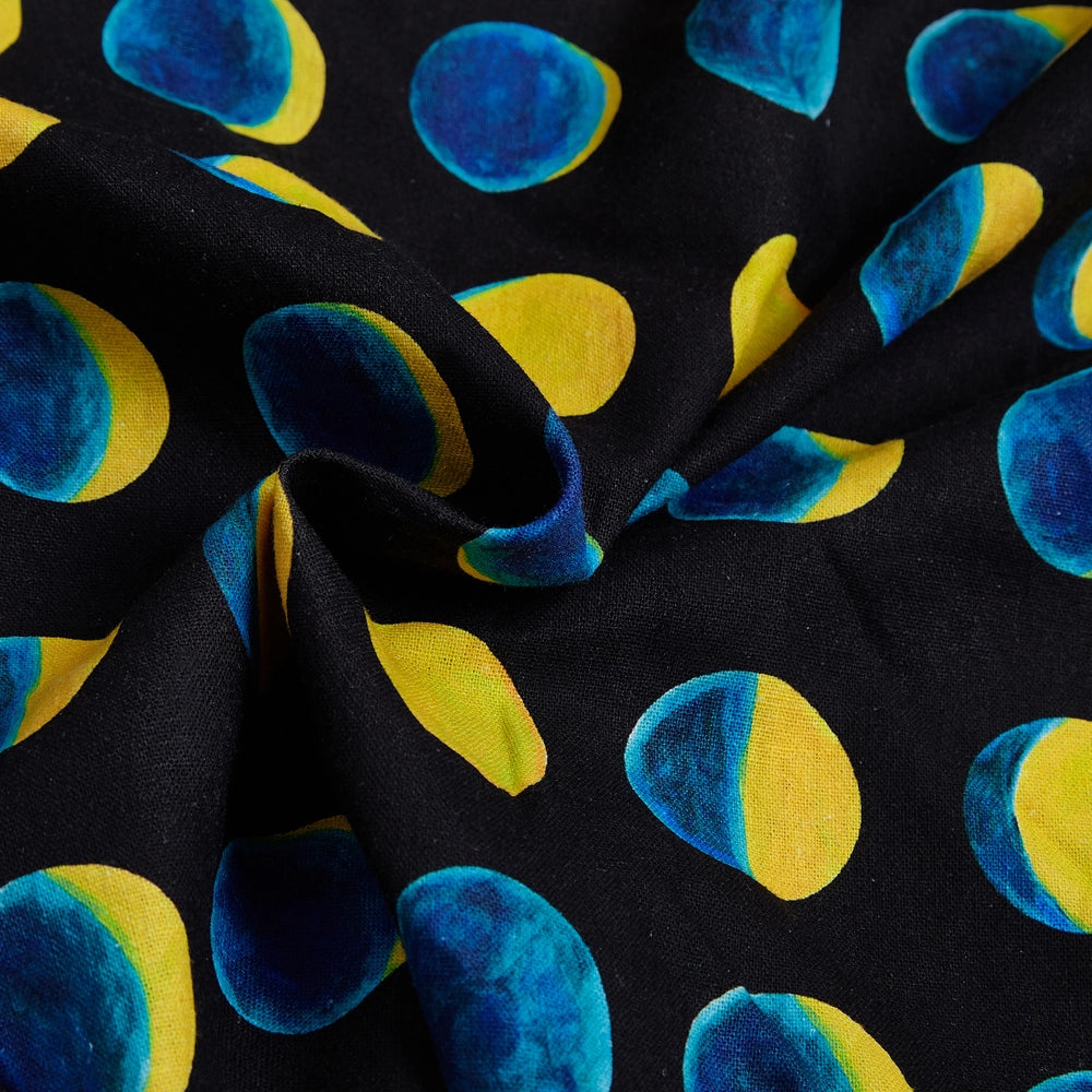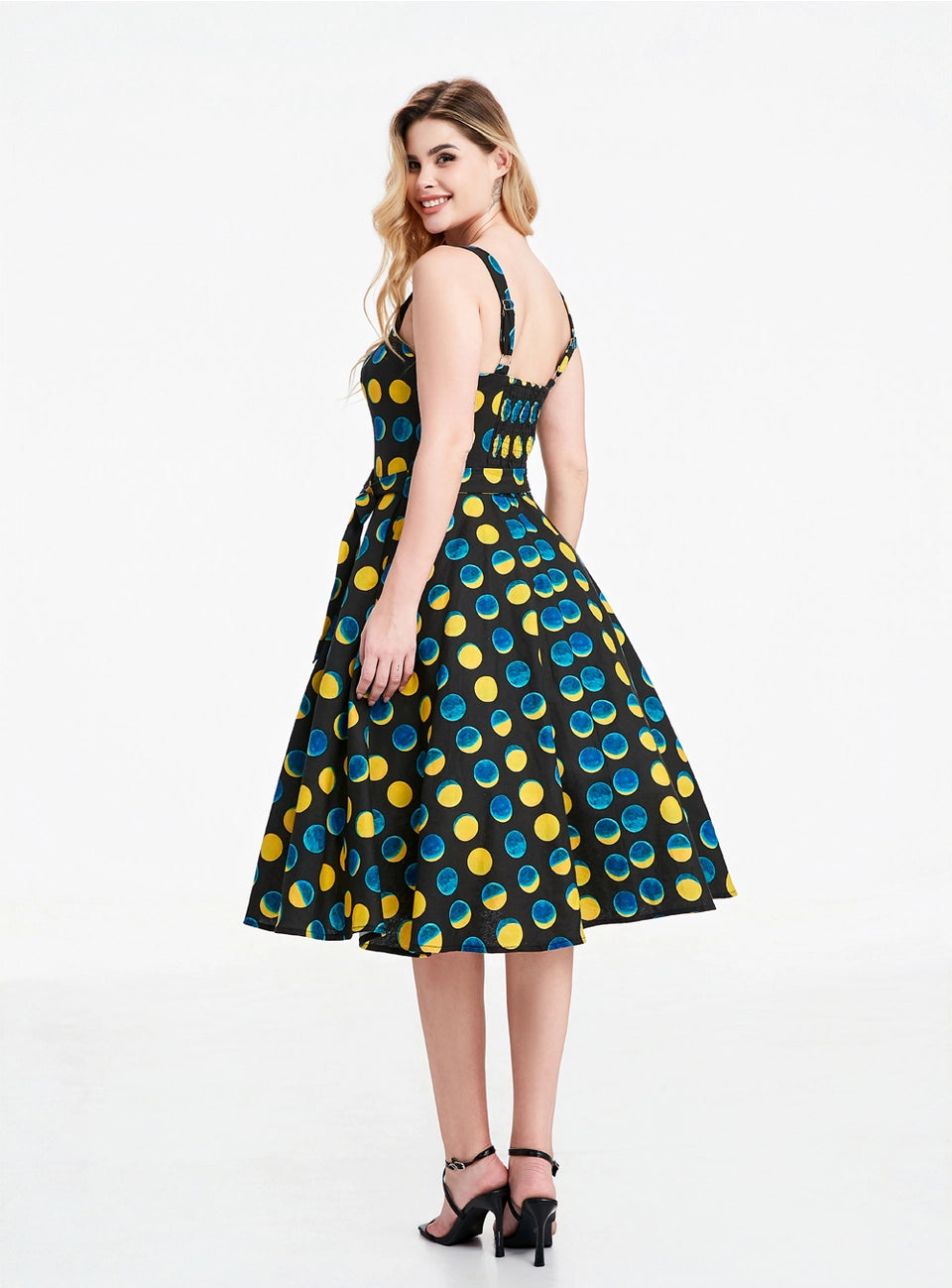 The Lori dress has a sweetheart neckline and adjustable straps.  The fabric is a stretch woven soy silk in black with a print of teal and yellow moon phases. This dress has a great fit!  The back bodice is smocked which allows ease of wear and comfort.  Zips up the side, is lined at the bodice, unlined skirt and has pockets! Original print artwork by Sweven Print Design.