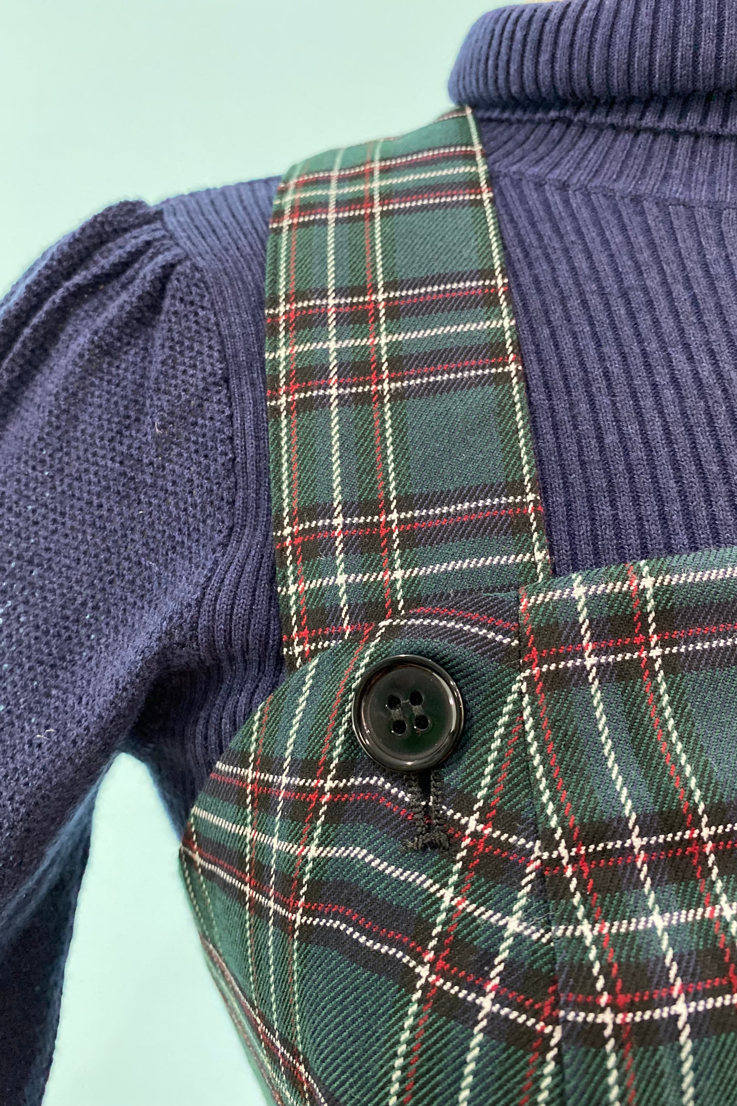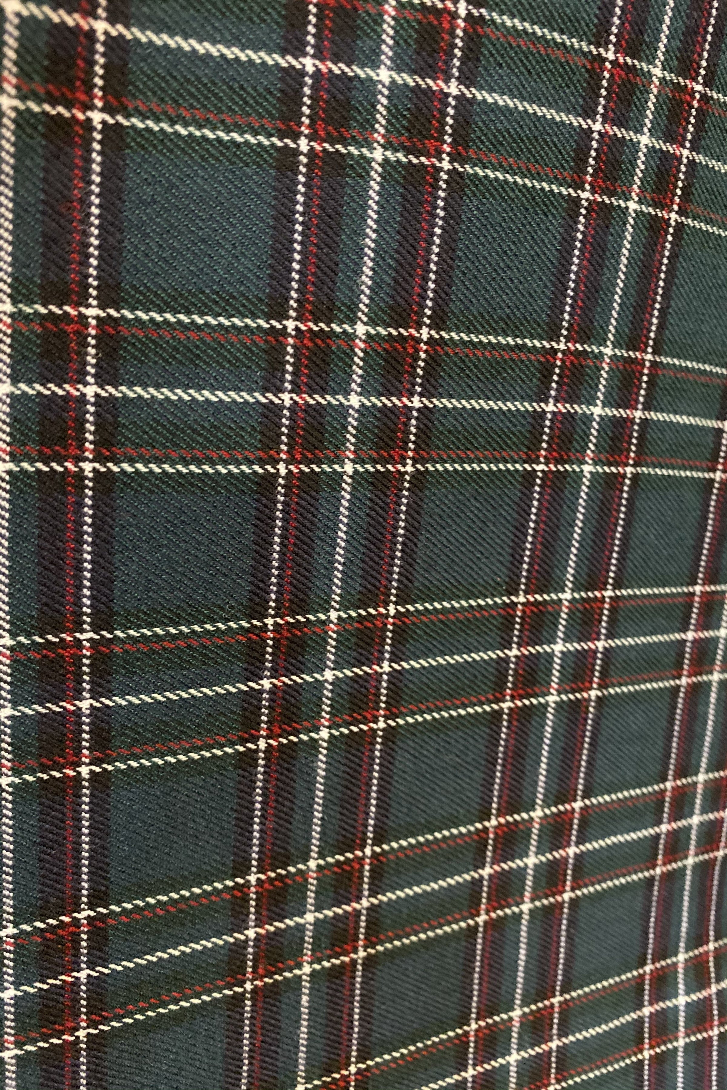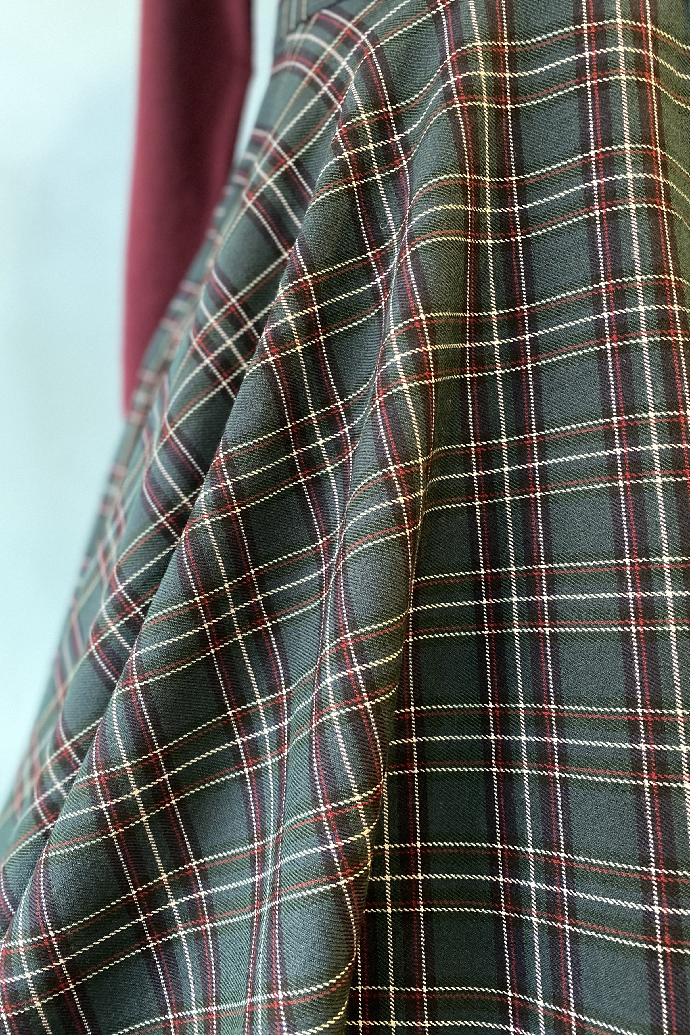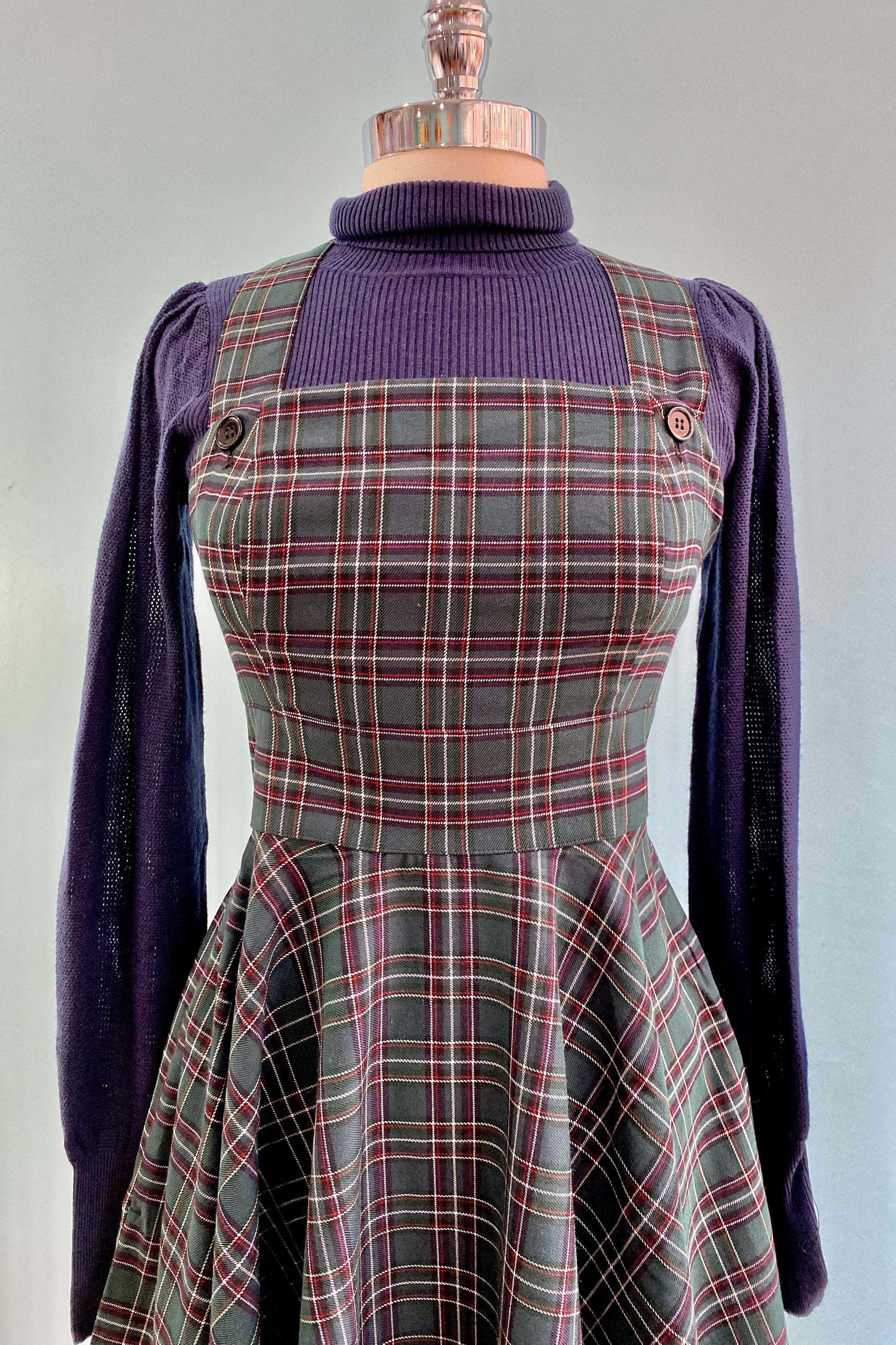 Green tartan pinafore dress with crossover straps that are adjustable.  This zips up the center back, has pockets and is not lined.  It has nice darting on the bodice for a great fit!  Fabric has a little ease.