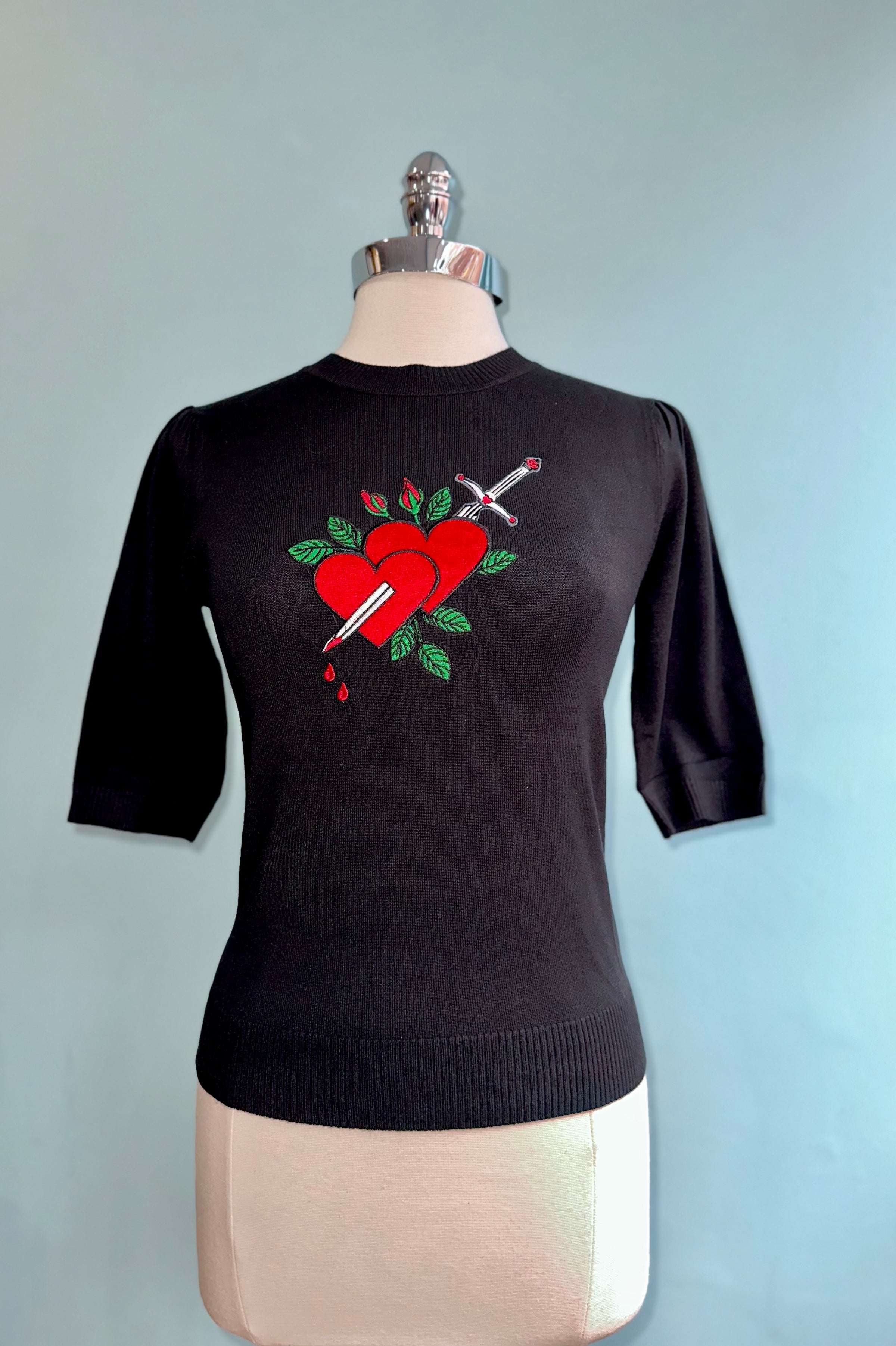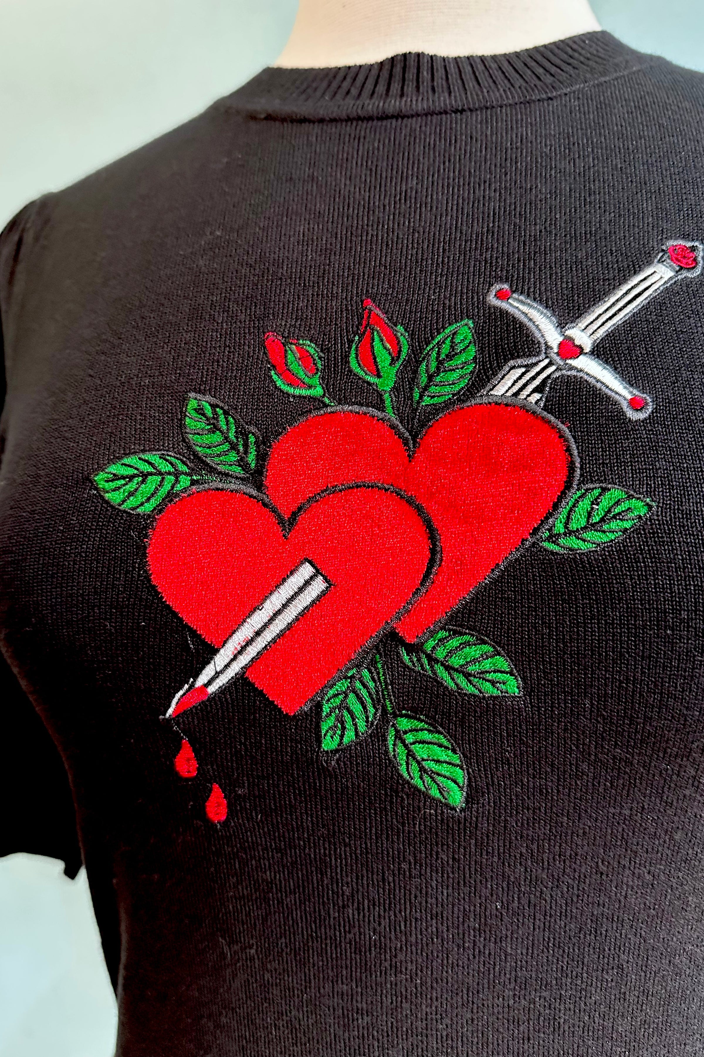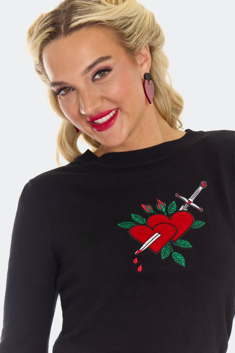 Heart and Dagger Embroidered Pullover Sweater in Black by Voodoo Vixen