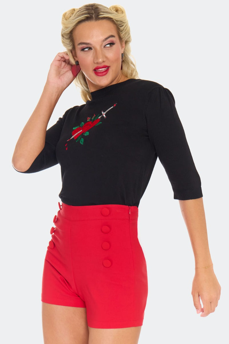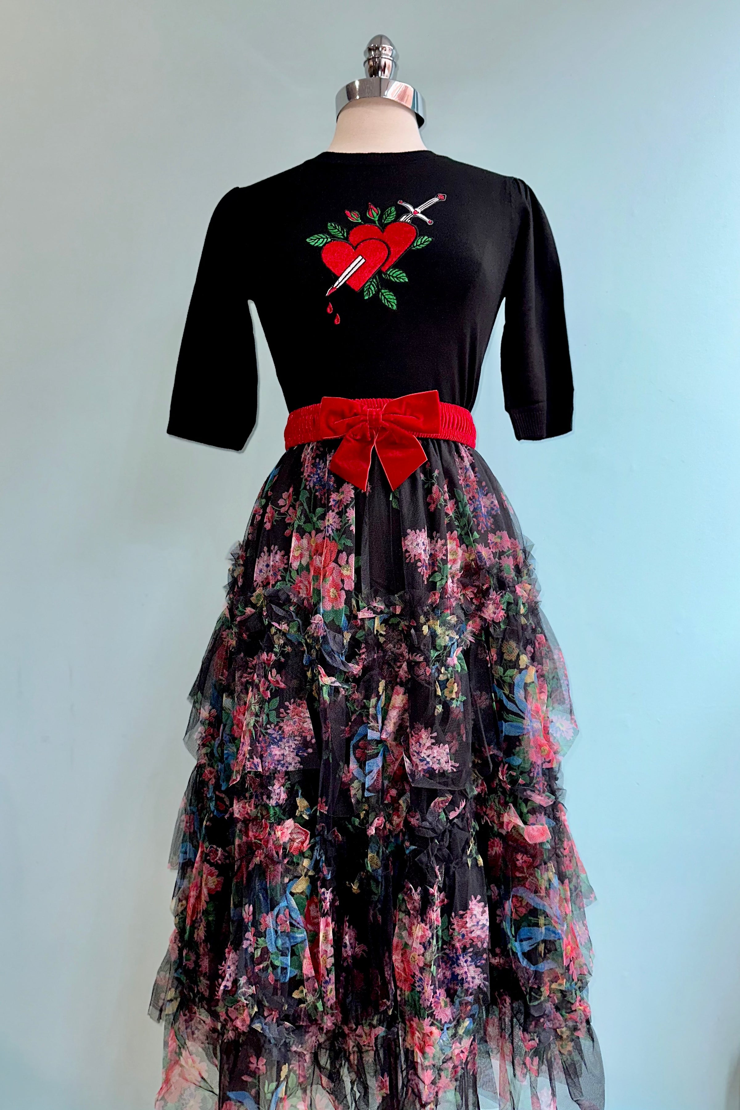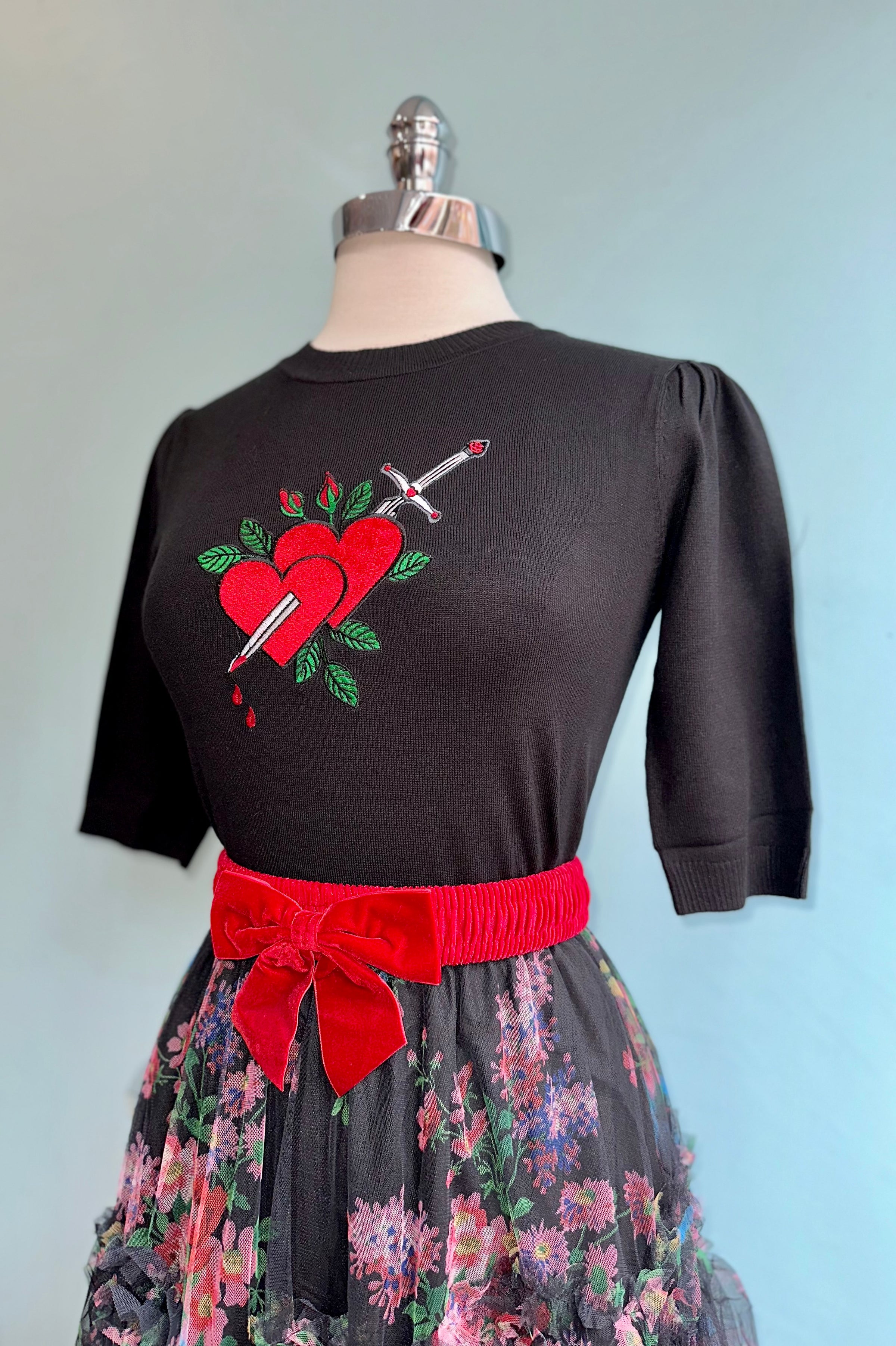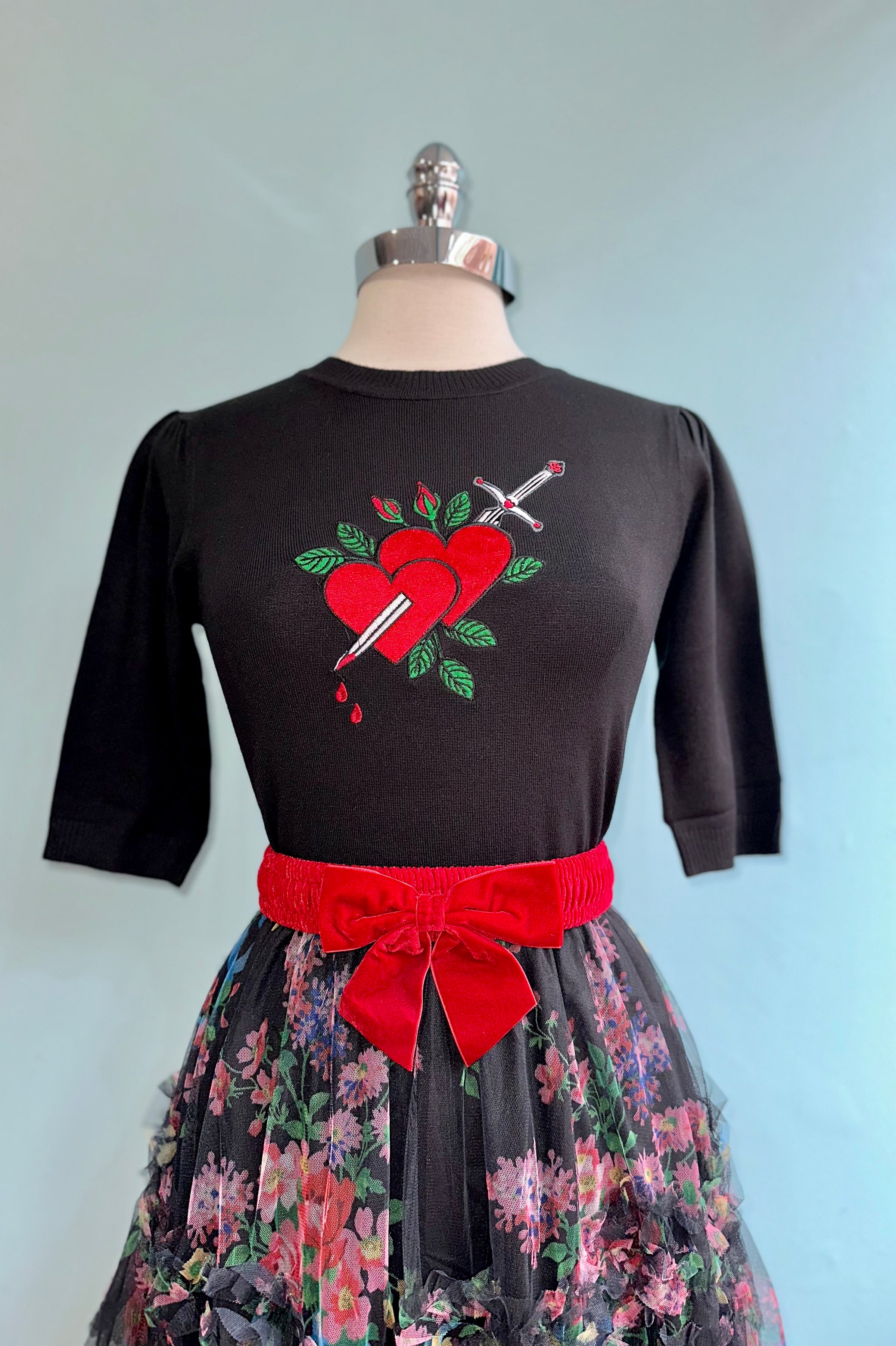 Heart and Dagger Embroidered Pullover Sweater in Black by Voodoo Vixen