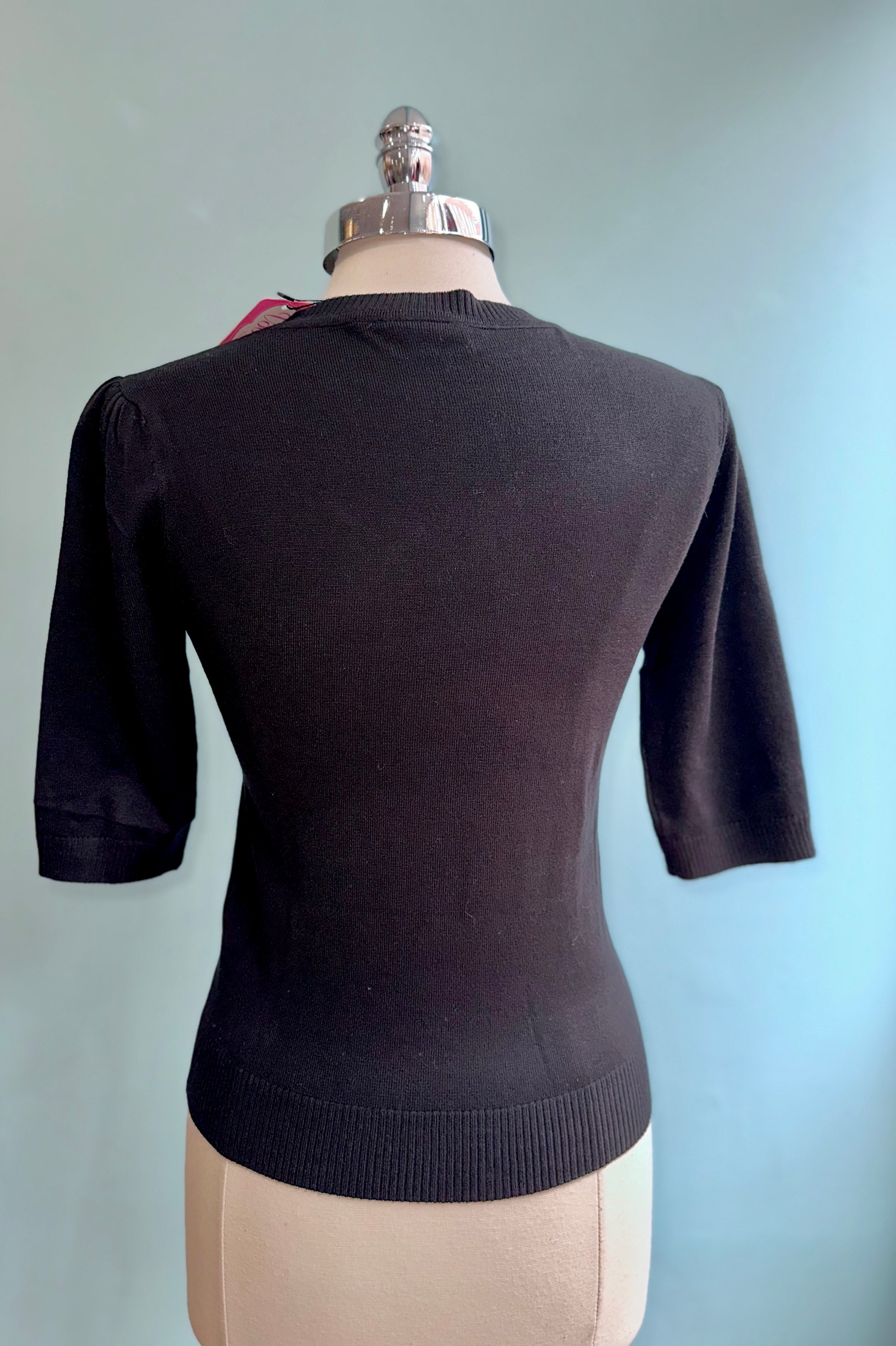 Crewneck black sweater with three quarter length sleeves and an heart and dagger on the venter front bodice. The body is a fitted and made of fine, soft fabric.