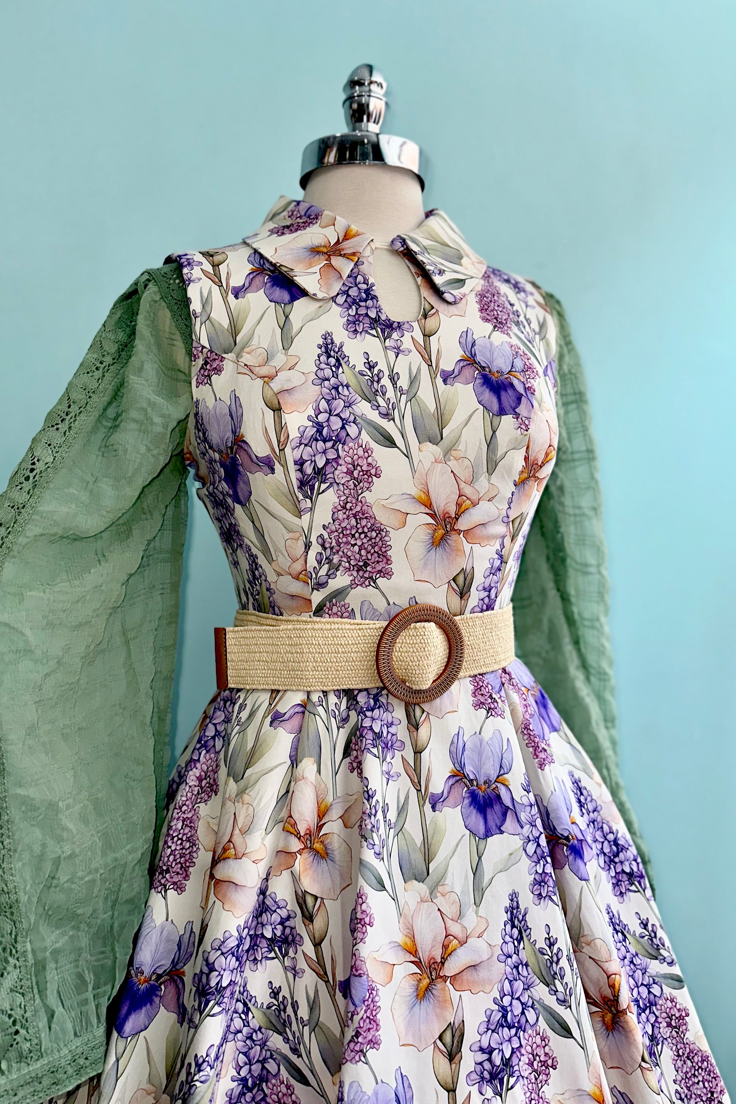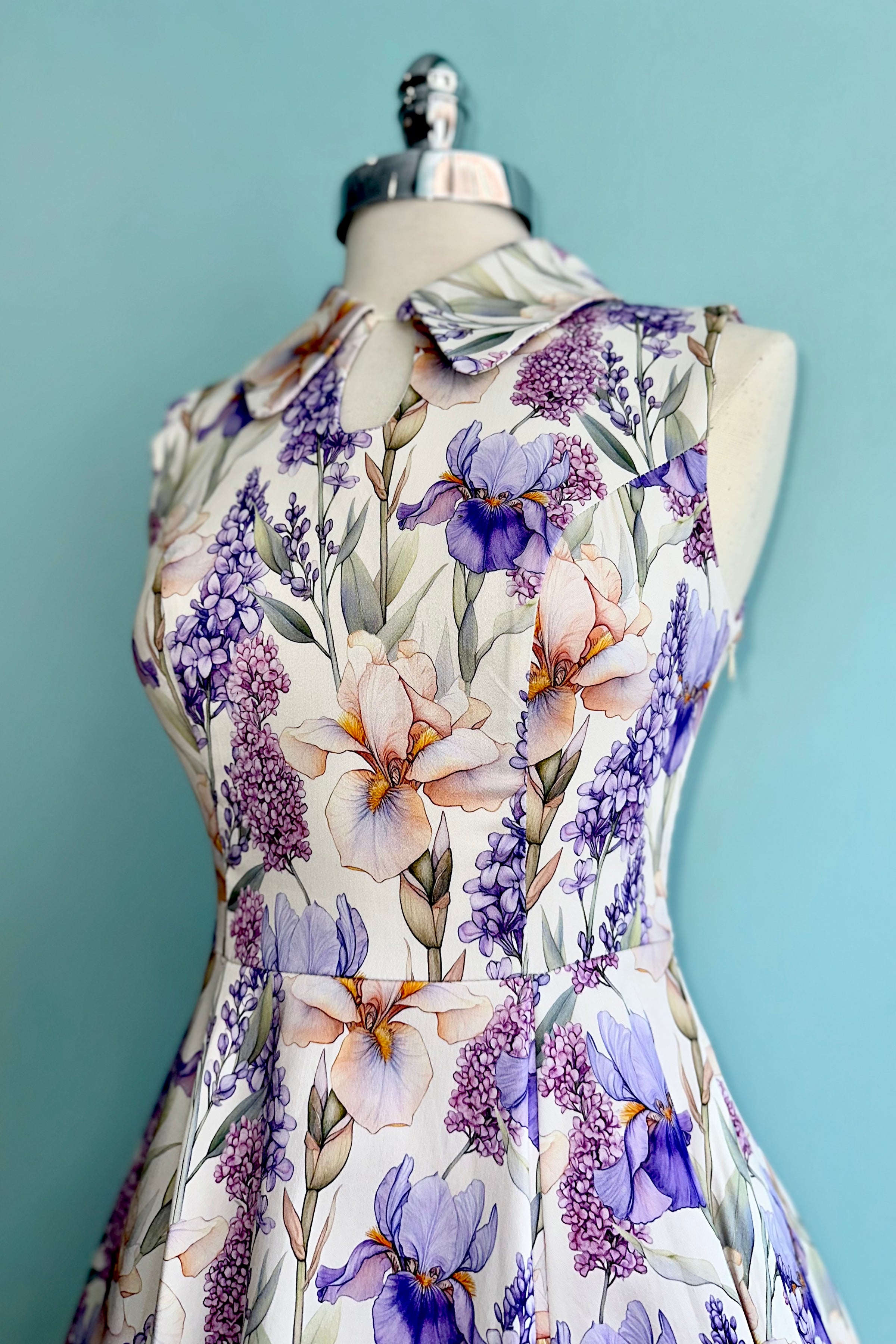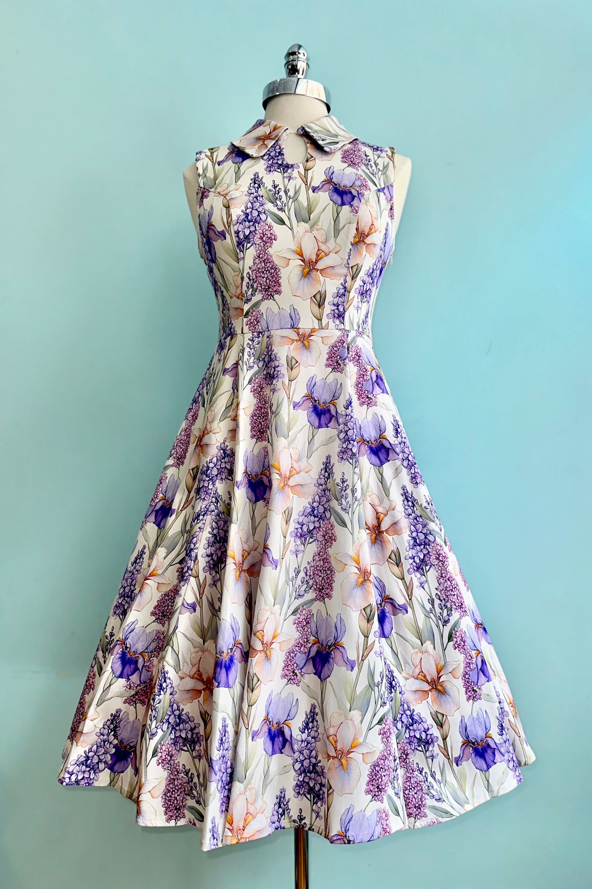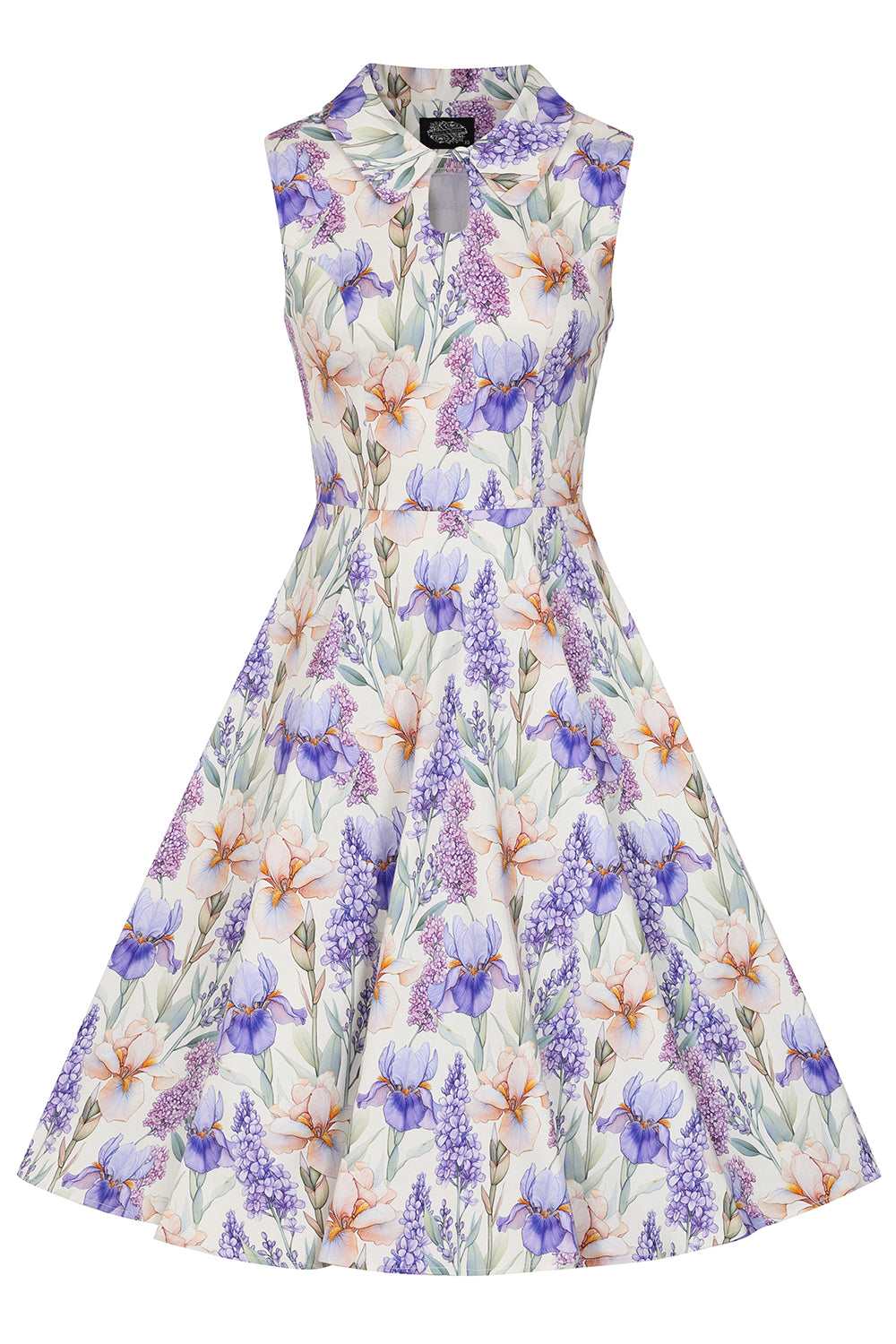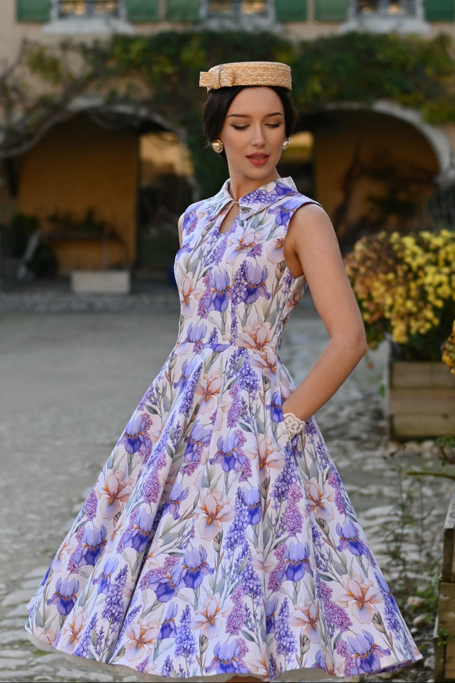 A sleeveless ivory dress adorned with cascading blooms in lavender, lilac, and warm peach tones. The classic shirt-style bodice features a pointed collar and a softly structured silhouette. The fitted waist flows into a full swing skirt with hidden side seam pockets. It is crafted in a lightweight breathable fabric that has a good amount of stretch. This dress is unlined and zips up the back.