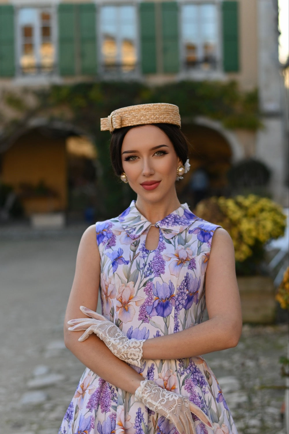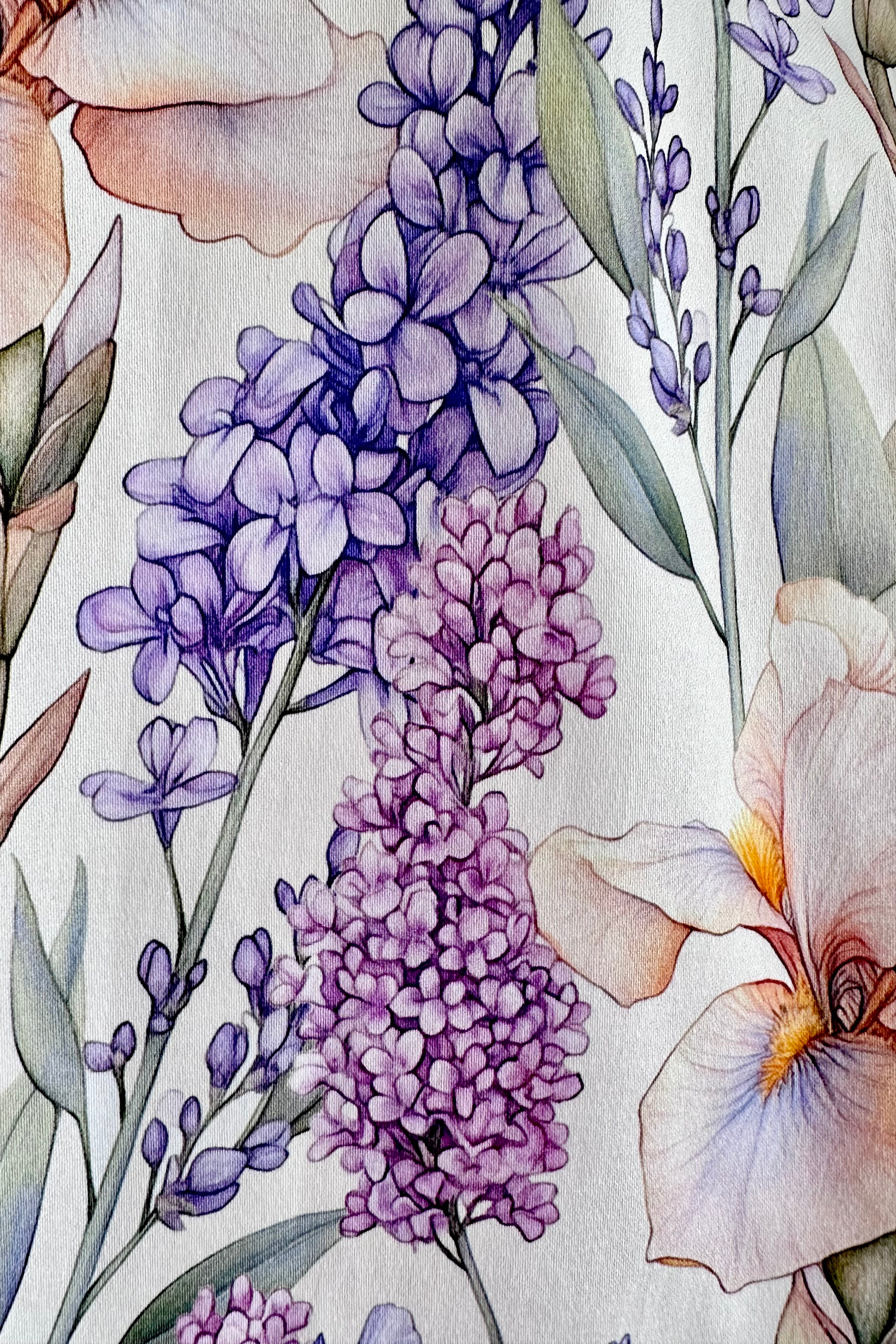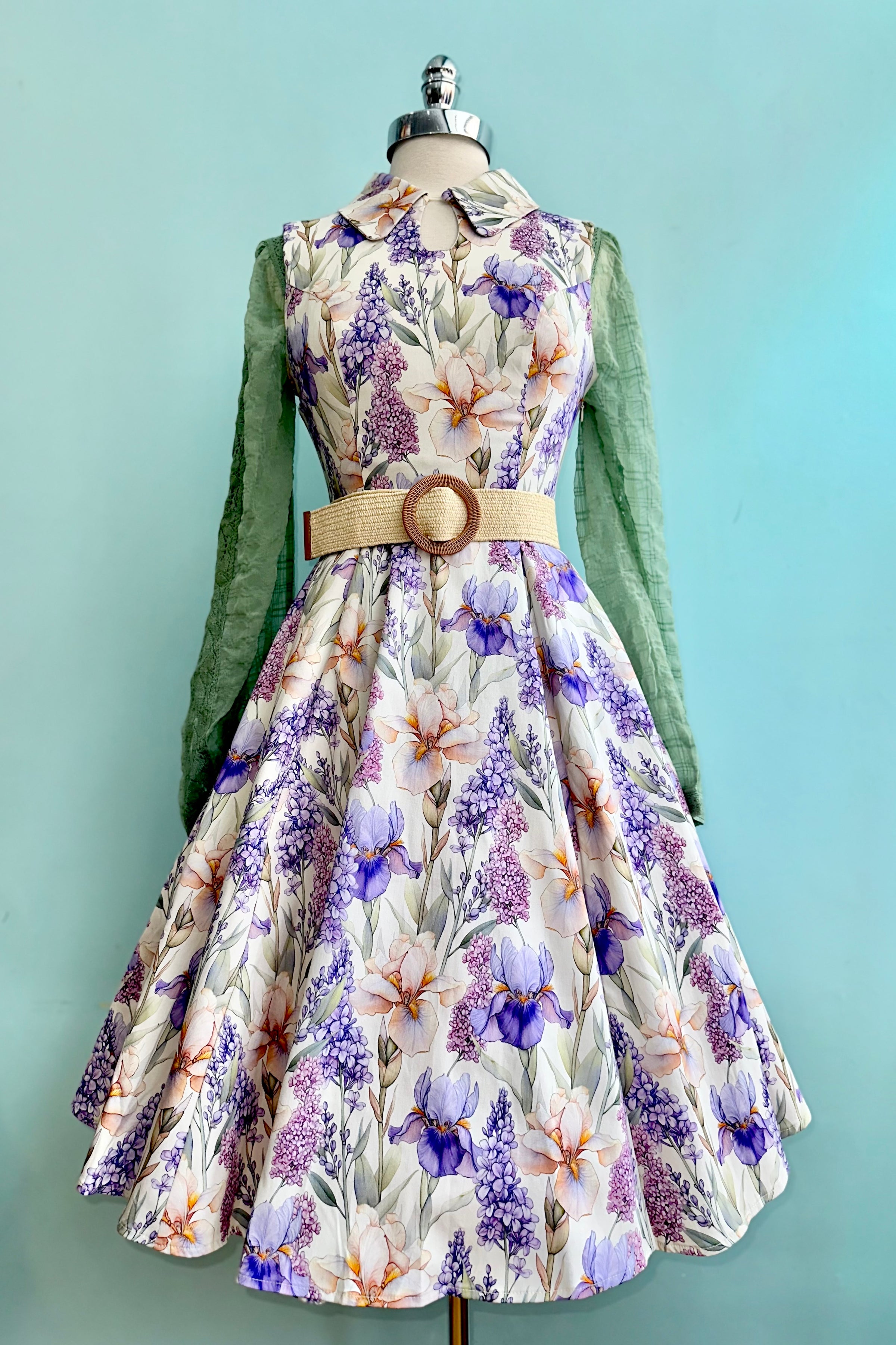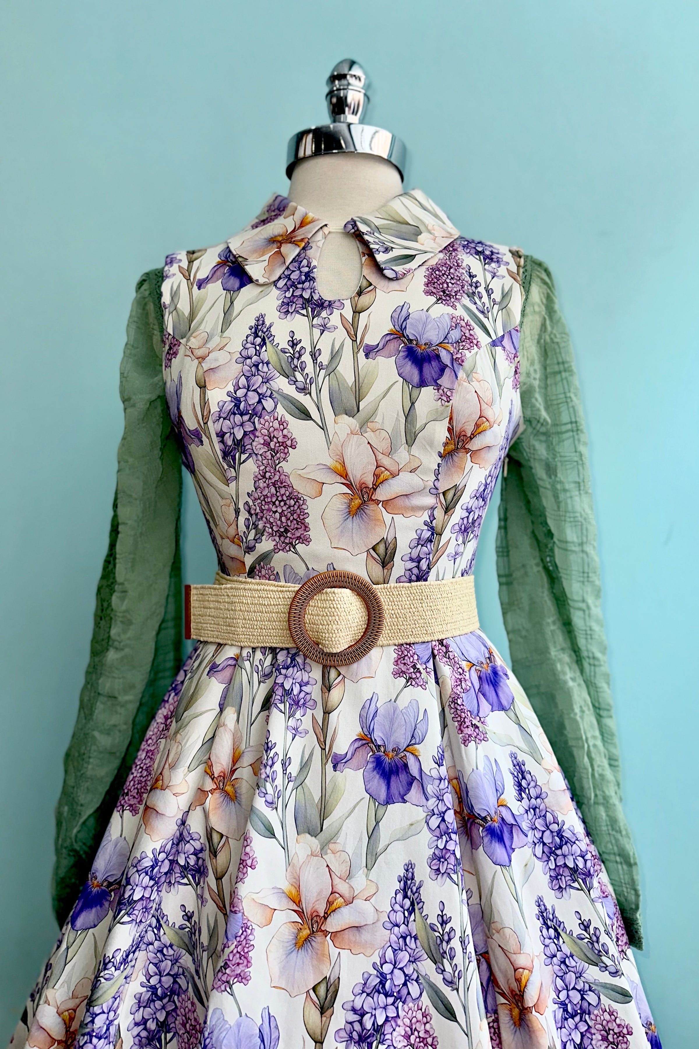 A sleeveless ivory dress adorned with cascading blooms in lavender, lilac, and warm peach tones. The classic shirt-style bodice features a pointed collar and a softly structured silhouette. The fitted waist flows into a full swing skirt with hidden side seam pockets. It is crafted in a lightweight breathable fabric that has a good amount of stretch. This dress is unlined and zips up the back.