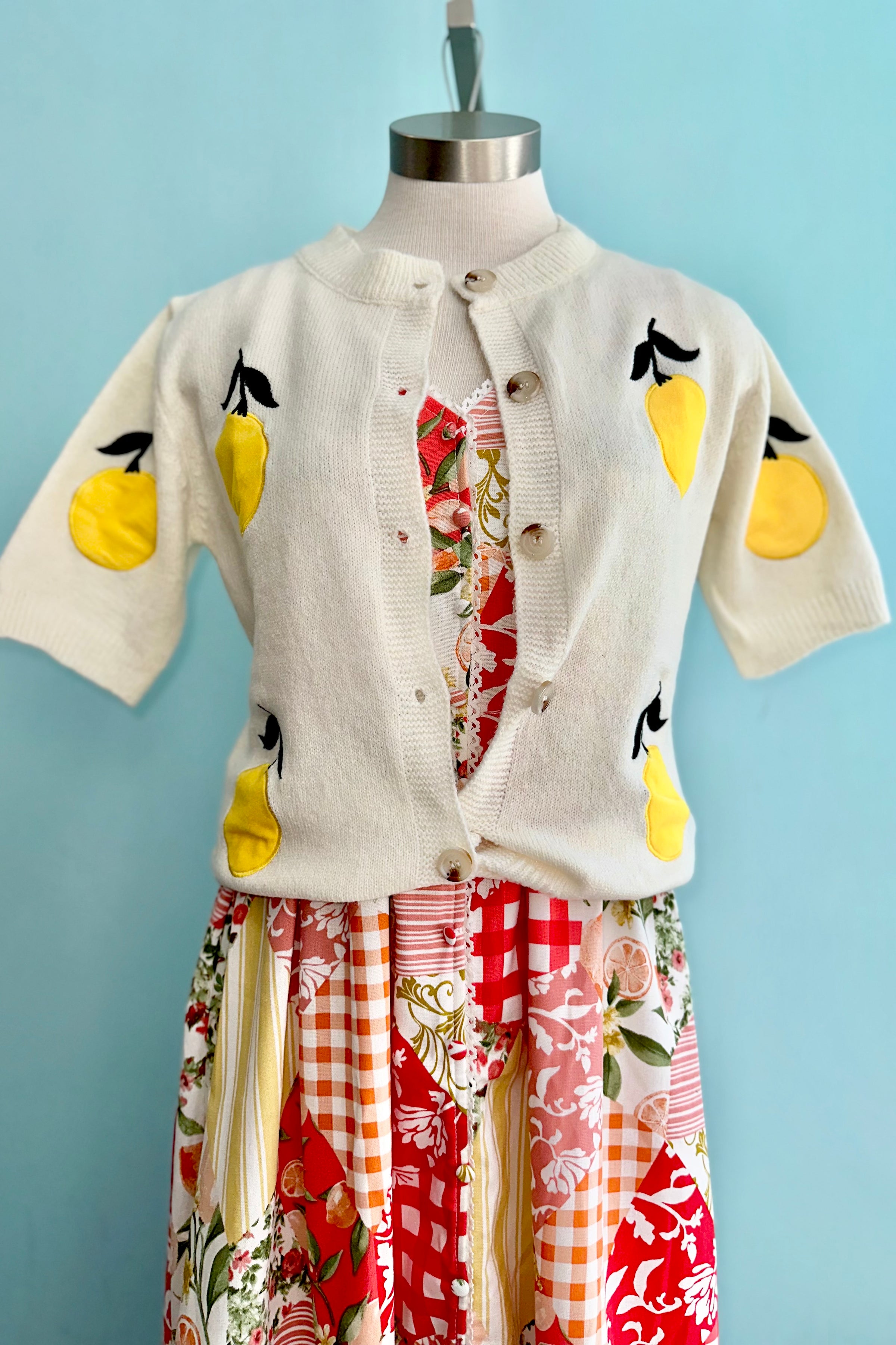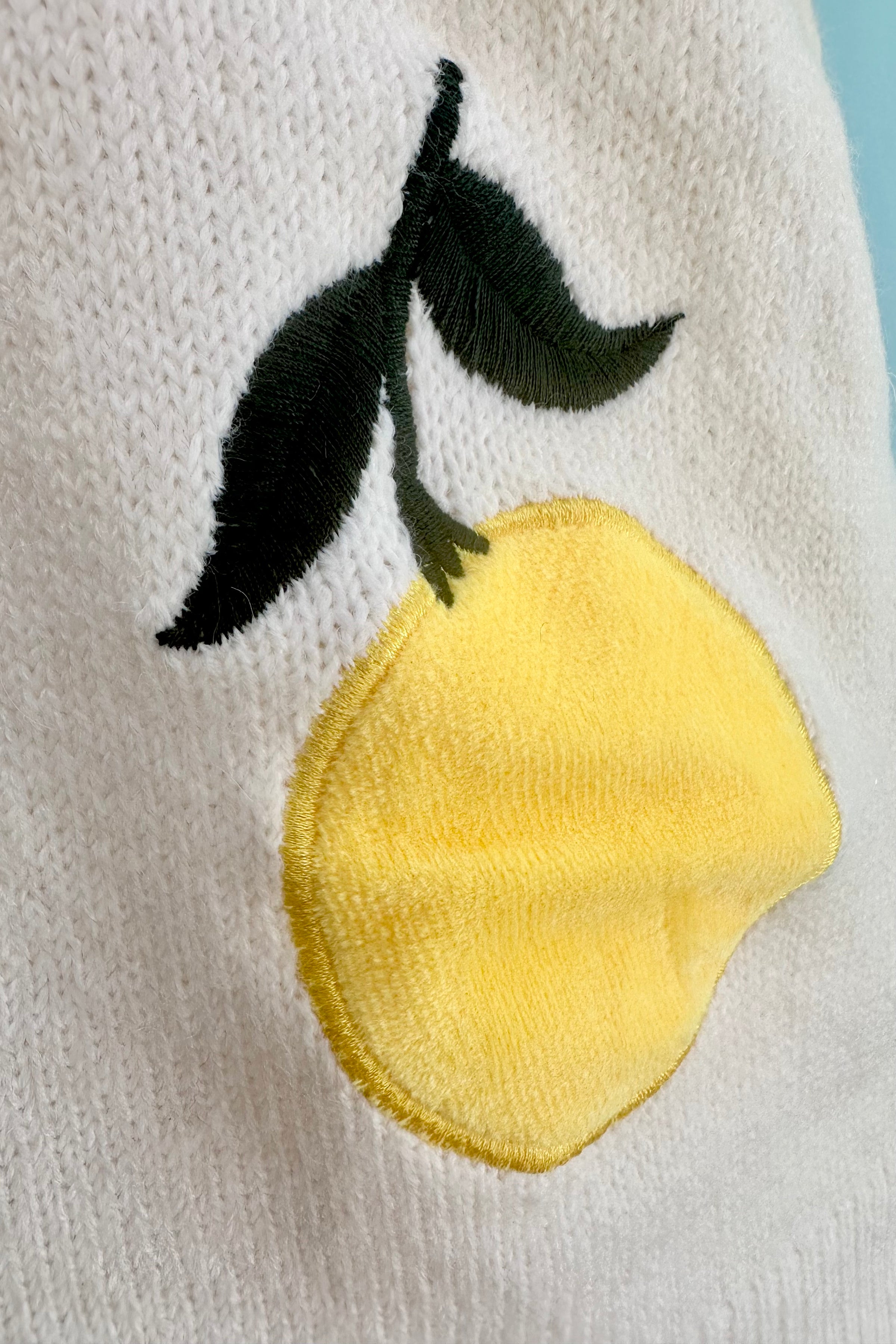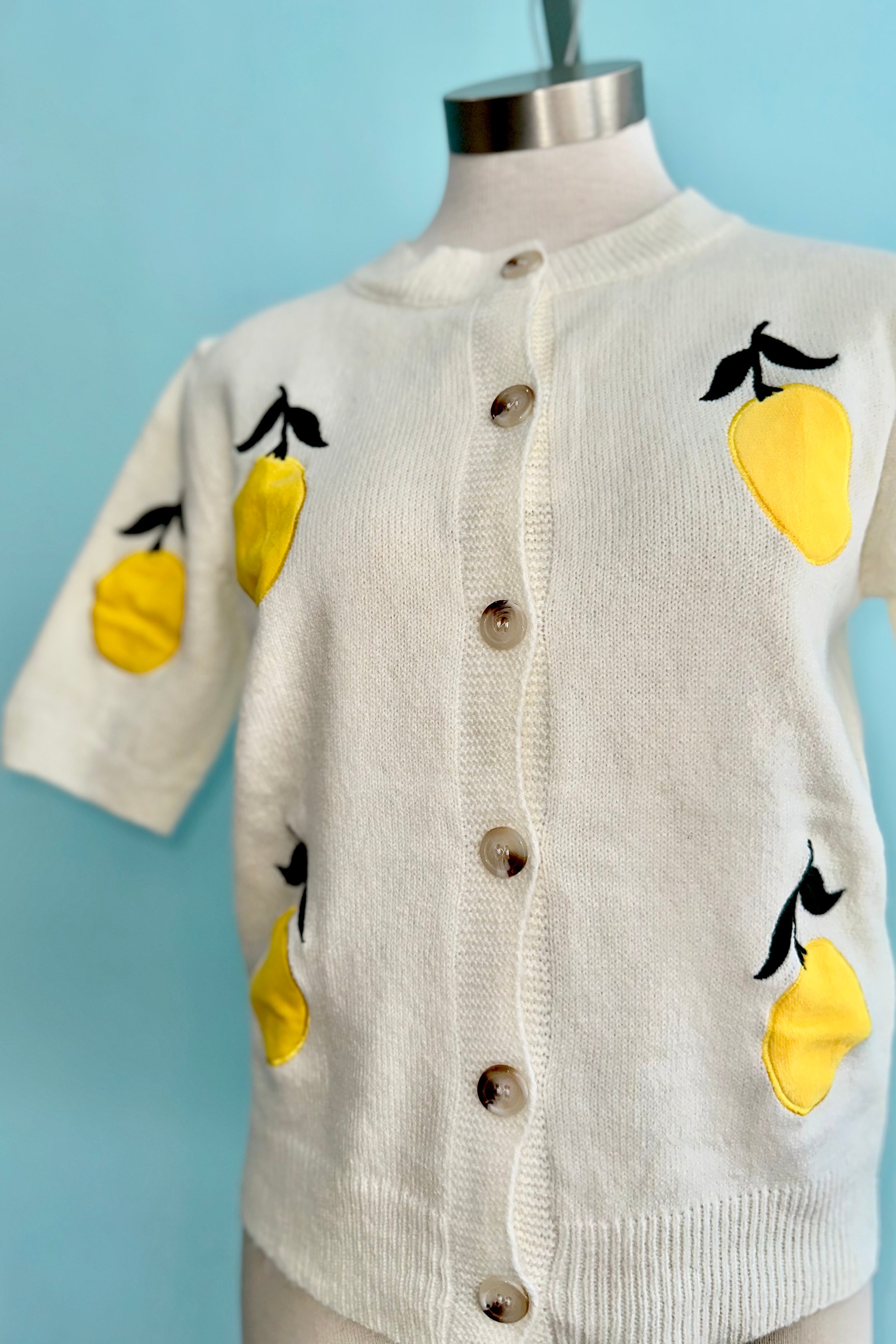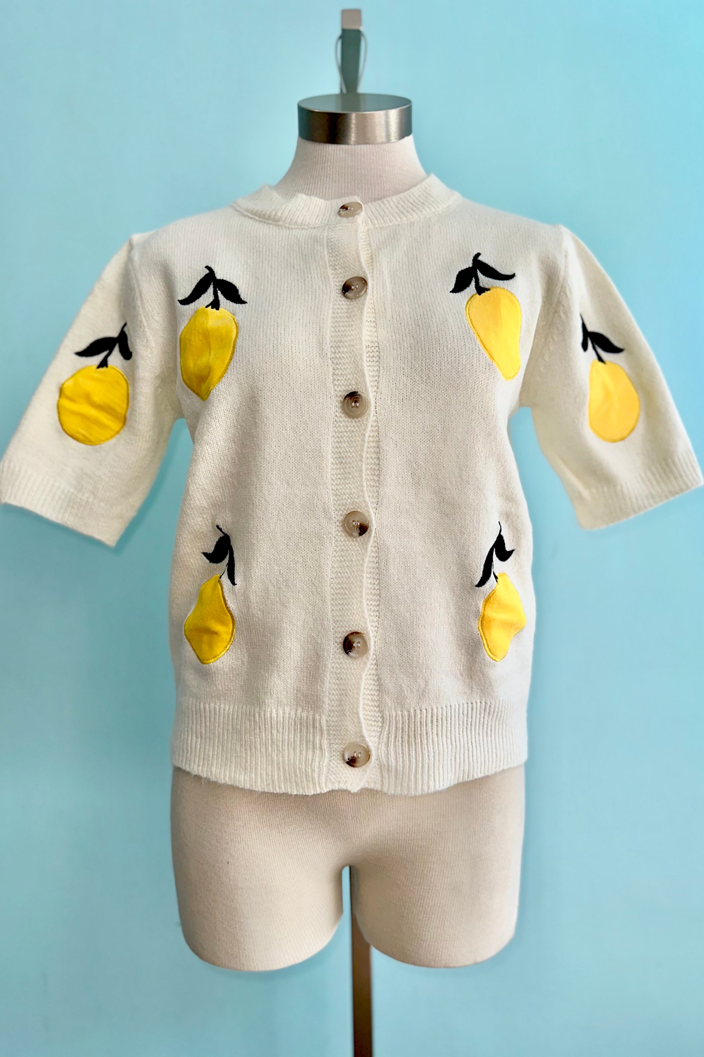Short sleeve sweater with velvet lemon appliques. This sweater has a button front and rounded neck.