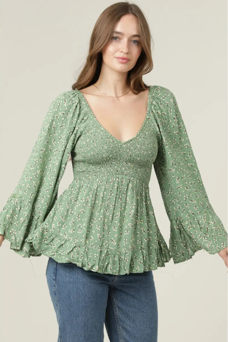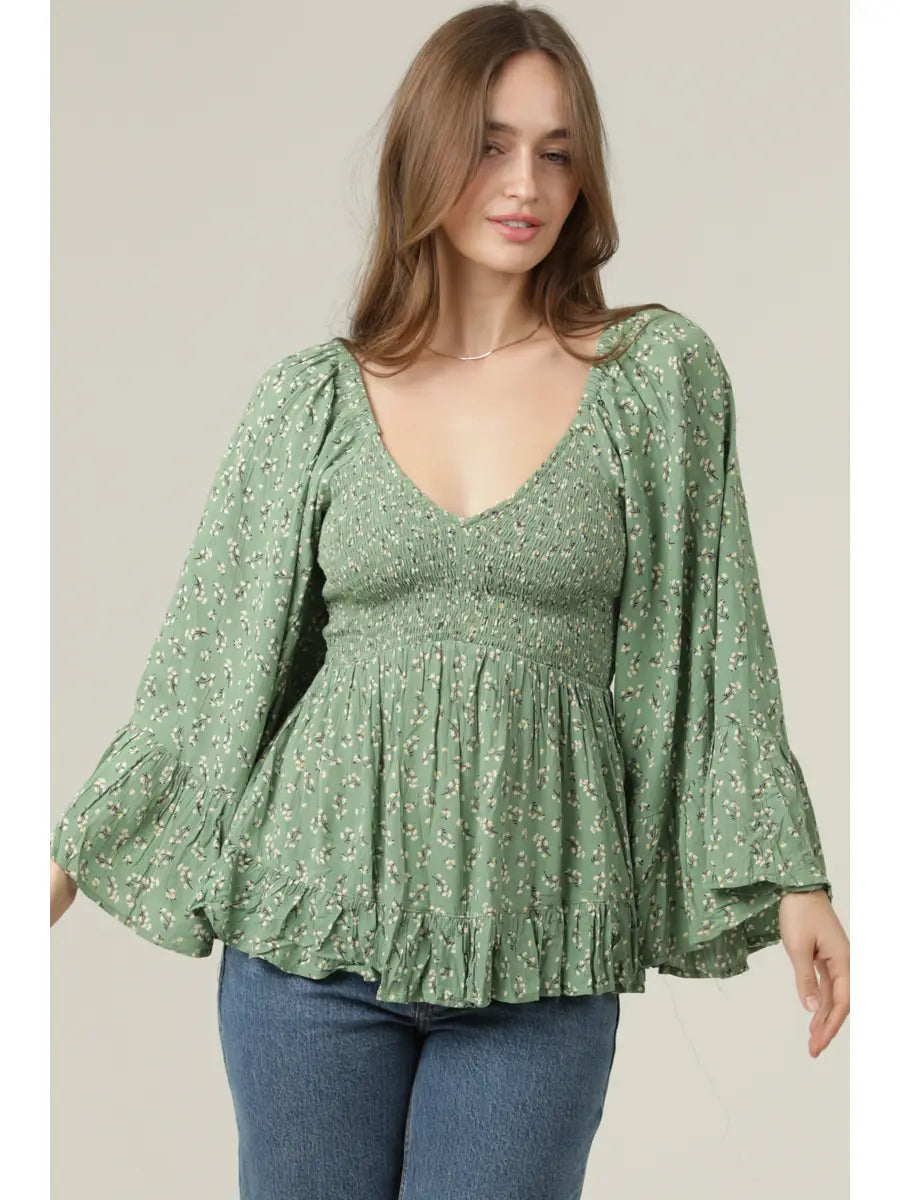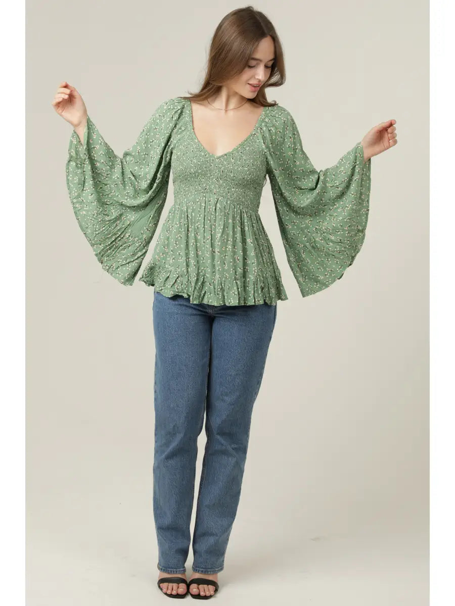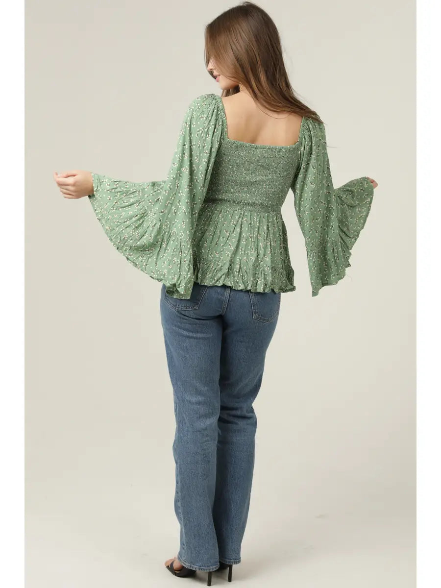 Bell sleeve top in light green with a floral print. This top has a fully smocked bodice with an empire waist. The front has a V-neckline and a square back.