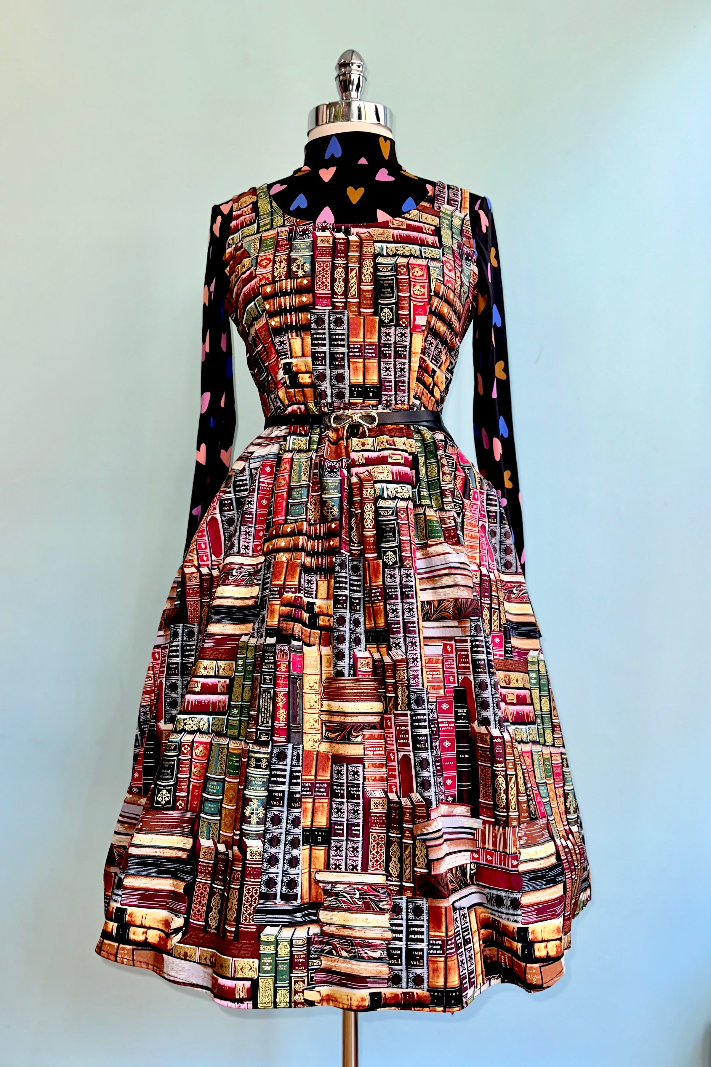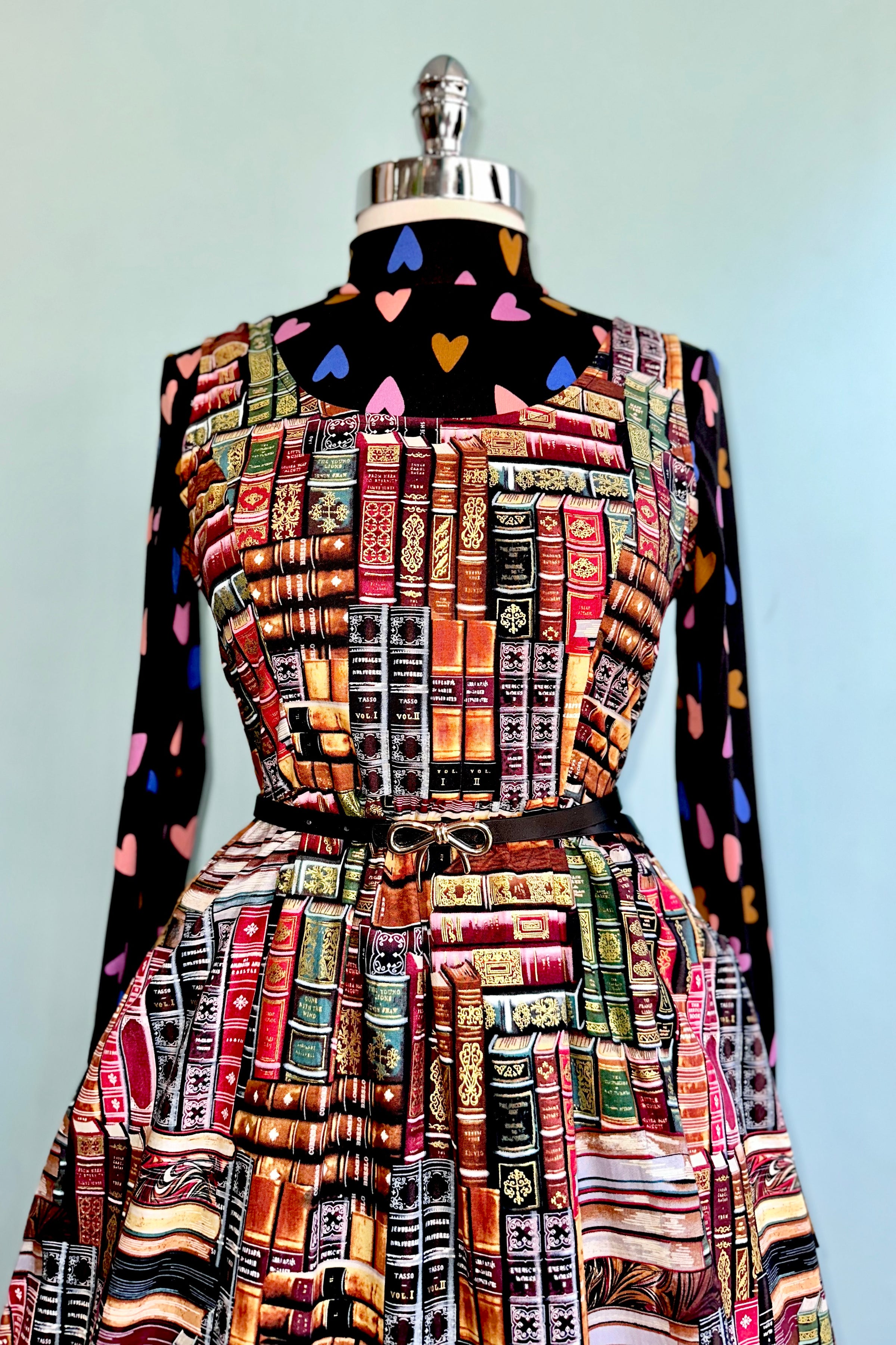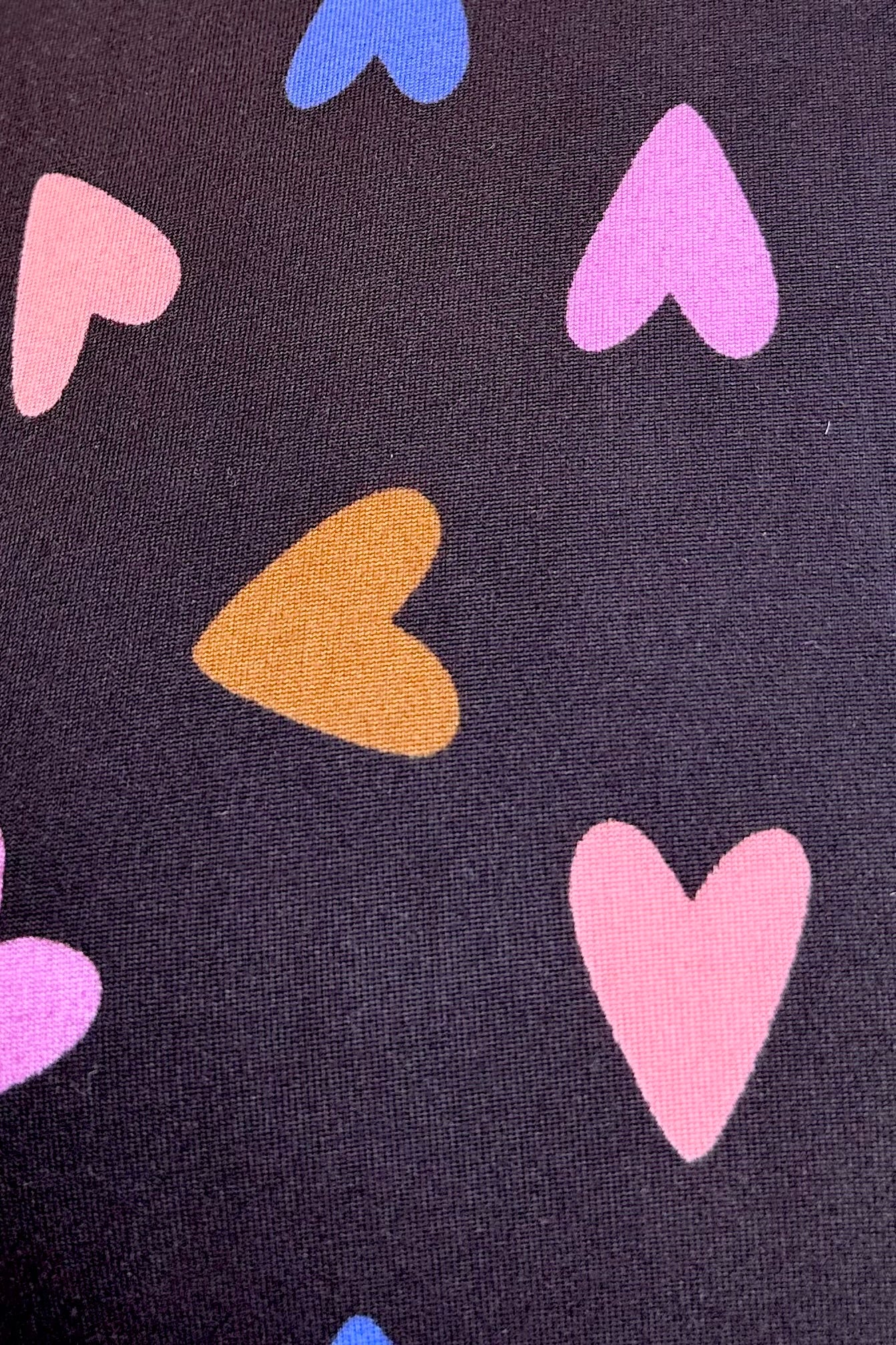 Long sleeve mock neck t-shirt top in black with pink, blue and brown hearts. This is a fitted style.